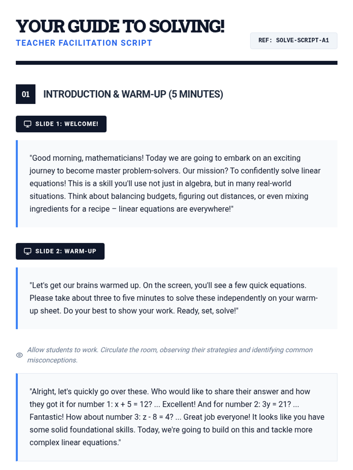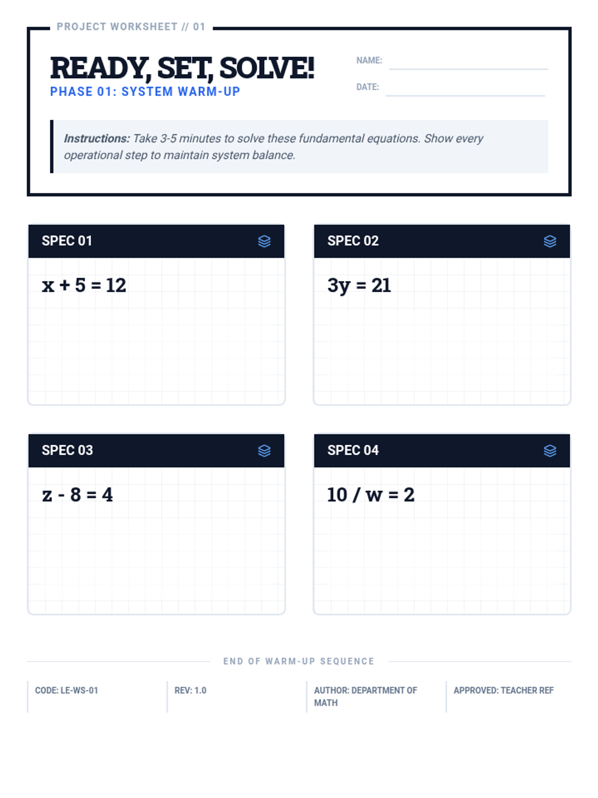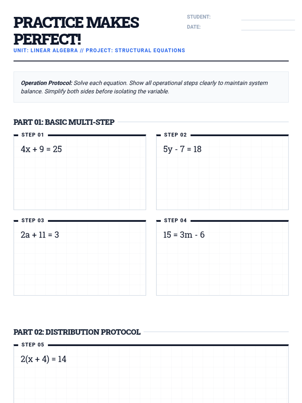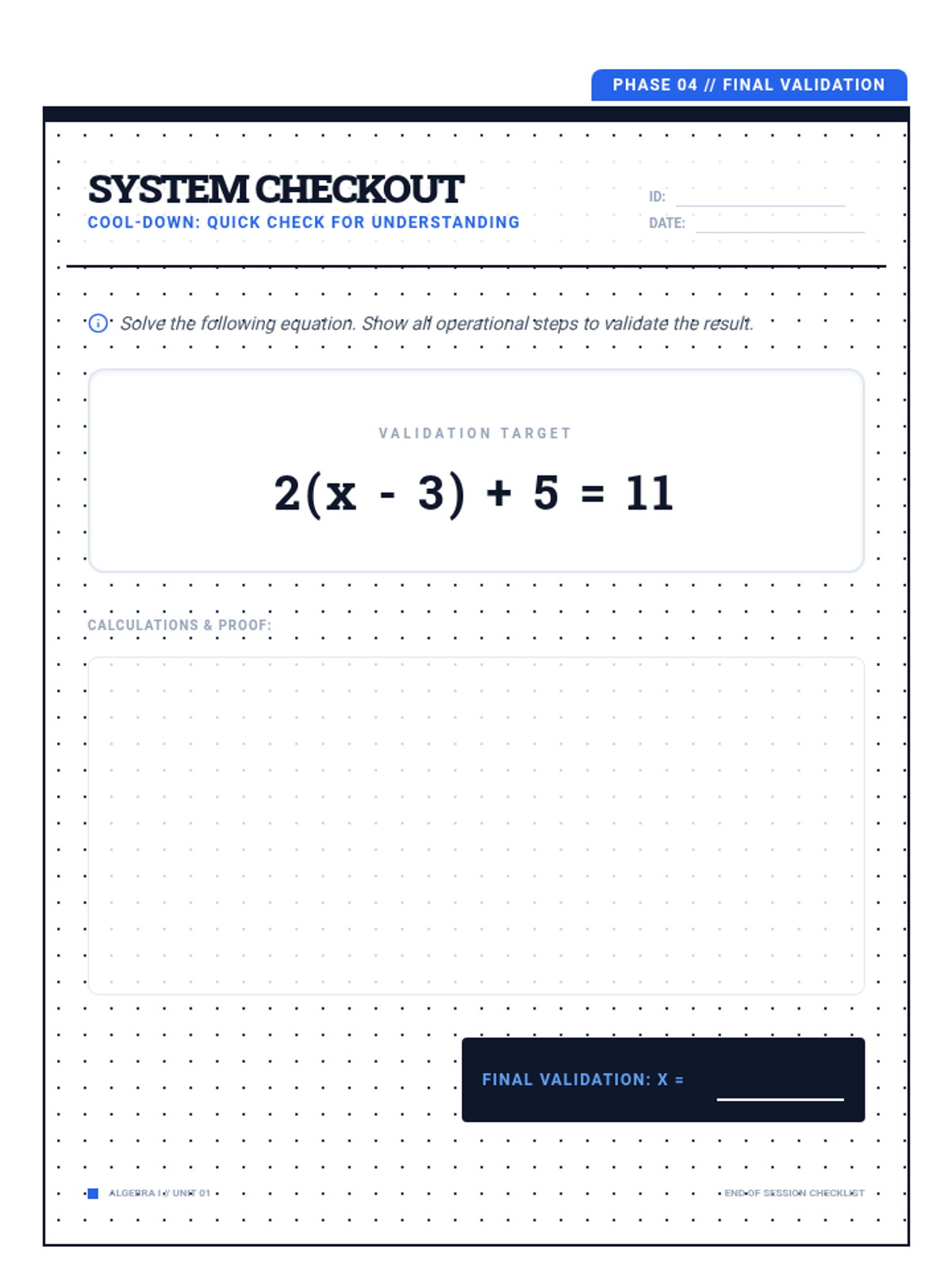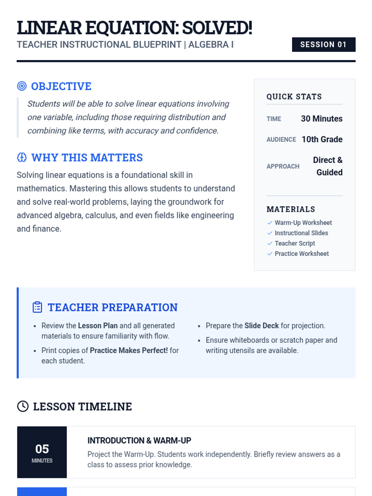 A comprehensive 30-minute lesson for 10th-grade students on solving linear equations involving distribution and combining like terms using a blueprint-inspired technical theme.