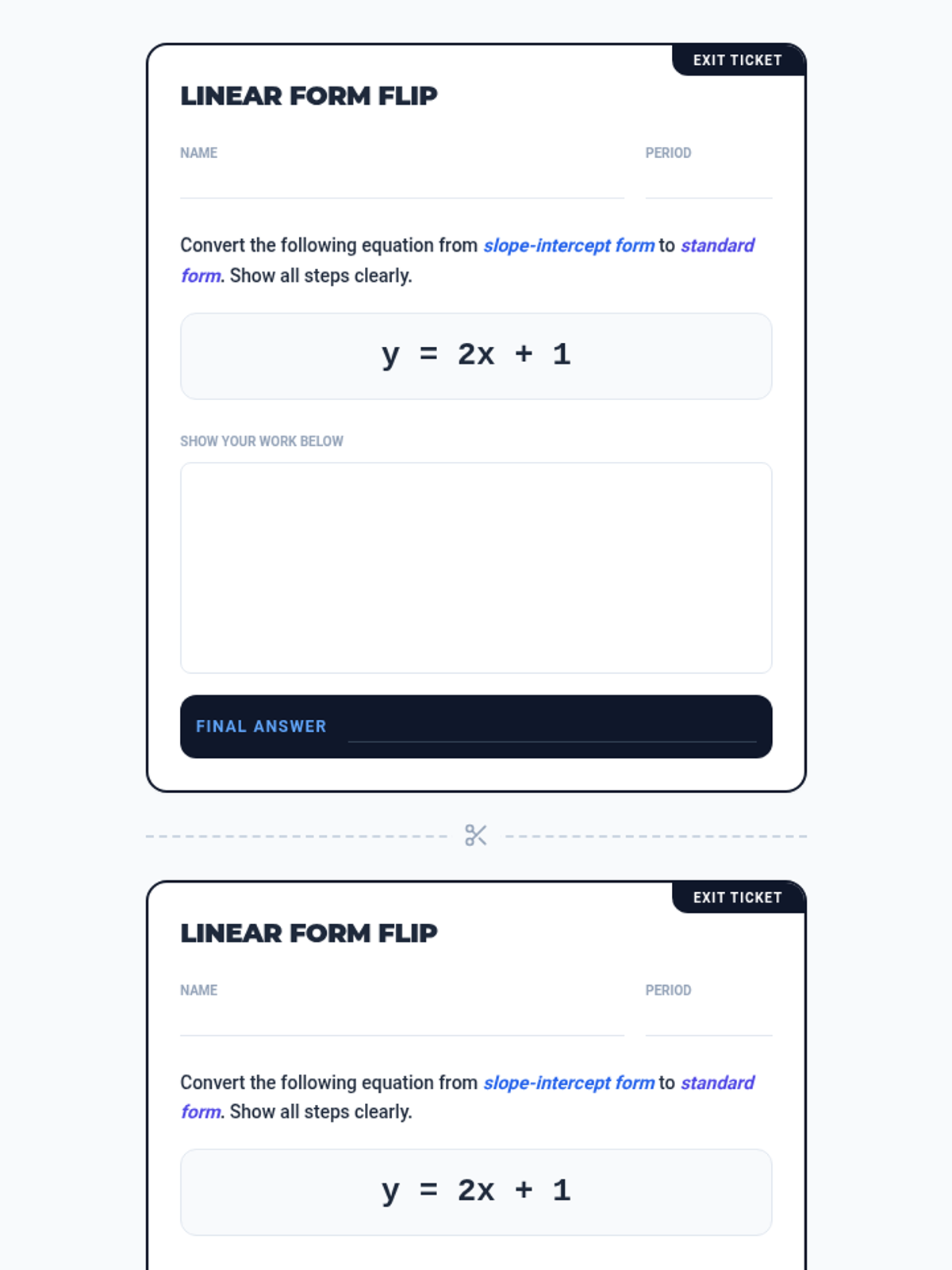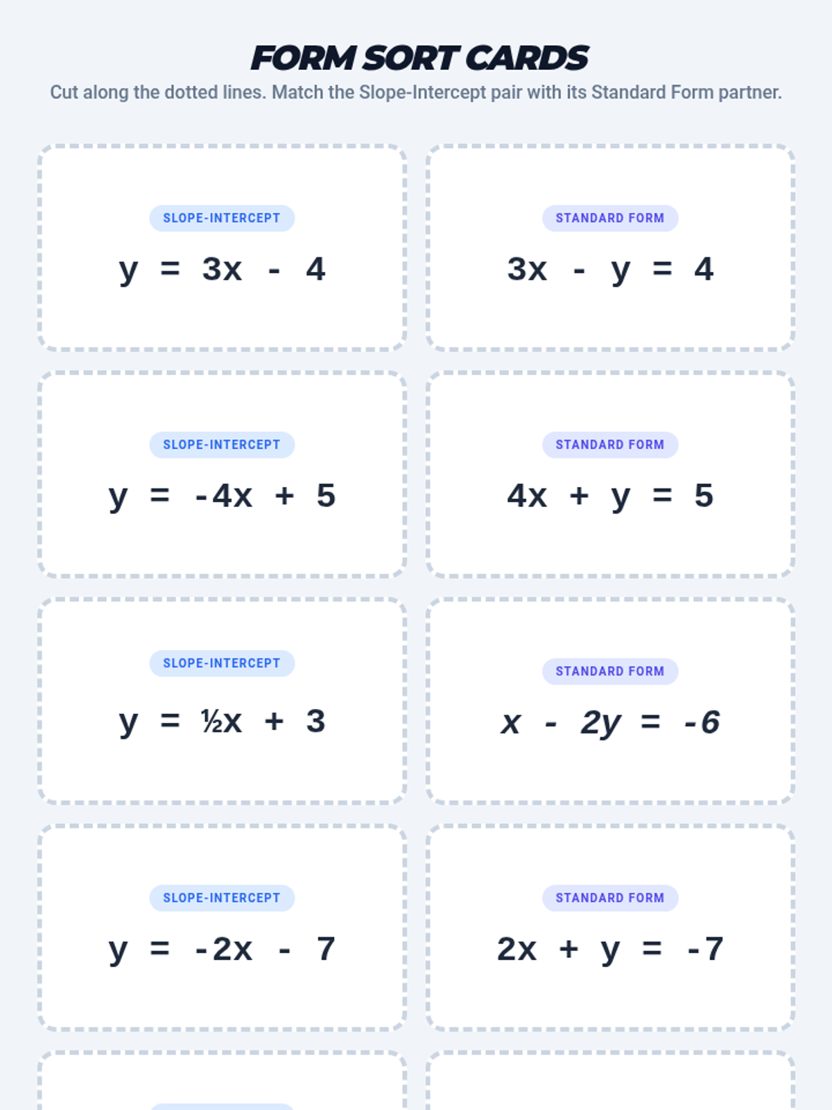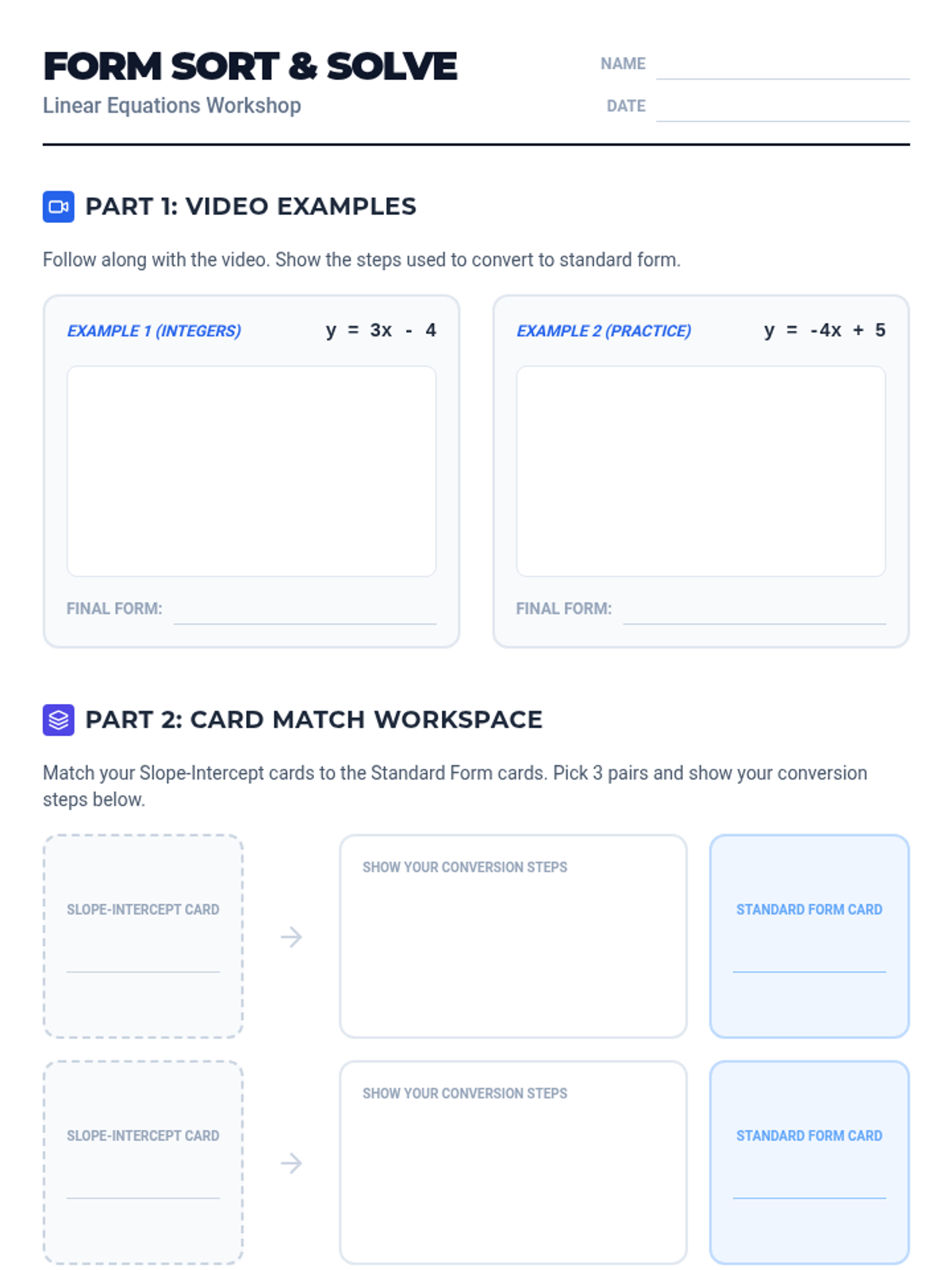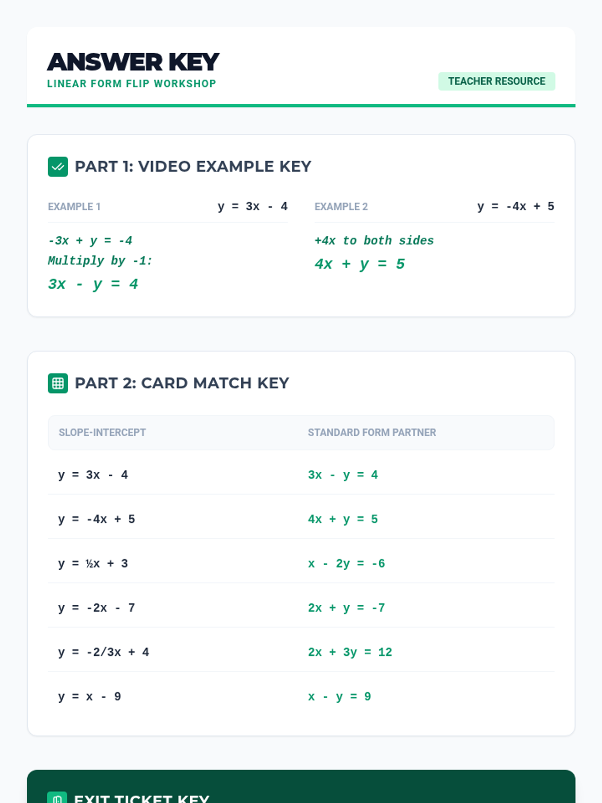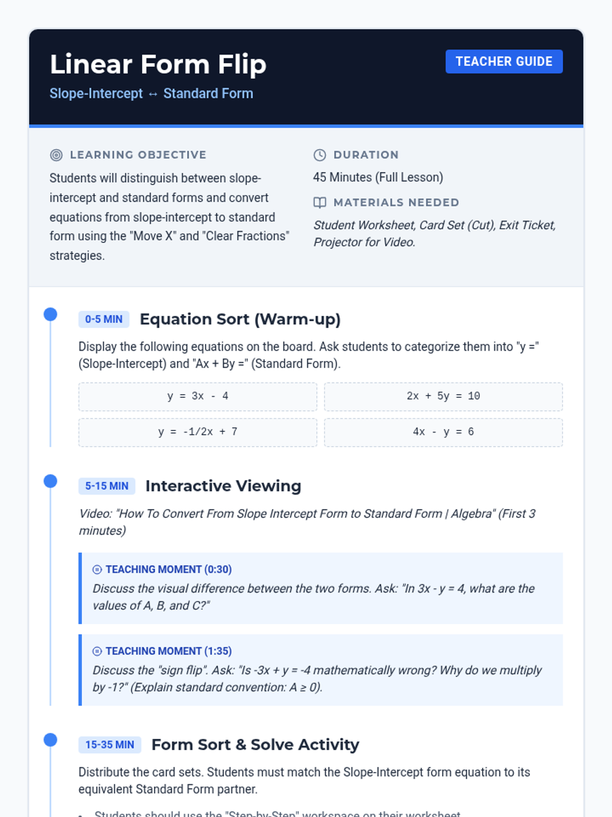 A comprehensive lesson for 8th-grade math students focusing on identifying and converting between slope-intercept ($y = mx + b$) and standard ($Ax + By = C$) linear forms. Includes a structured lesson plan, a multi-part student worksheet with a card-sorting activity, and a quick-check exit ticket.