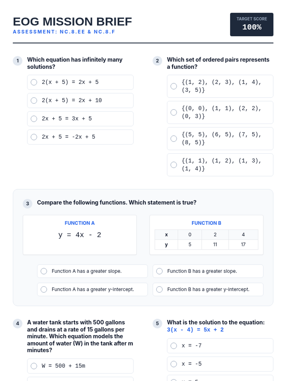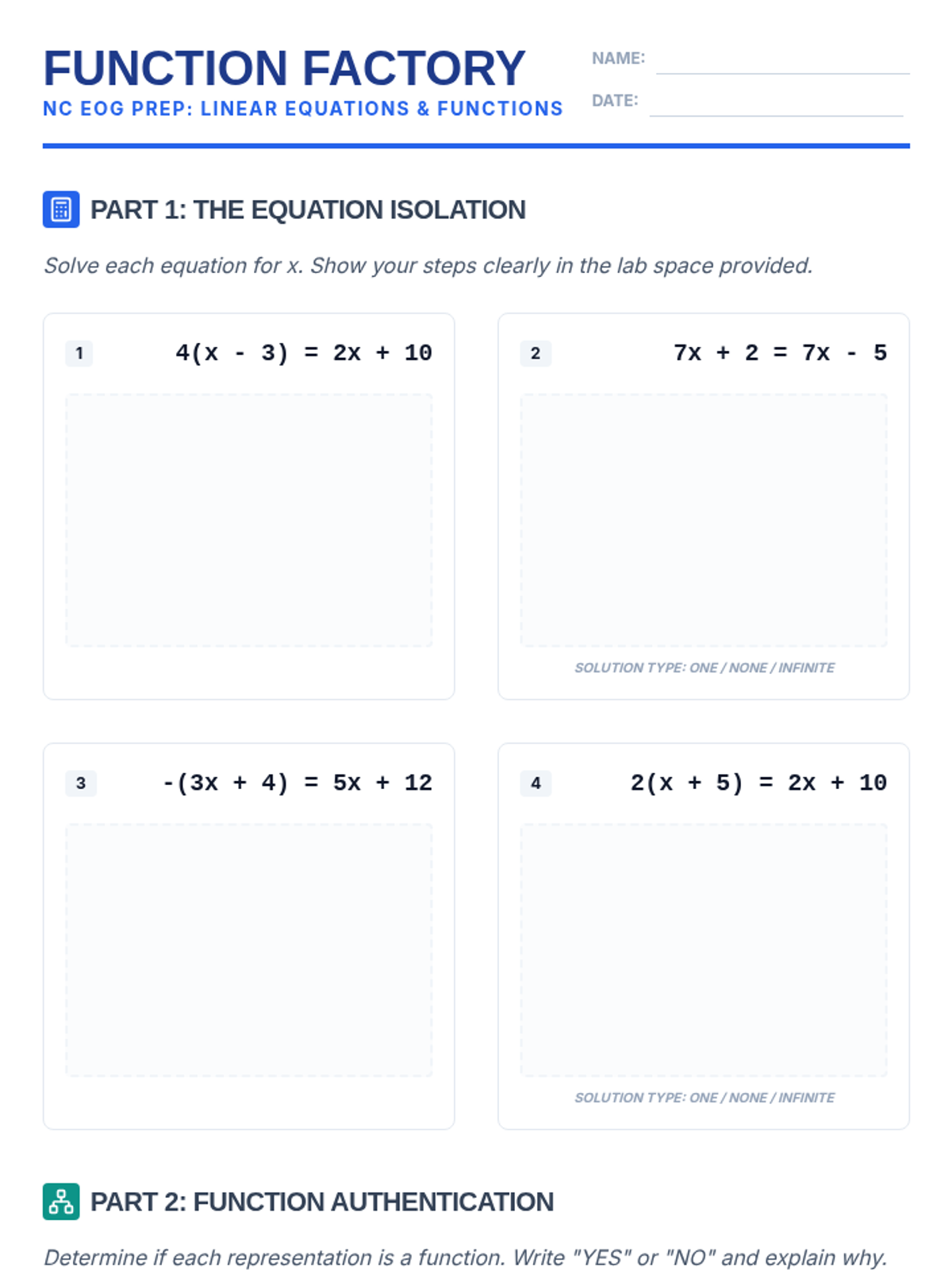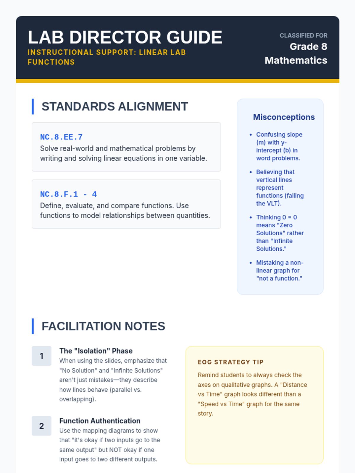 A comprehensive 8th-grade math lesson focused on solving linear equations, understanding functions, and modeling real-world relationships, specifically aligned to NC Standard Course of Study for EOG preparation.