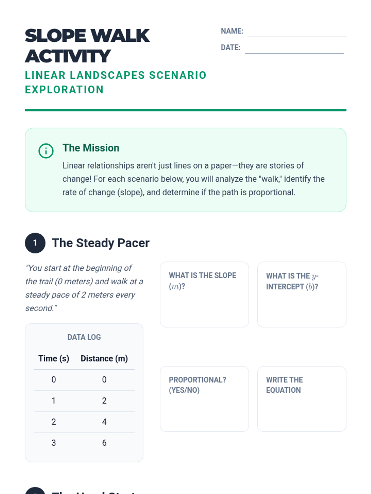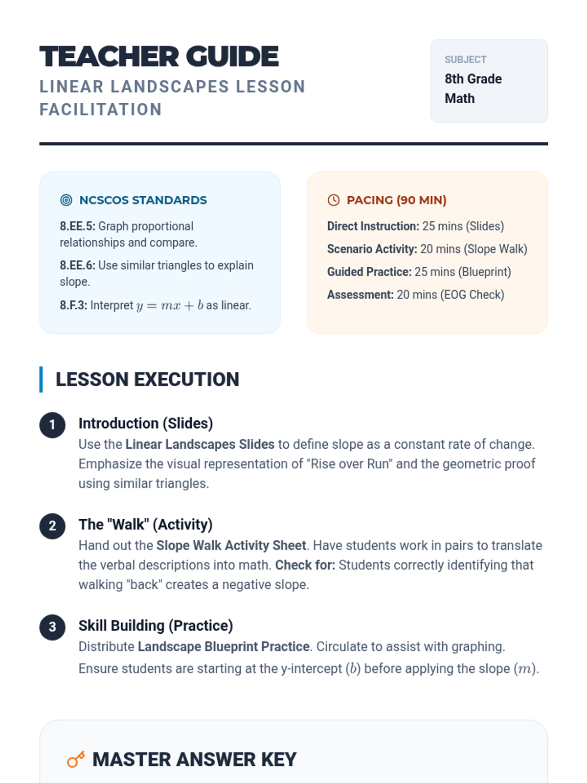 A comprehensive Grade 8 math lesson on linear relationships, covering slope, y-intercept, and graphing equations in slope-intercept form, aligned to NCSCOS standards.