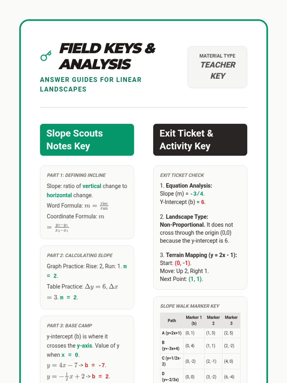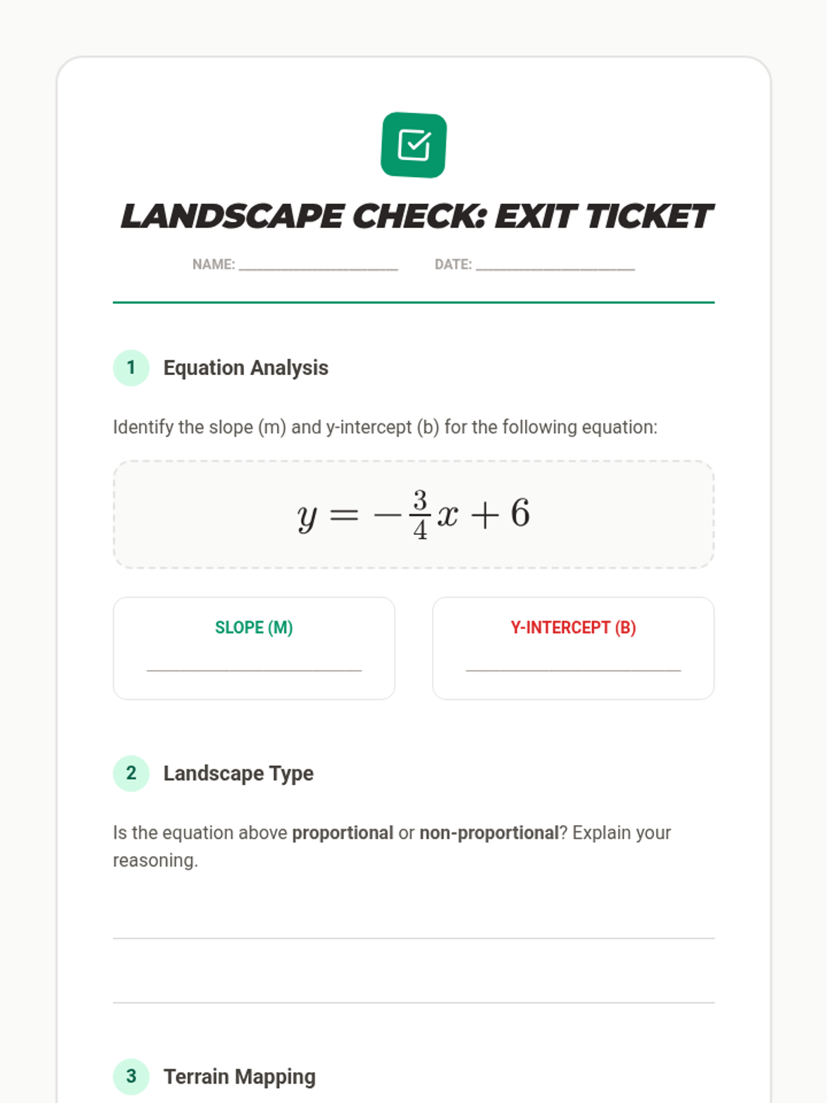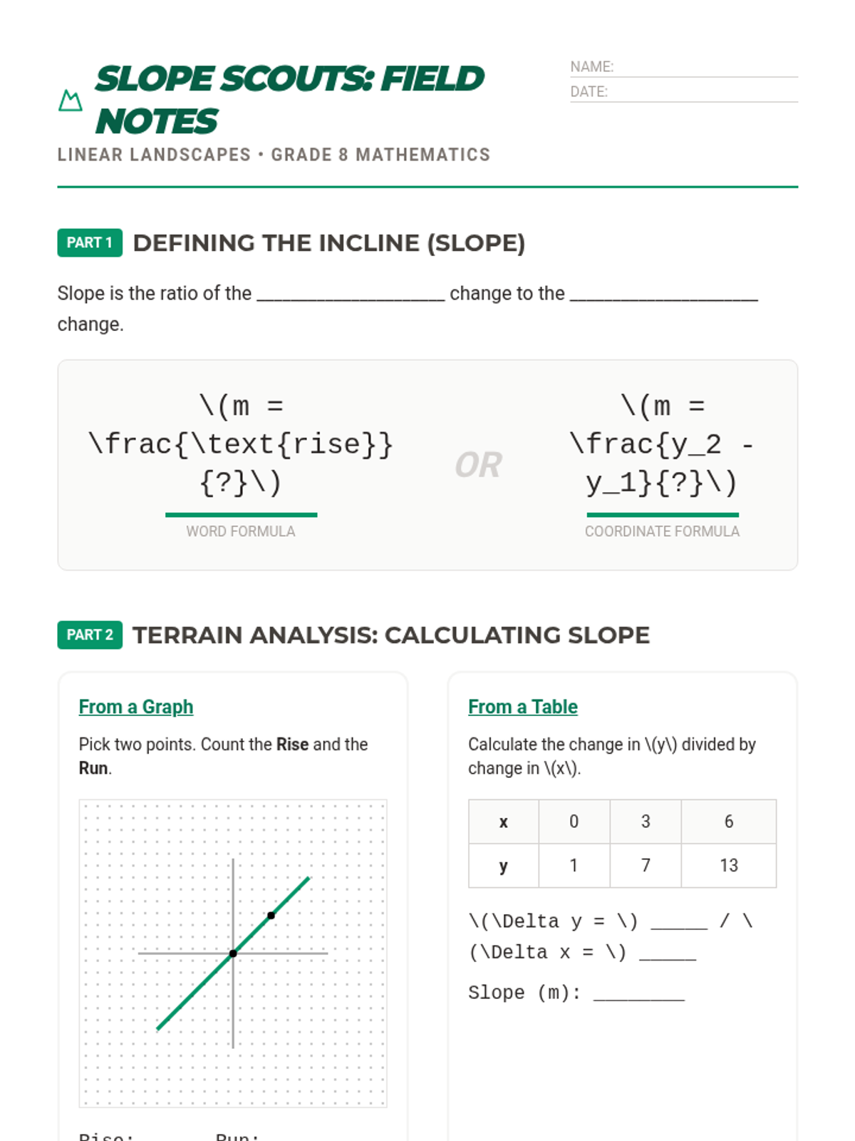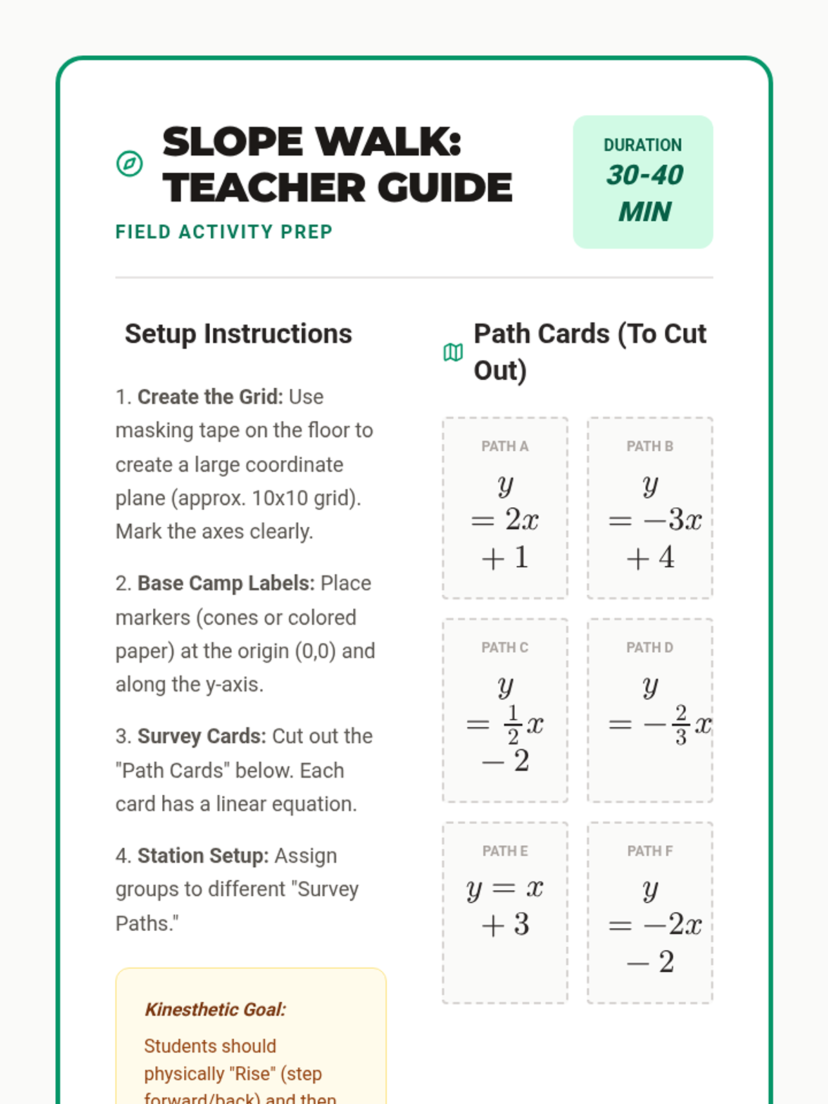 A comprehensive Grade 8 math lesson on linear relationships, covering slope, y-intercept, and graphing. Students explore proportional and non-proportional relationships through a 'Slope Walk' hands-on activity and surveyor-themed practice.