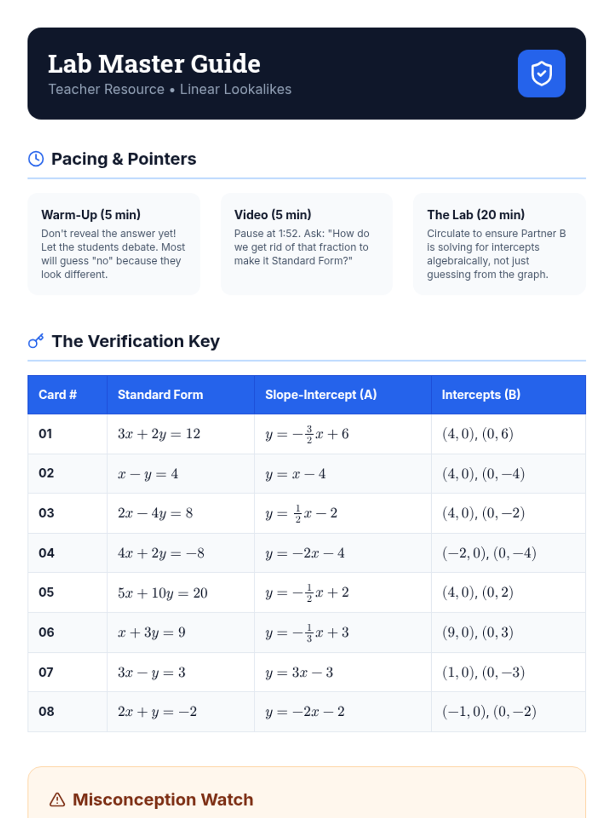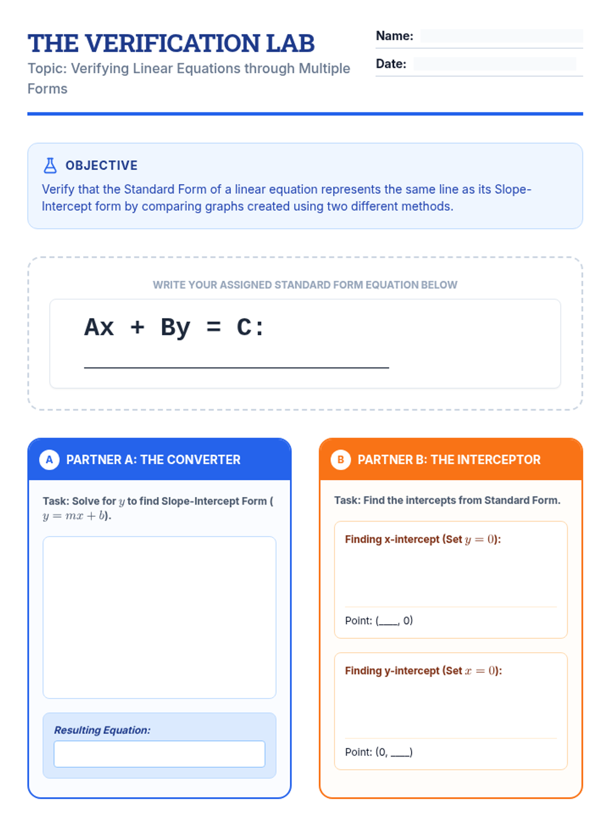 Students will investigate and verify that different linear equation forms represent the identical line through algebraic manipulation and coordinate graphing. The lesson culminates in 'The Verification Lab' where pairs compare standard and slope-intercept forms.