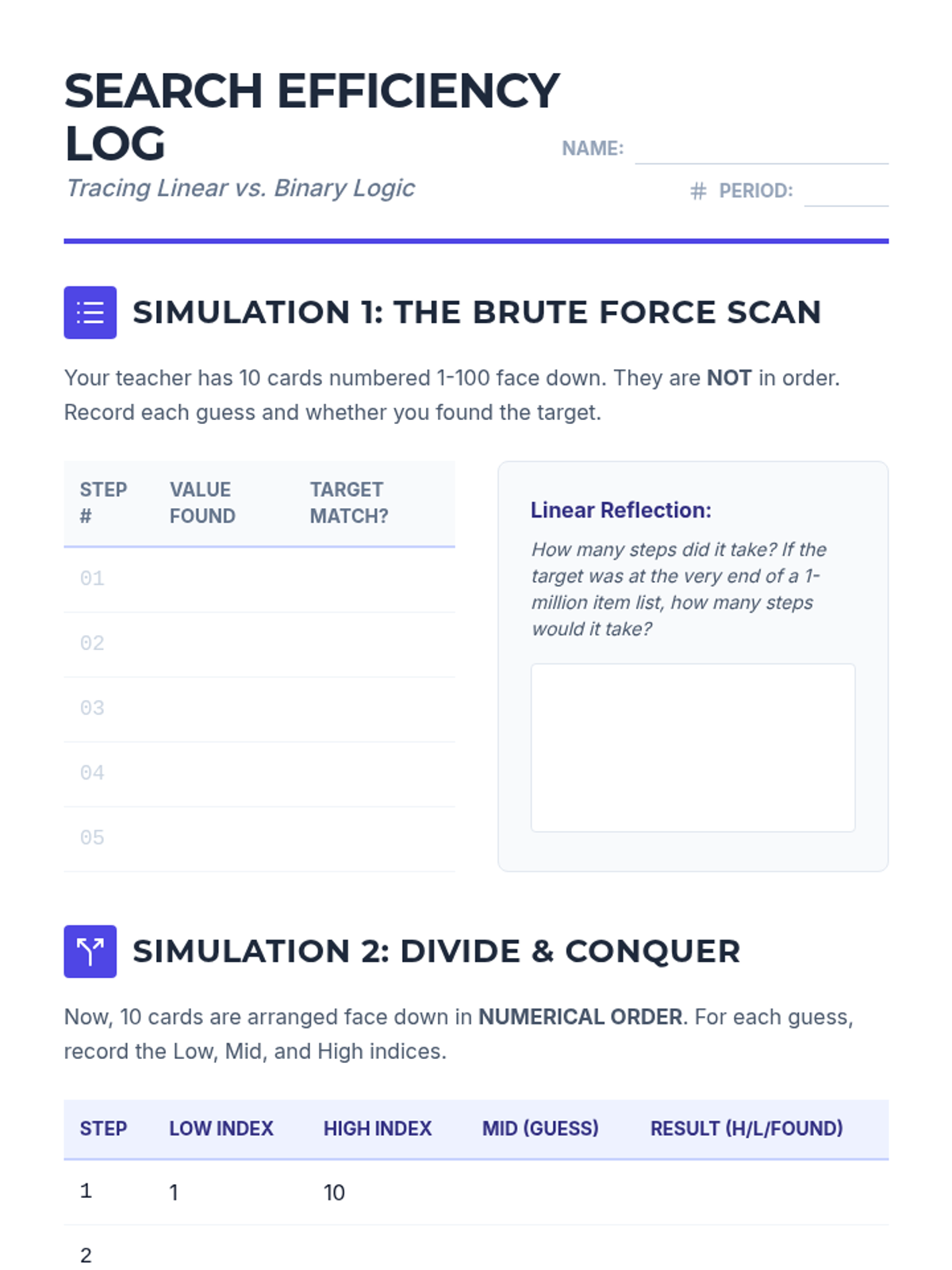 Students investigate linear and binary search methods through simulation and logic tracing, comparing the efficiency of searching in sorted versus unsorted lists.
