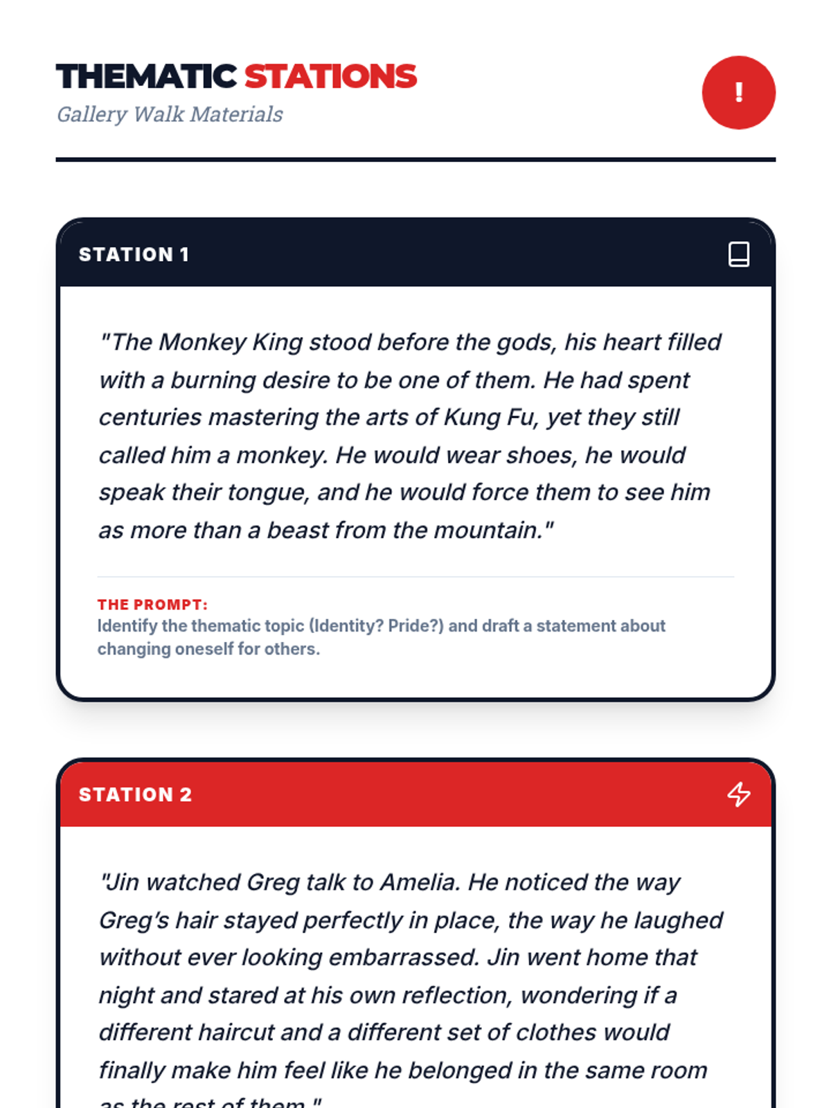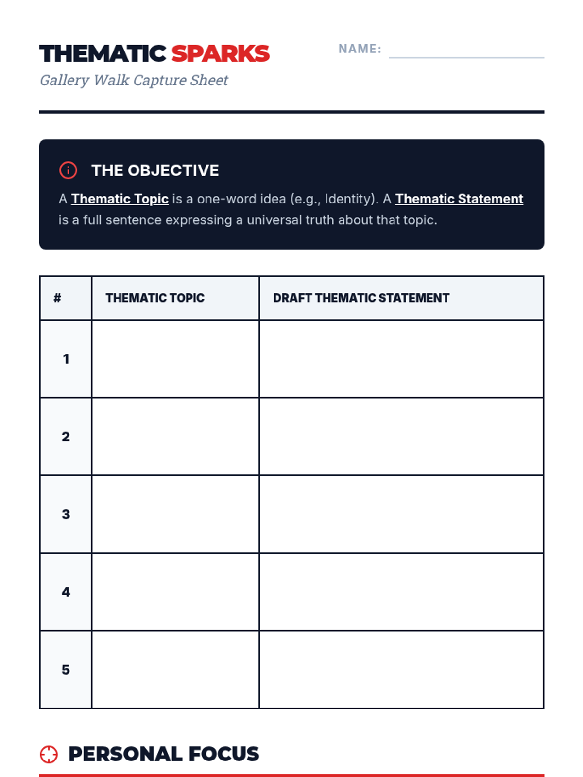 Exploring chapters 4-6 through a theme-focused gallery walk to transition from thematic topics to thematic statements.