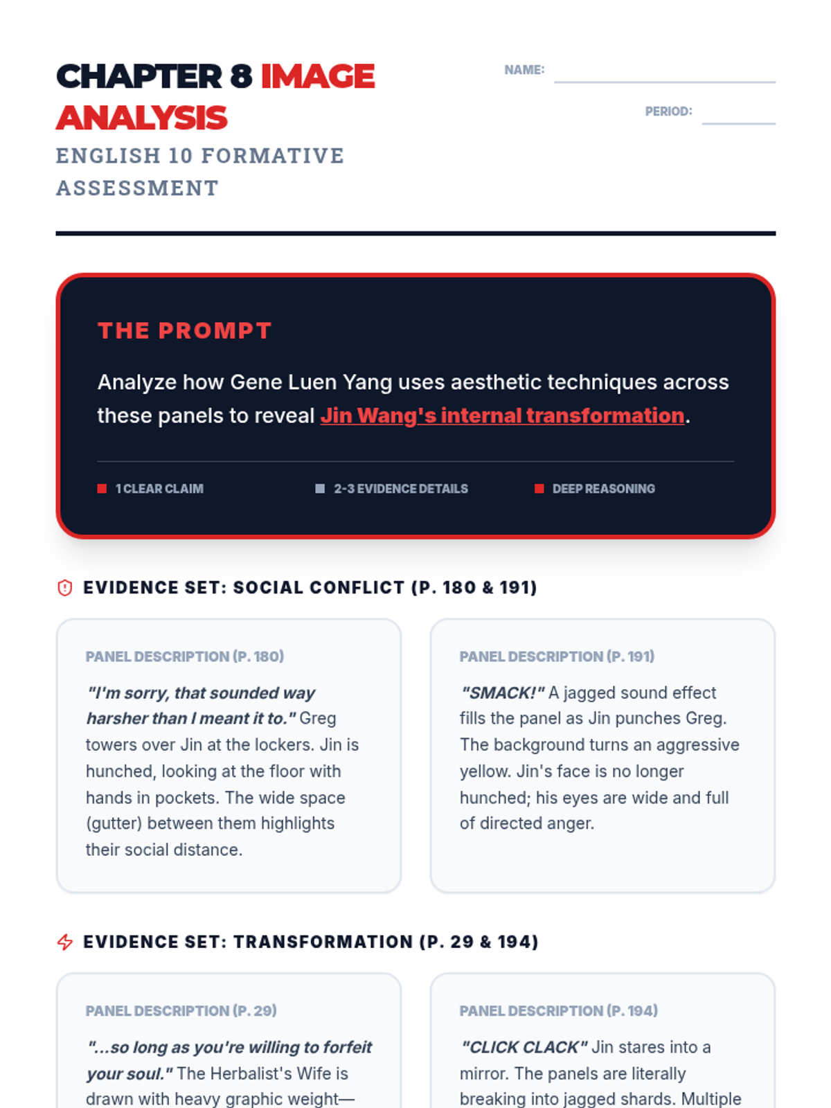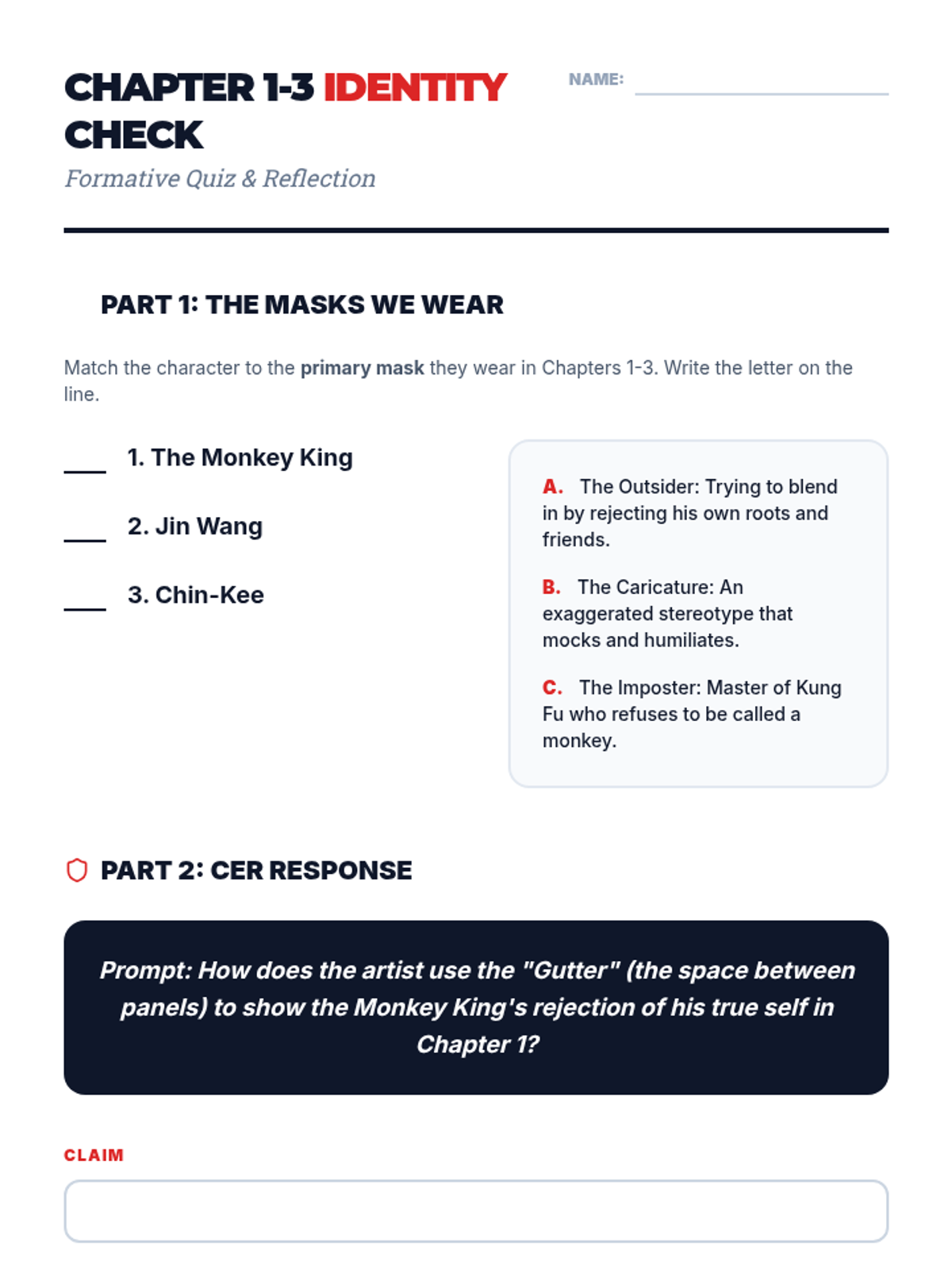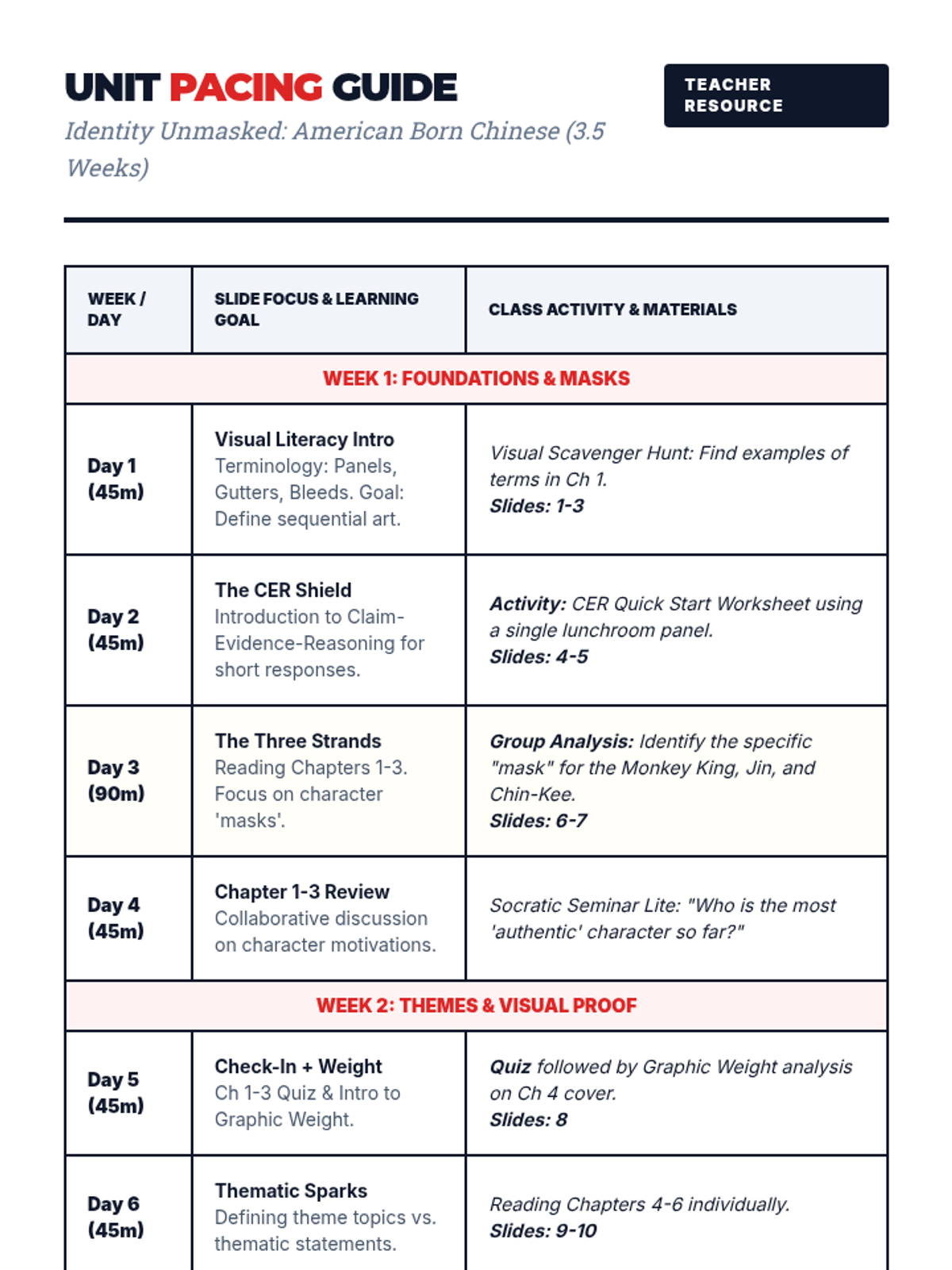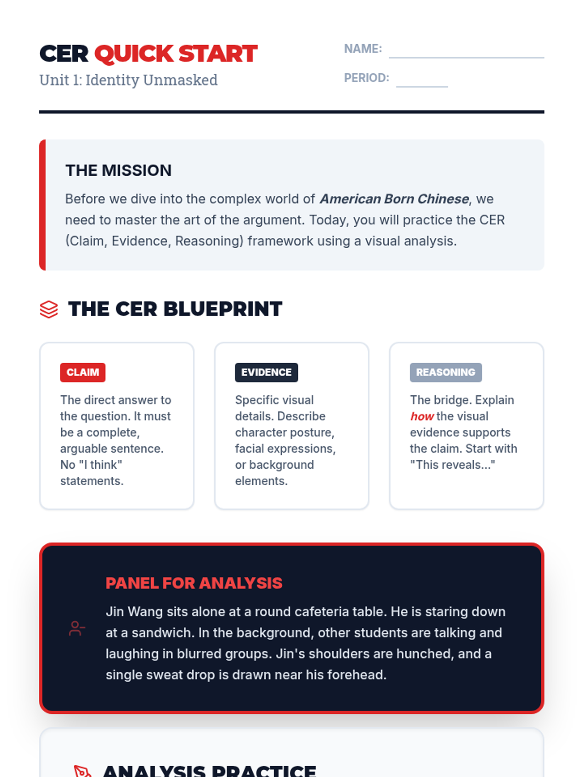 Introduction to graphic novel terminology and the CER (Claim, Evidence, Reasoning) framework for literary analysis.