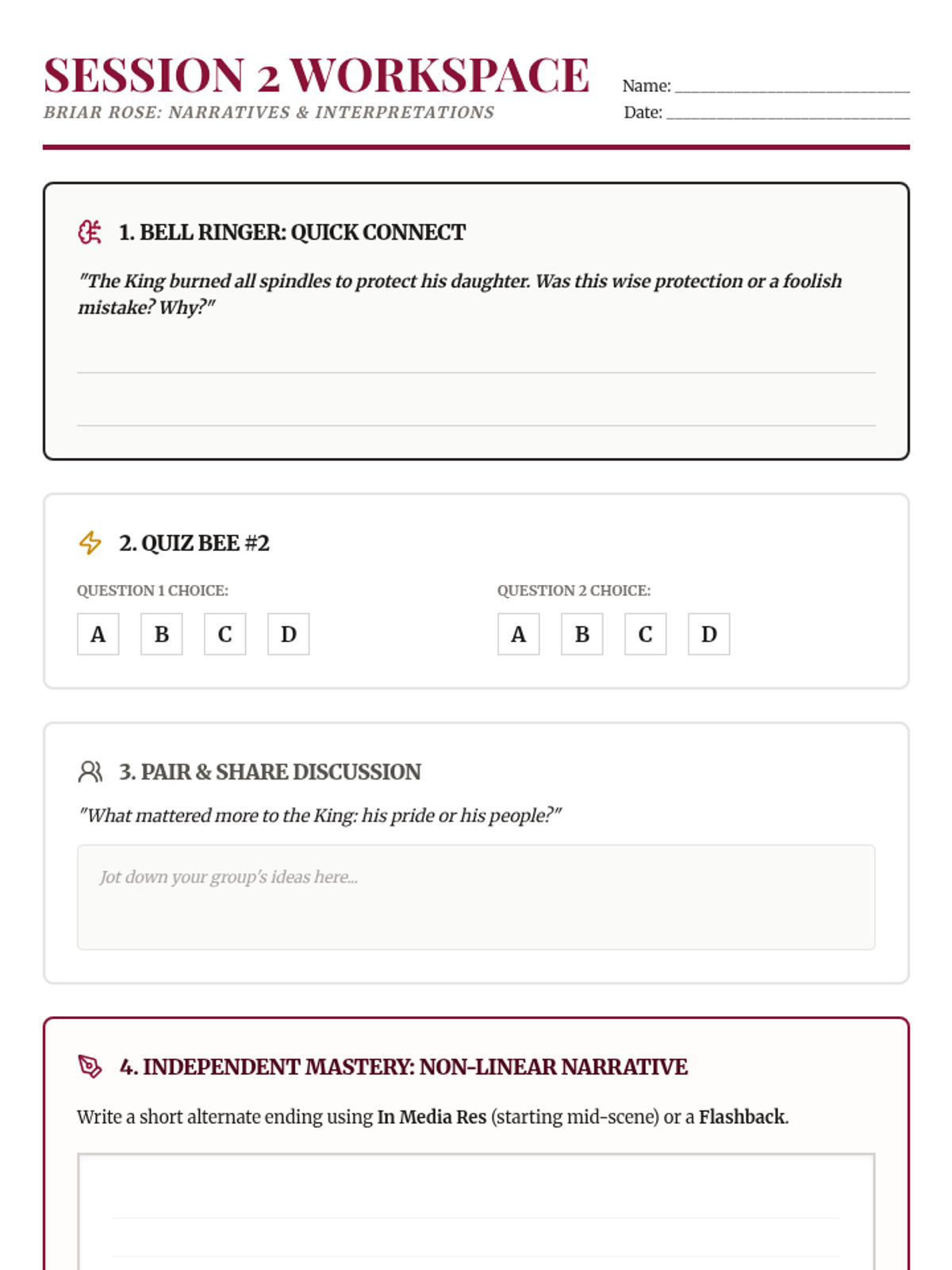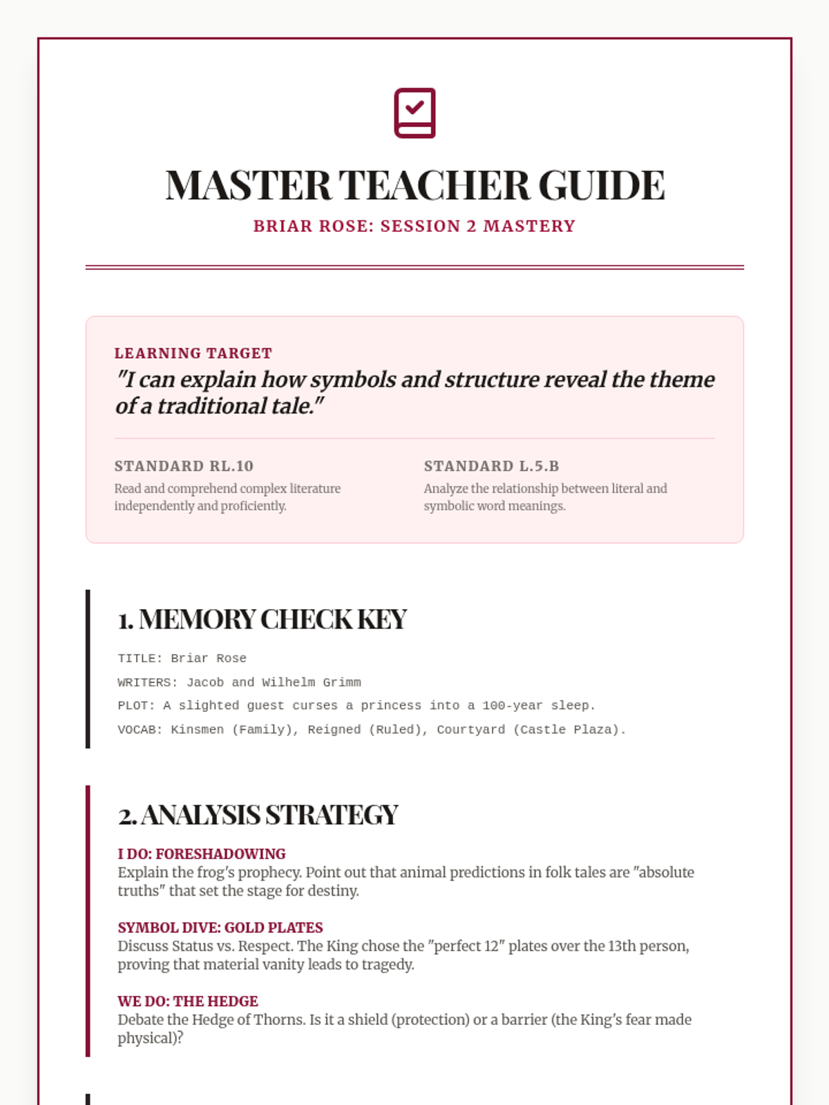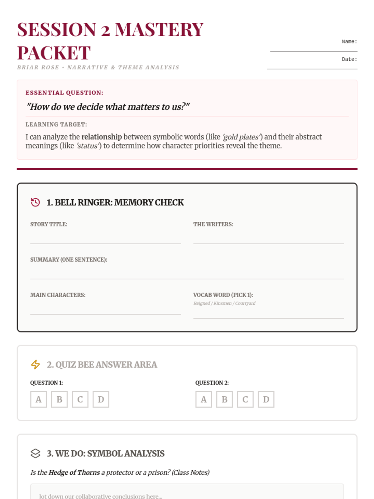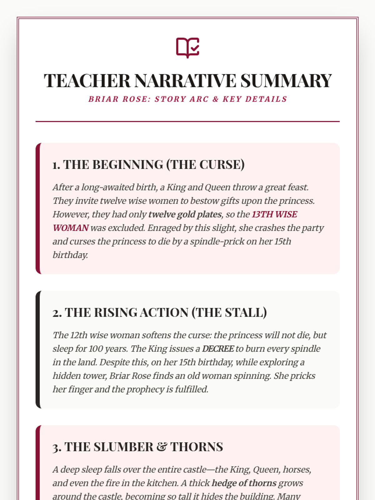 A quick exploration of theme and moral within the classic Brothers Grimm tale 'Briar Rose', featuring a focused bell ringer and exit ticket.
