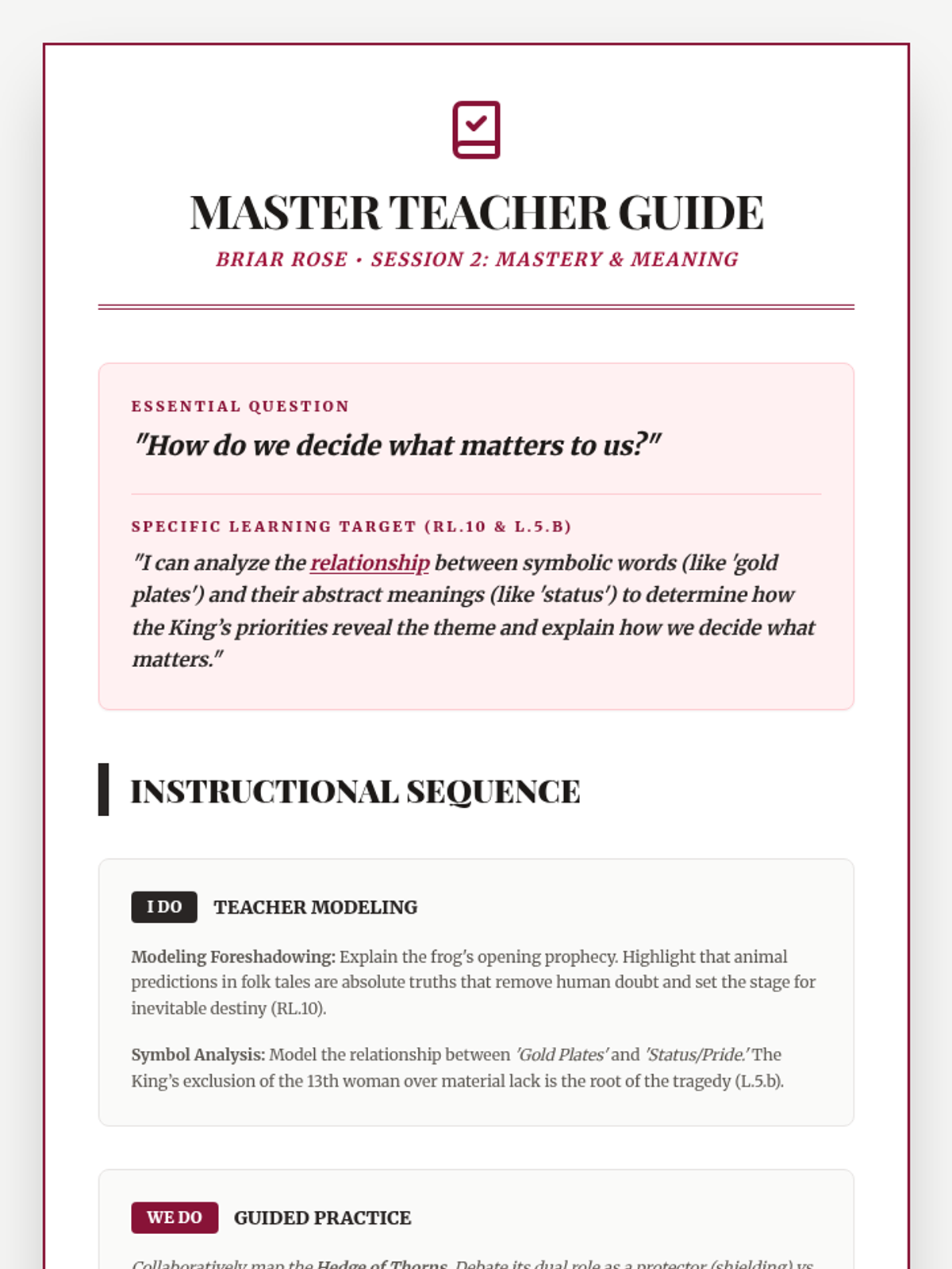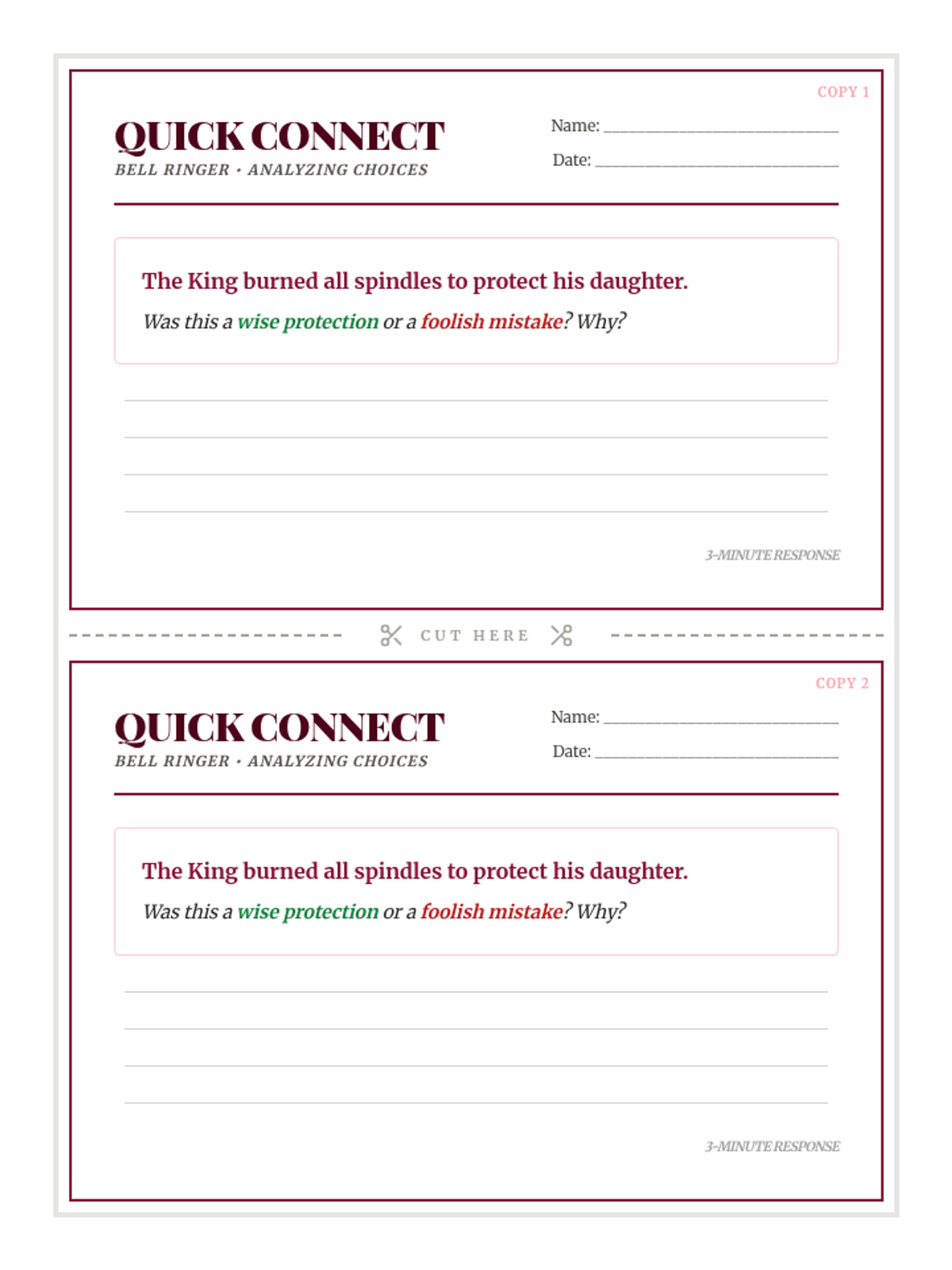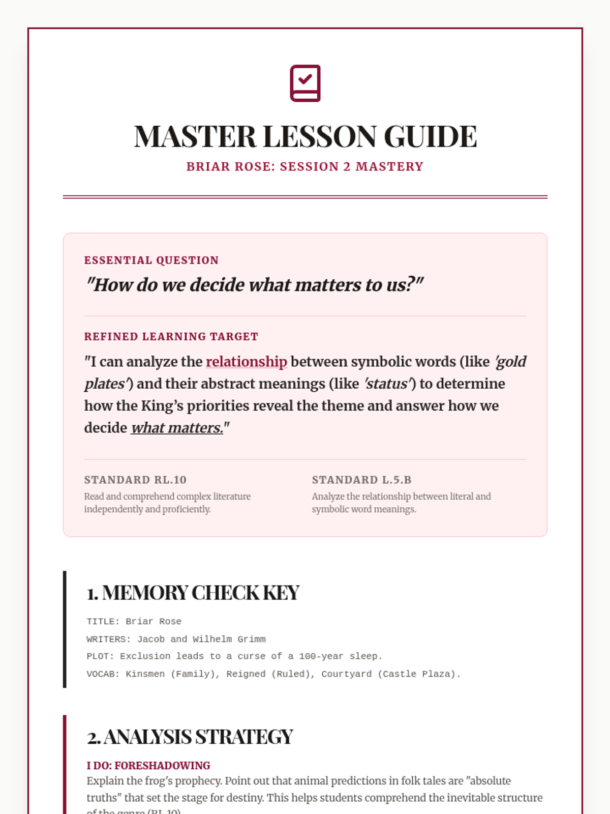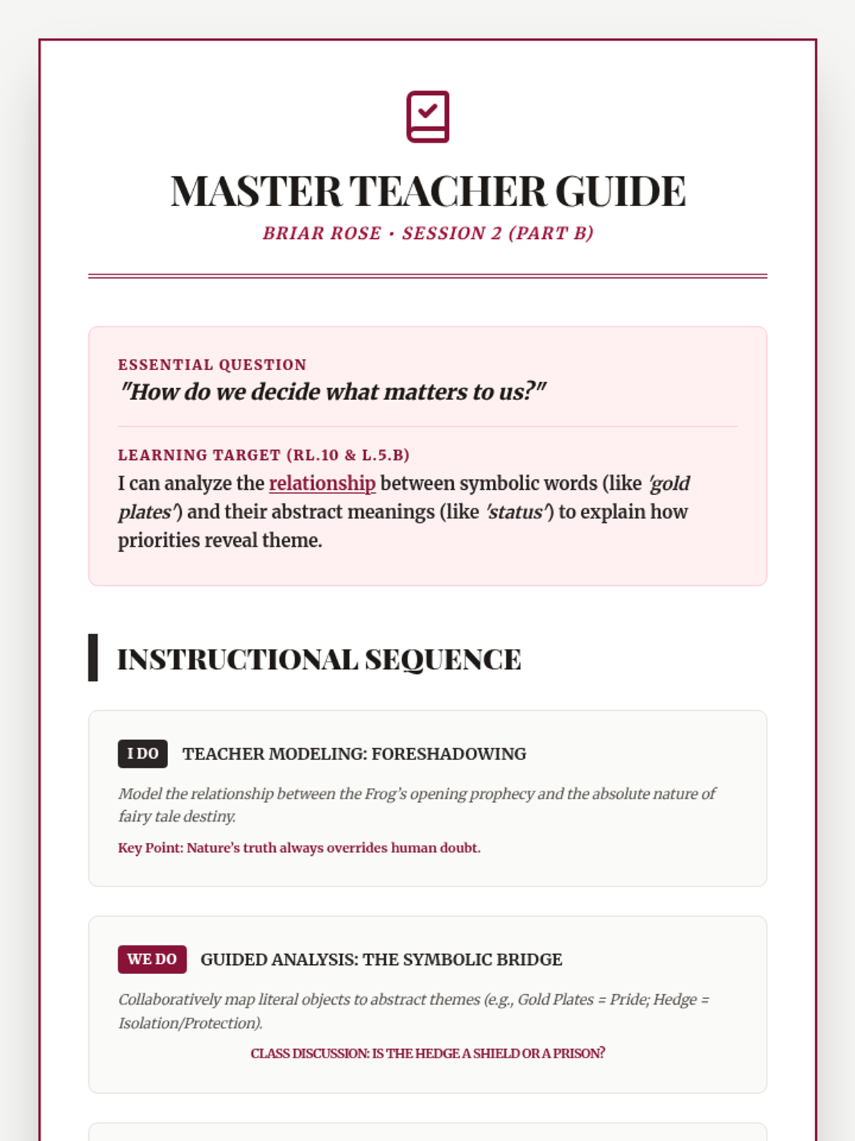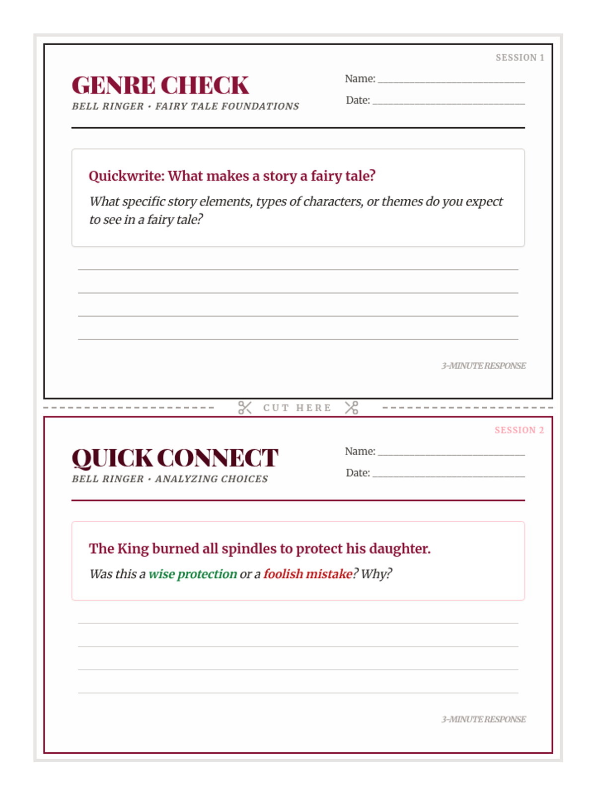 A quick exploration of theme and moral within the classic Brothers Grimm tale 'Briar Rose', featuring a focused bell ringer and exit ticket.