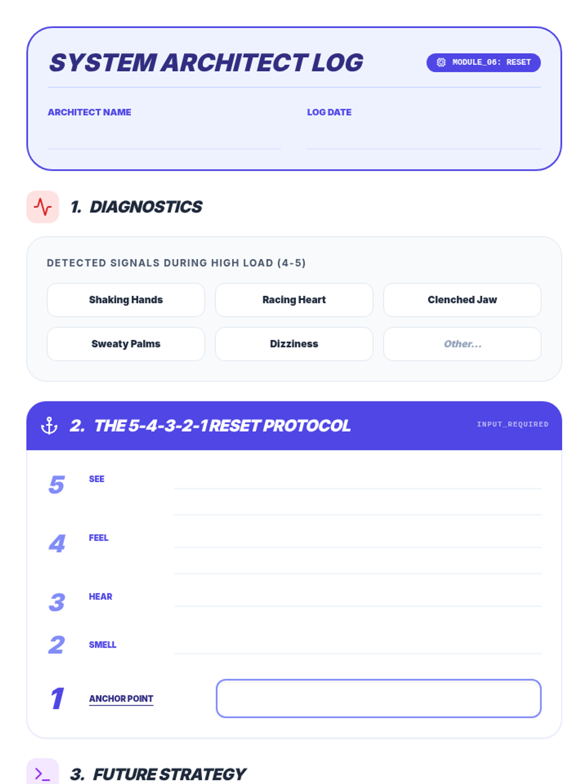 A comprehensive lesson introducing the 5-4-3-2-1 grounding technique through the lens of a 'System Architect' managing their internal activation levels. Includes a presentation with interactive scenarios and a practice worksheet.