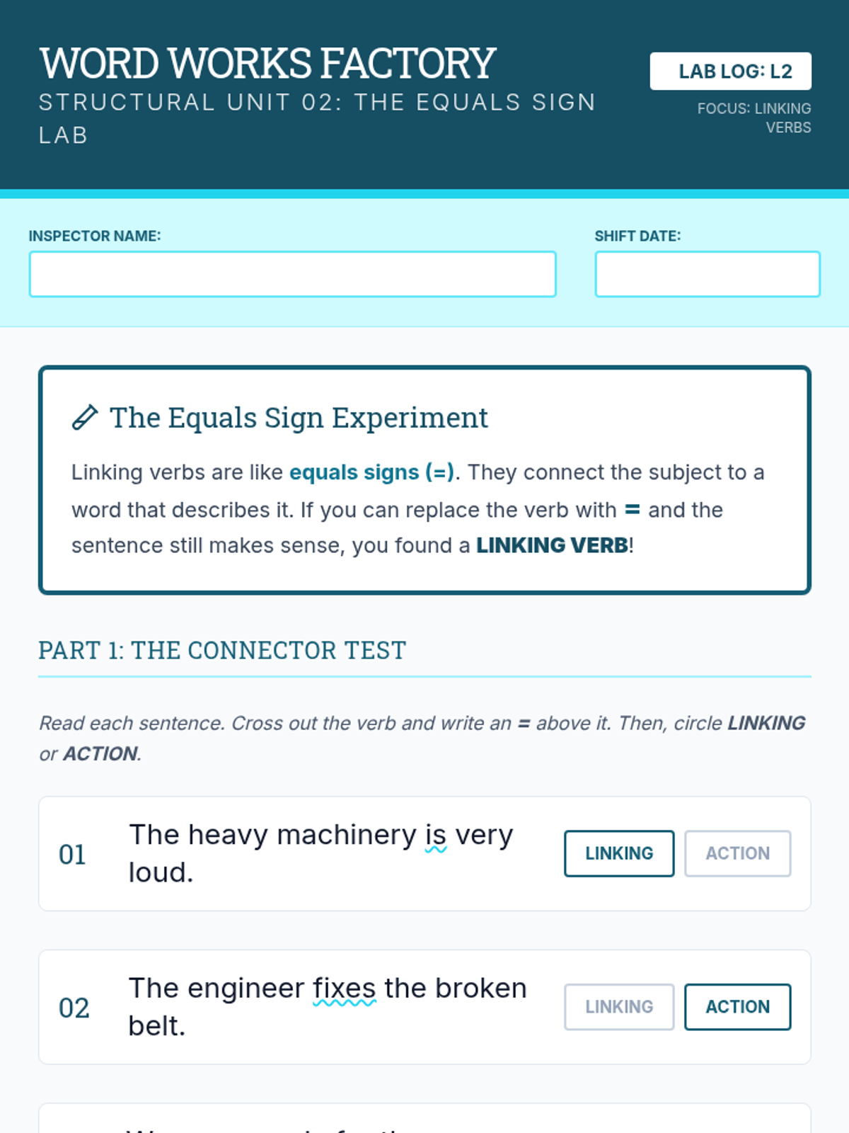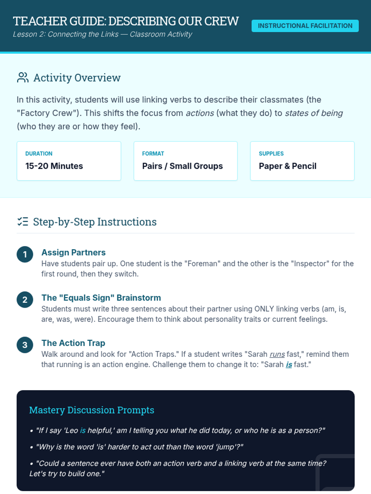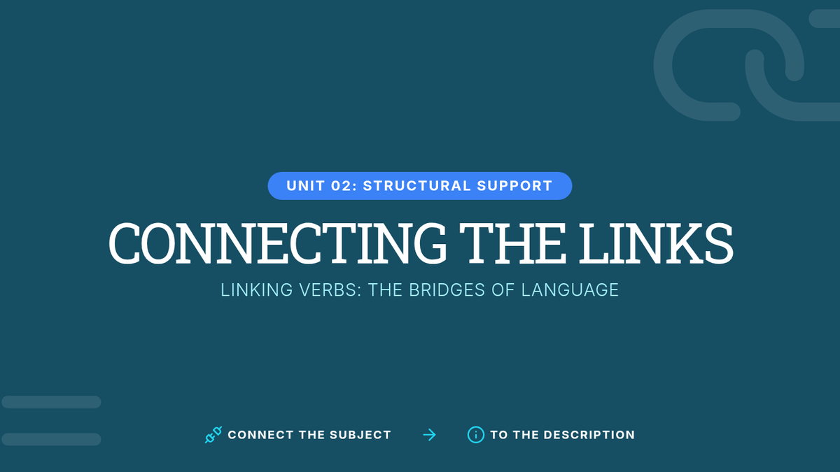 This lesson introduces linking verbs as connectors that function like an equals sign, linking subjects to their descriptions.