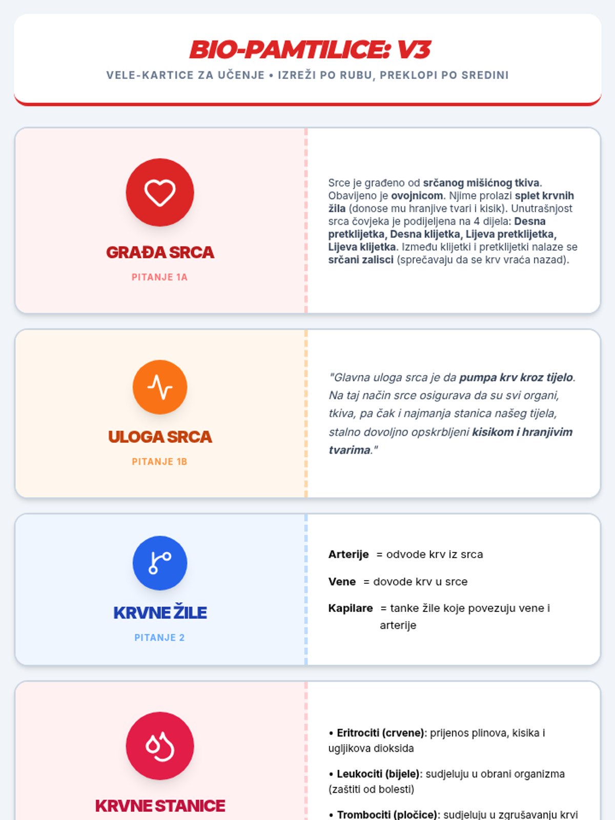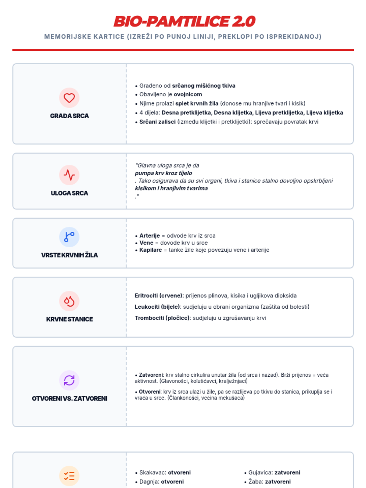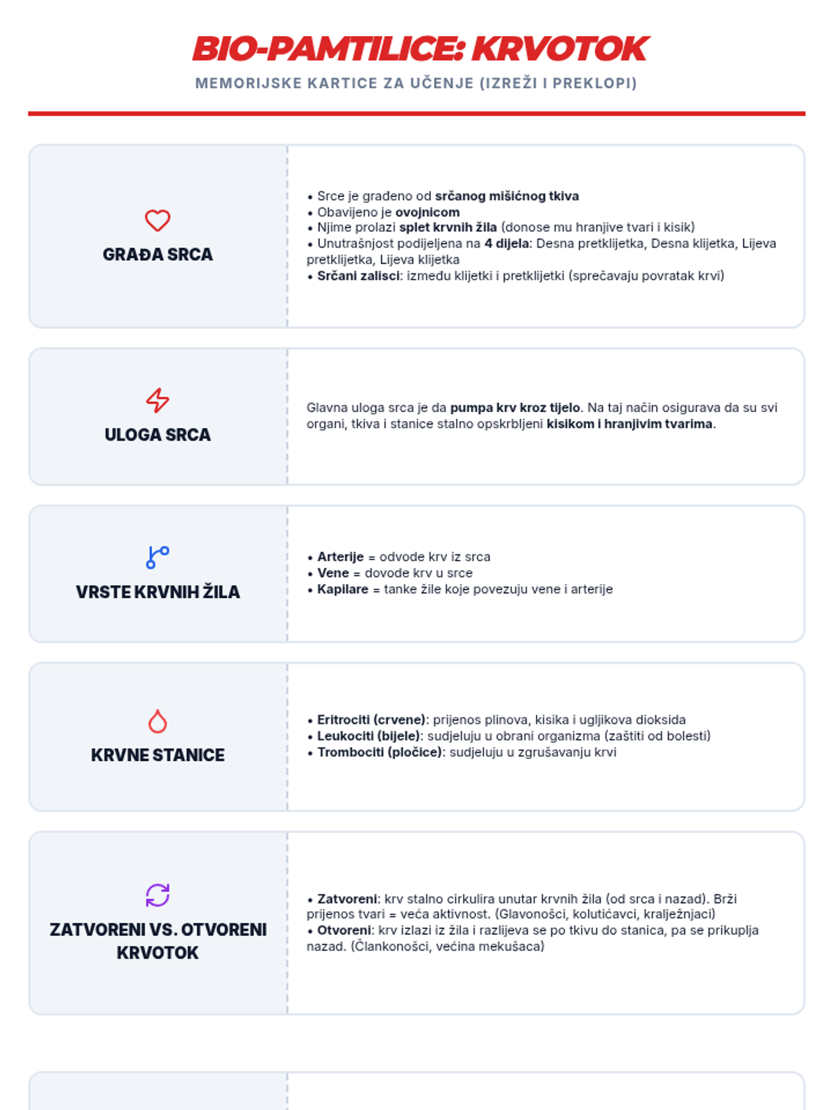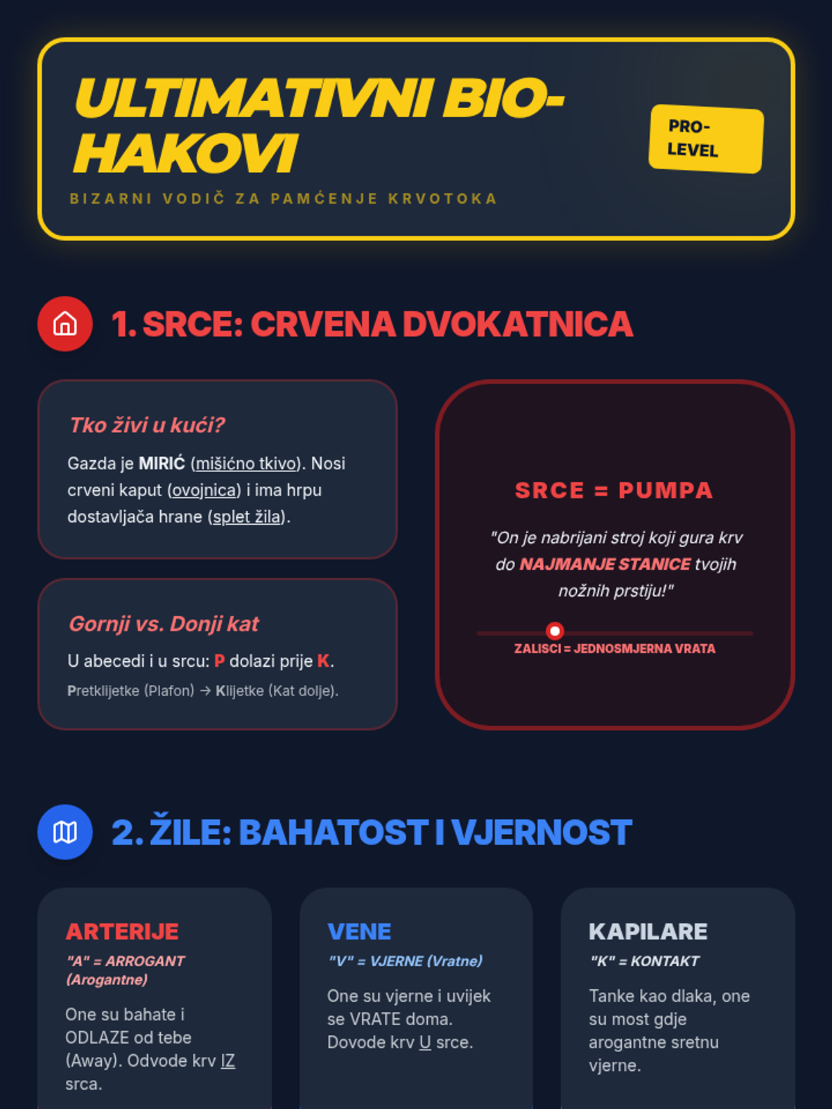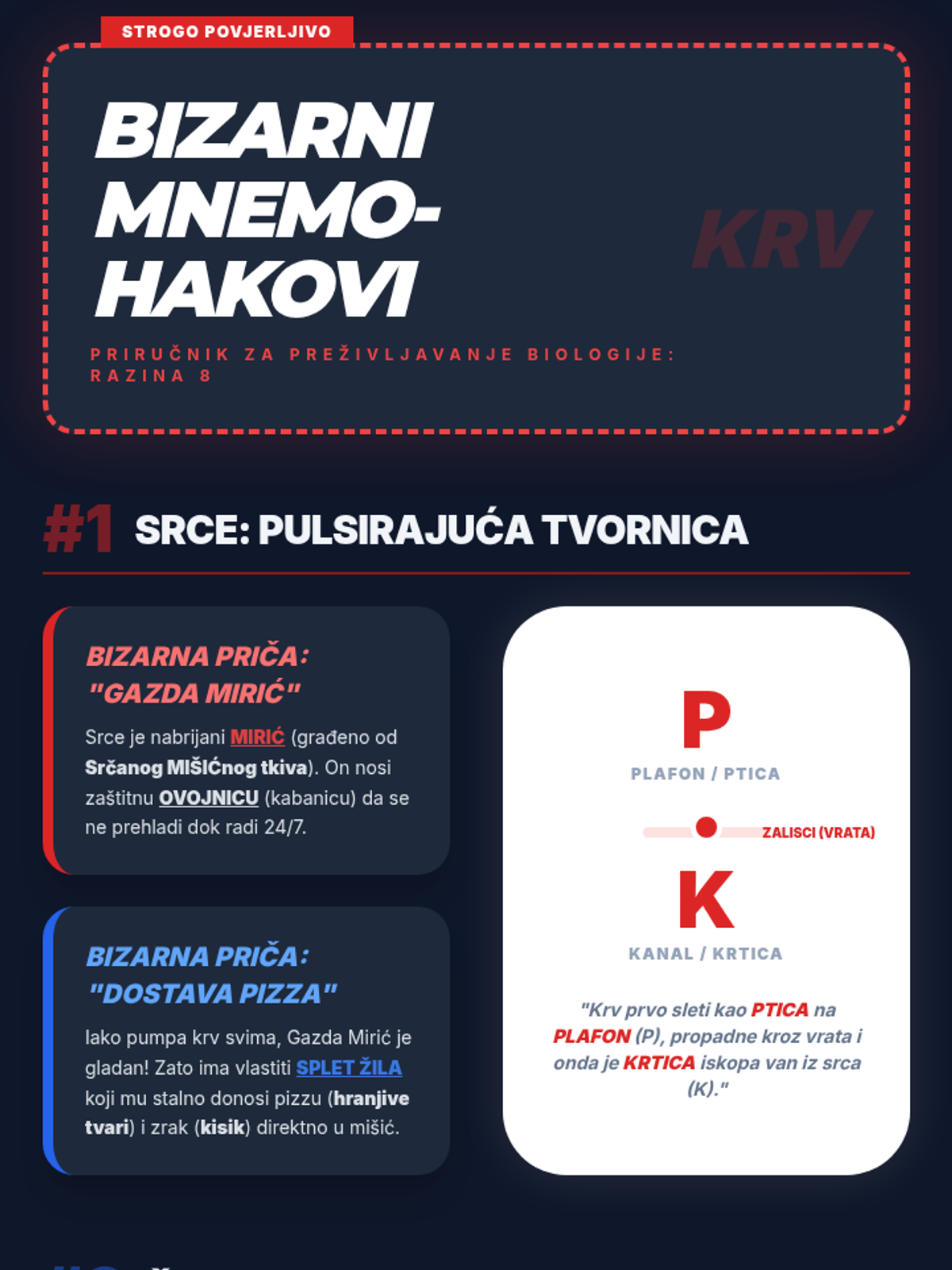 Sveobuhvatna lekcija o ljudskom srcu, krvnim žilama, krvnim stanicama i vrstama krvotoka, obogaćena kreativnim mnemotehnikama za lakše pamćenje složenih bioloških pojmova.