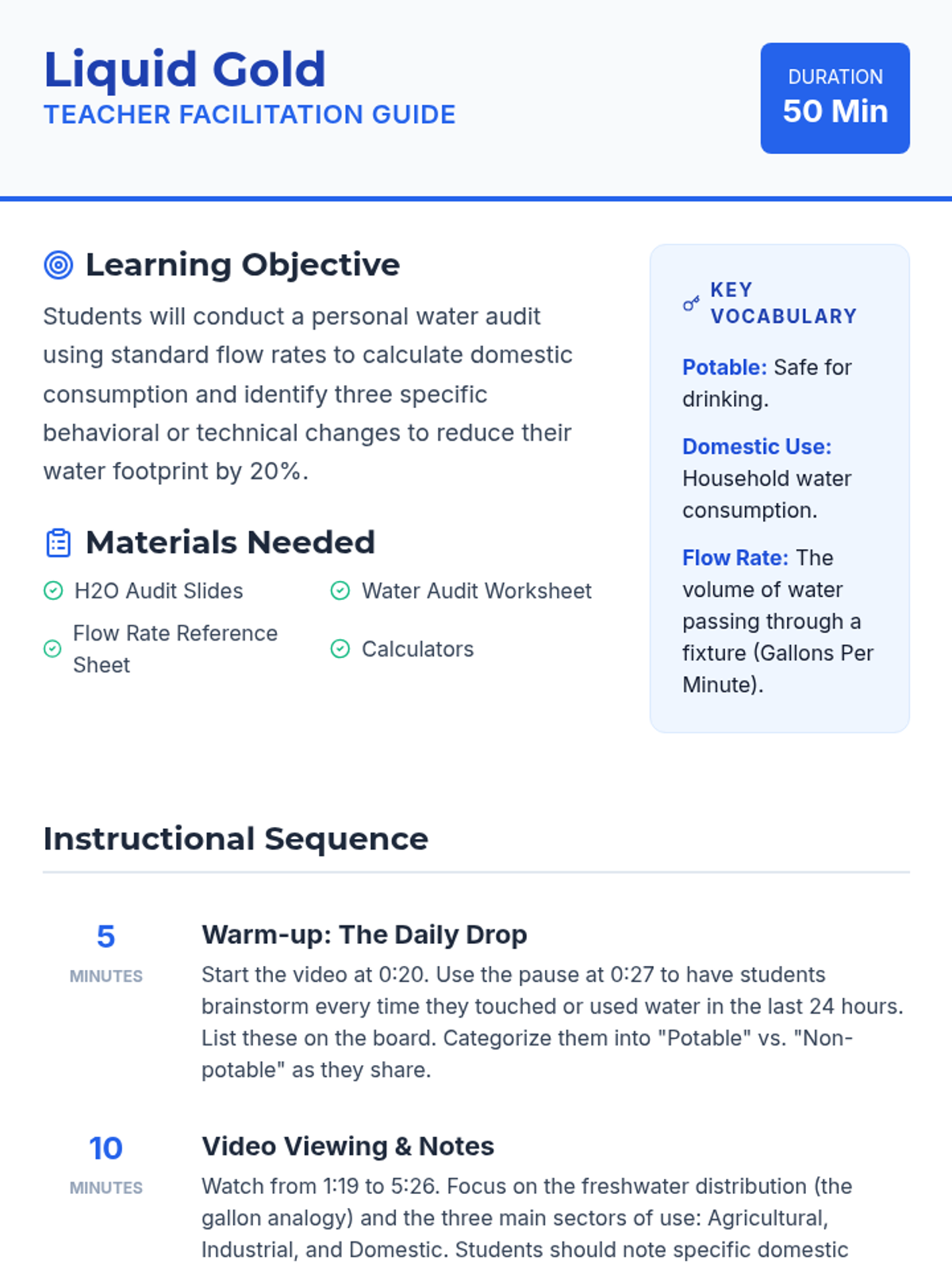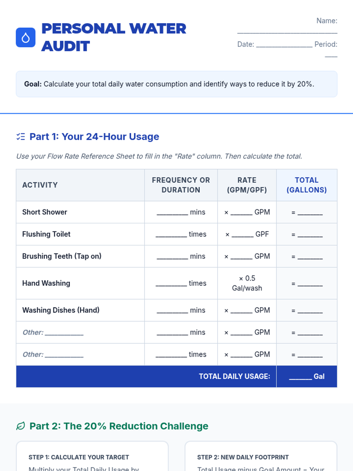 Students investigate their personal water footprint by conducting a domestic water audit. Using real-world flow rates and data from a guided video, they calculate their daily usage and develop a conservation plan to reduce consumption by 20%.