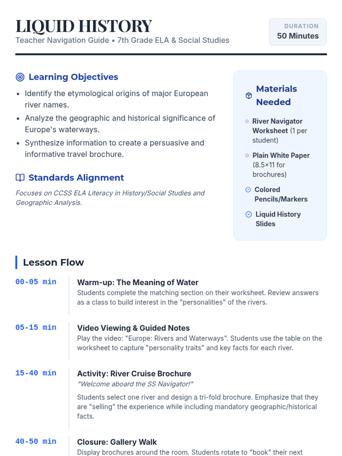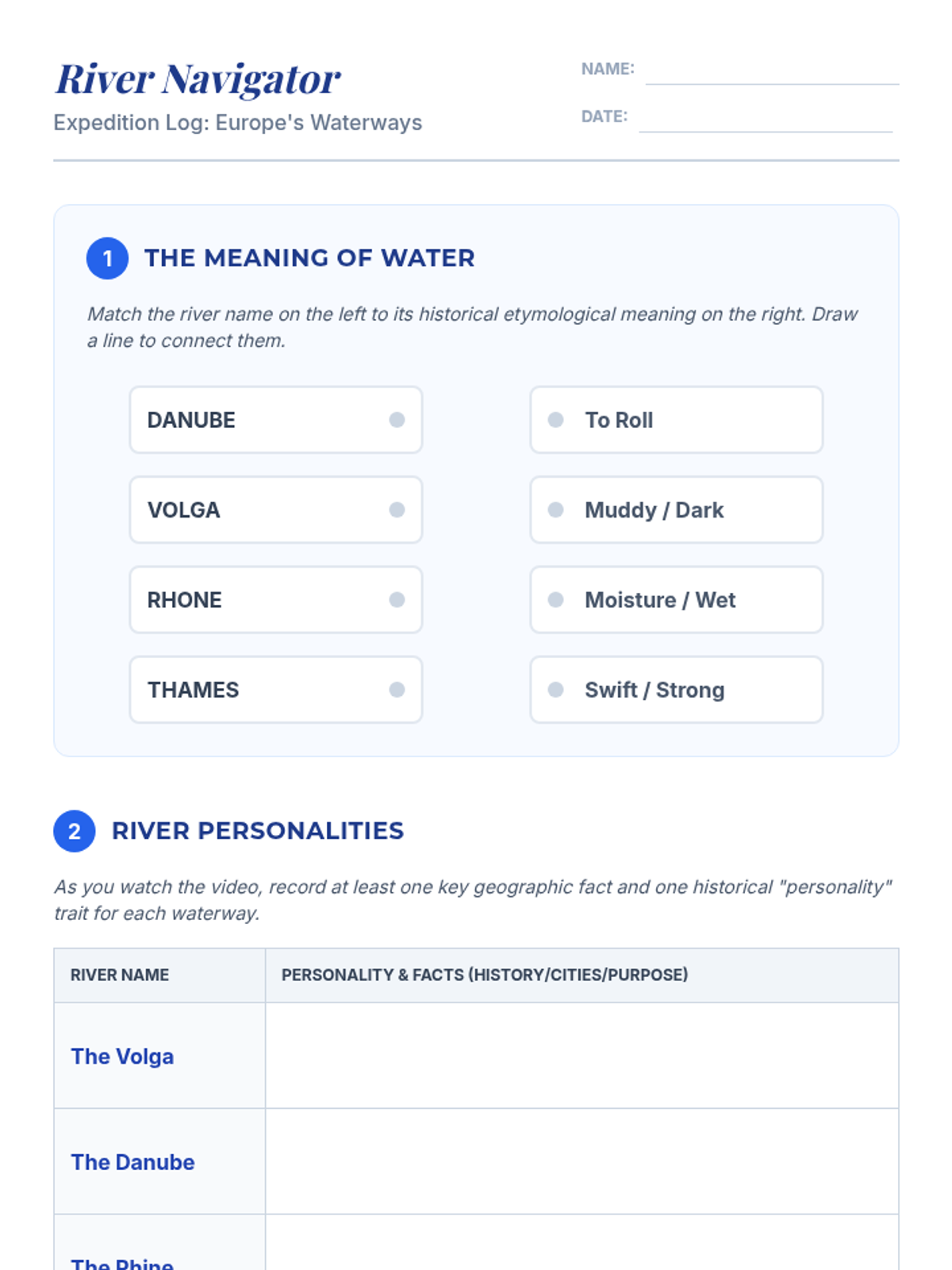Students explore the geographic, historical, and etymological significance of Europe's major rivers through a video-based note-taking activity and the creation of a themed river cruise brochure.