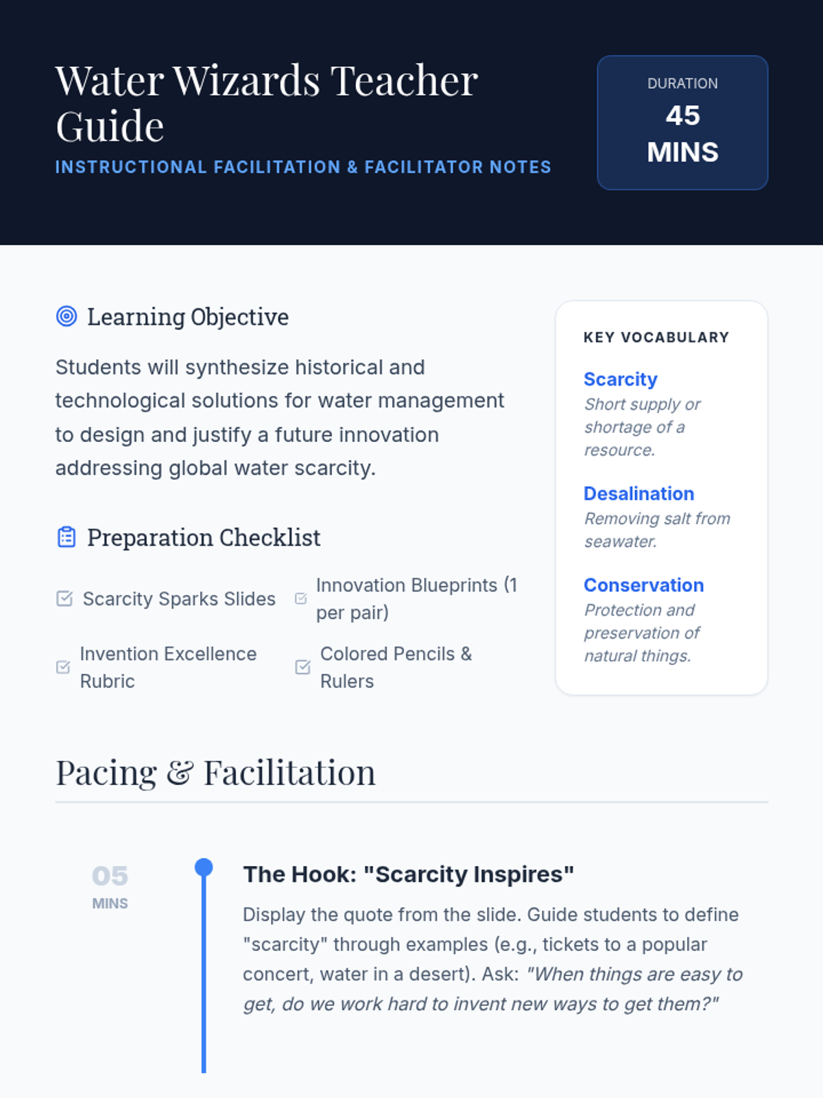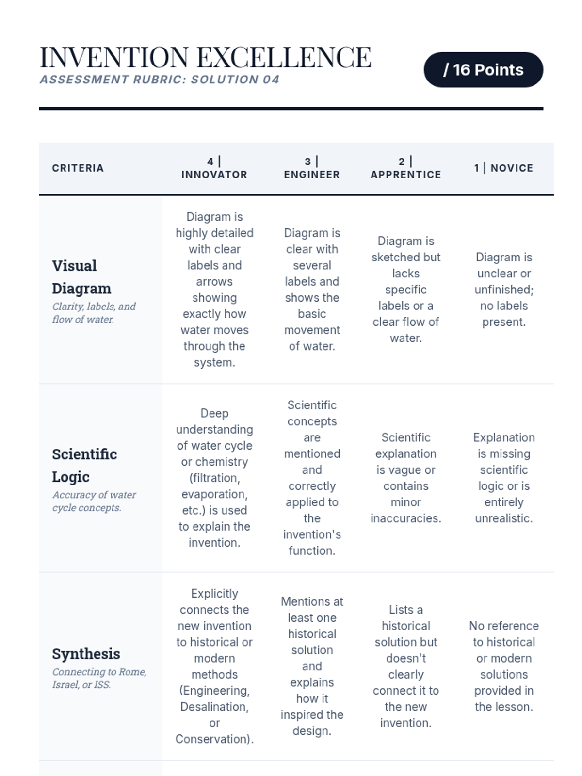 Students will analyze historical and modern water scarcity solutions (Rome, Israel, ISS) and synthesize these concepts to design a futuristic water innovation for a city in crisis.