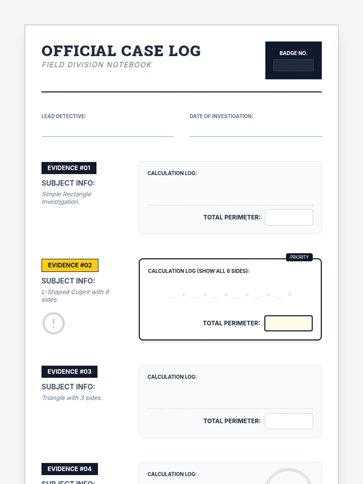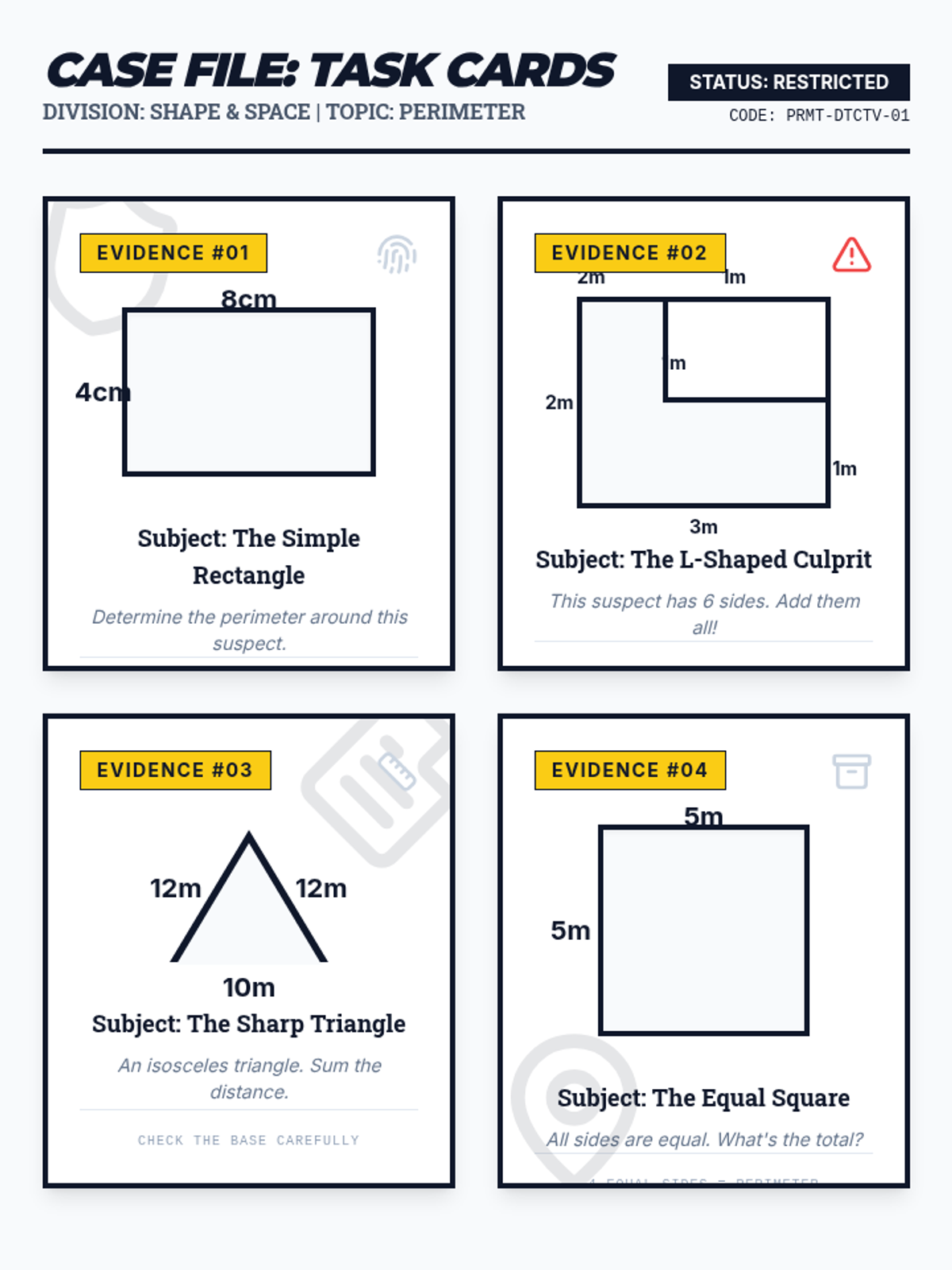 A perimeter-focused lesson where students take on the role of detectives to calculate the boundaries of various shapes. Features mystery-themed visuals and step-by-step problem-solving.