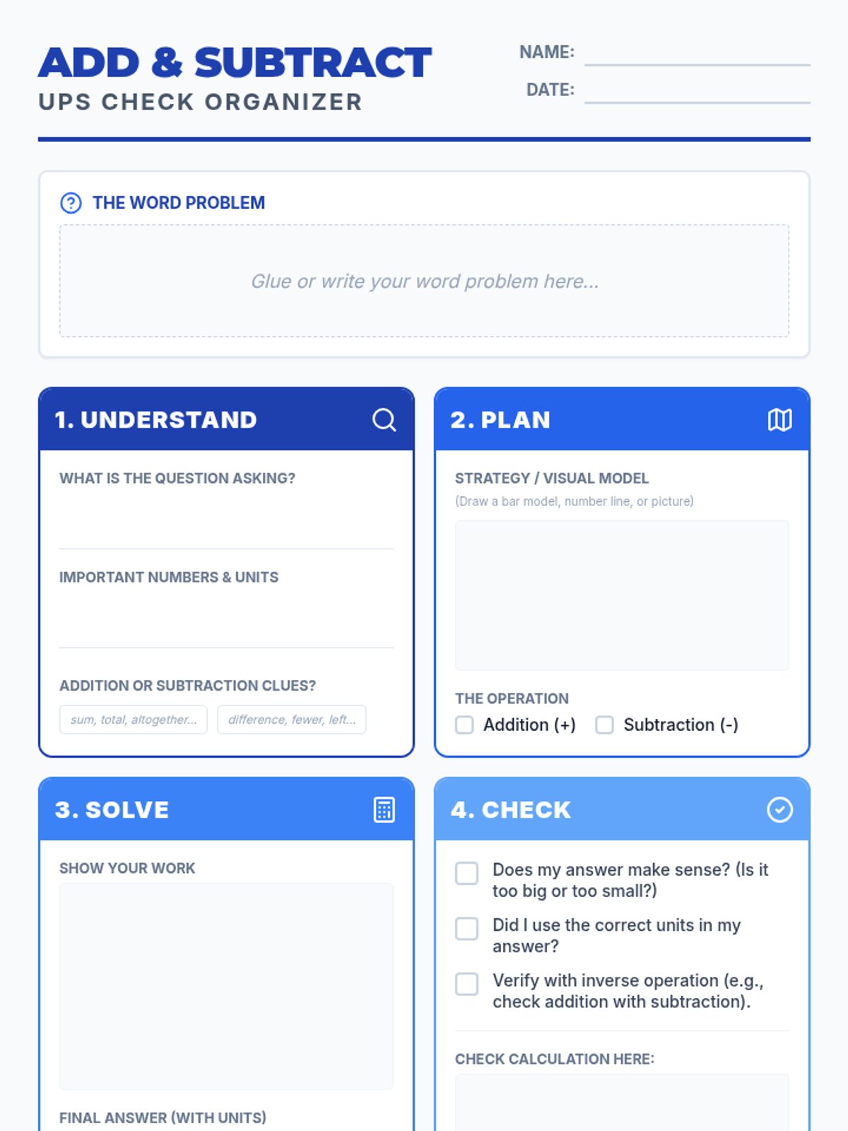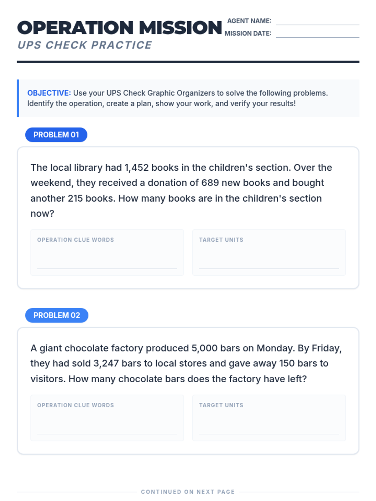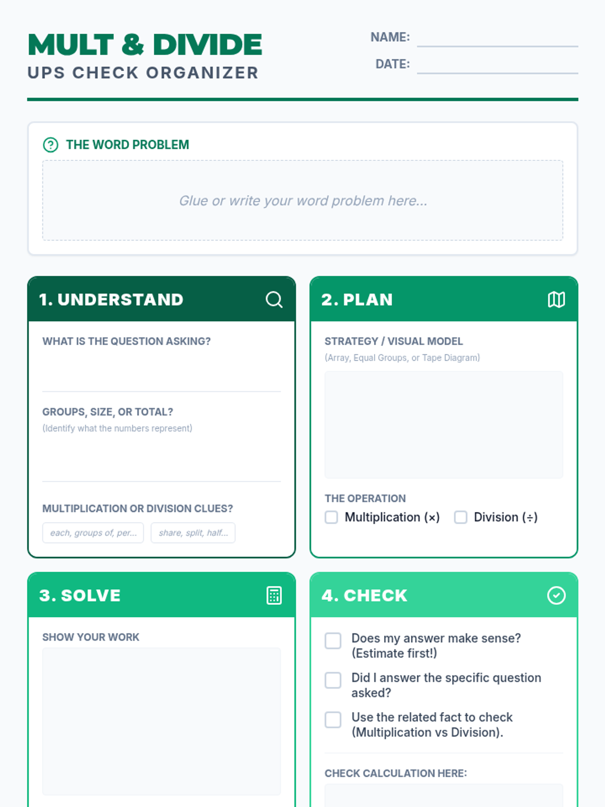 A collection of graphic organizers and practice materials focused on the UPS Check (Understand, Plan, Solve, Check) strategy for solving multi-operation word problems.