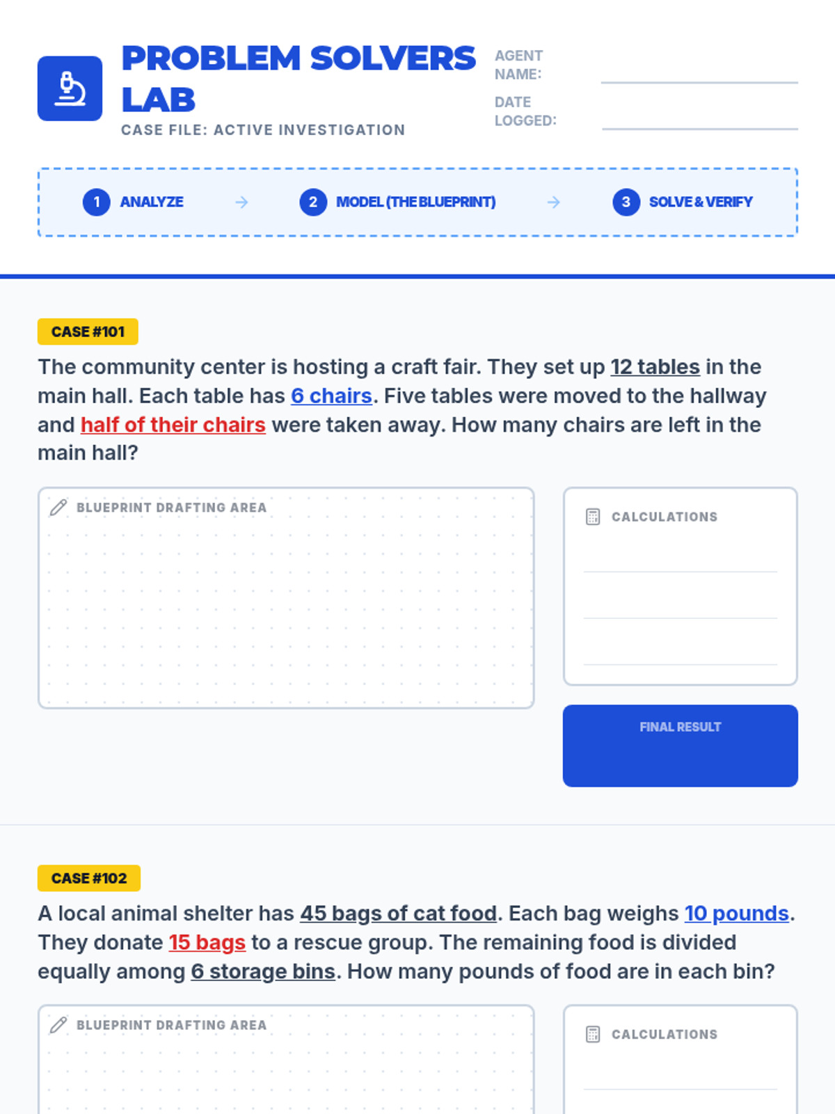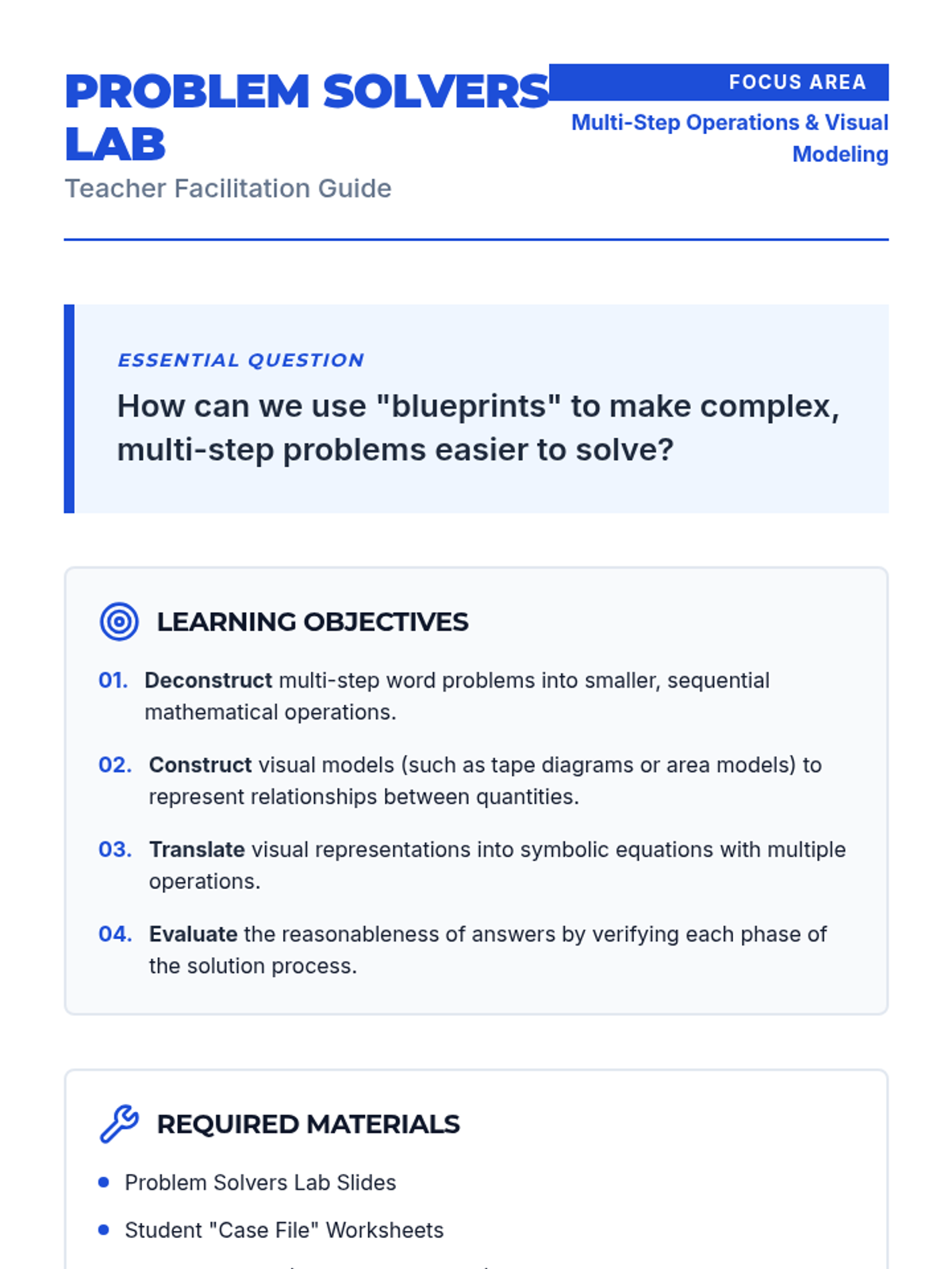 A lesson focused on equipping students with strategies to tackle complex, multi-step math problems using decomposition and visual modeling. Students learn to break problems into manageable 'blueprints' before solving.
