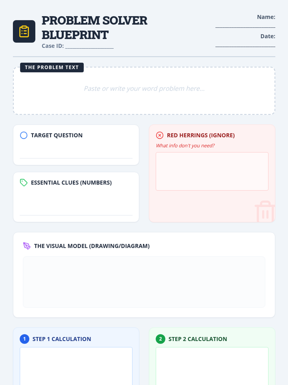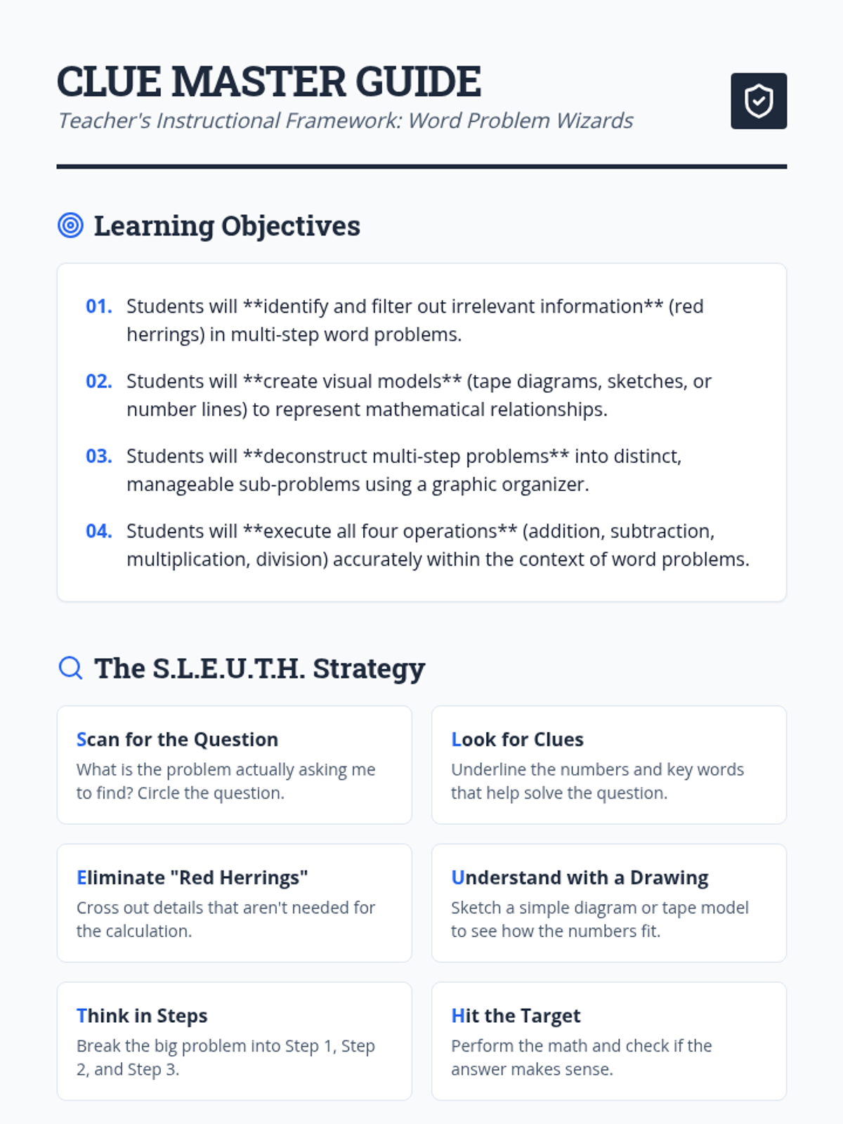 This lesson equips students with a 'detective's toolkit' of strategies to tackle complex, multi-step word problems involving all four operations. Students learn to filter out 'red herrings' (irrelevant info), visualize scenarios, and use a structured graphic organizer to break problems into solvable parts.