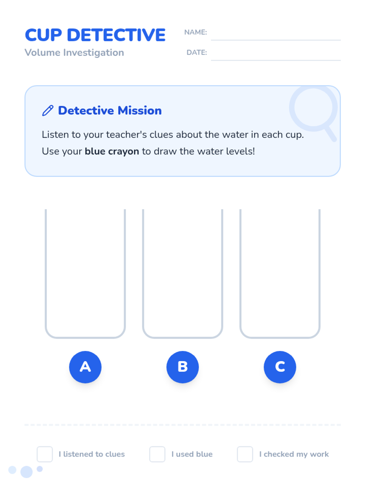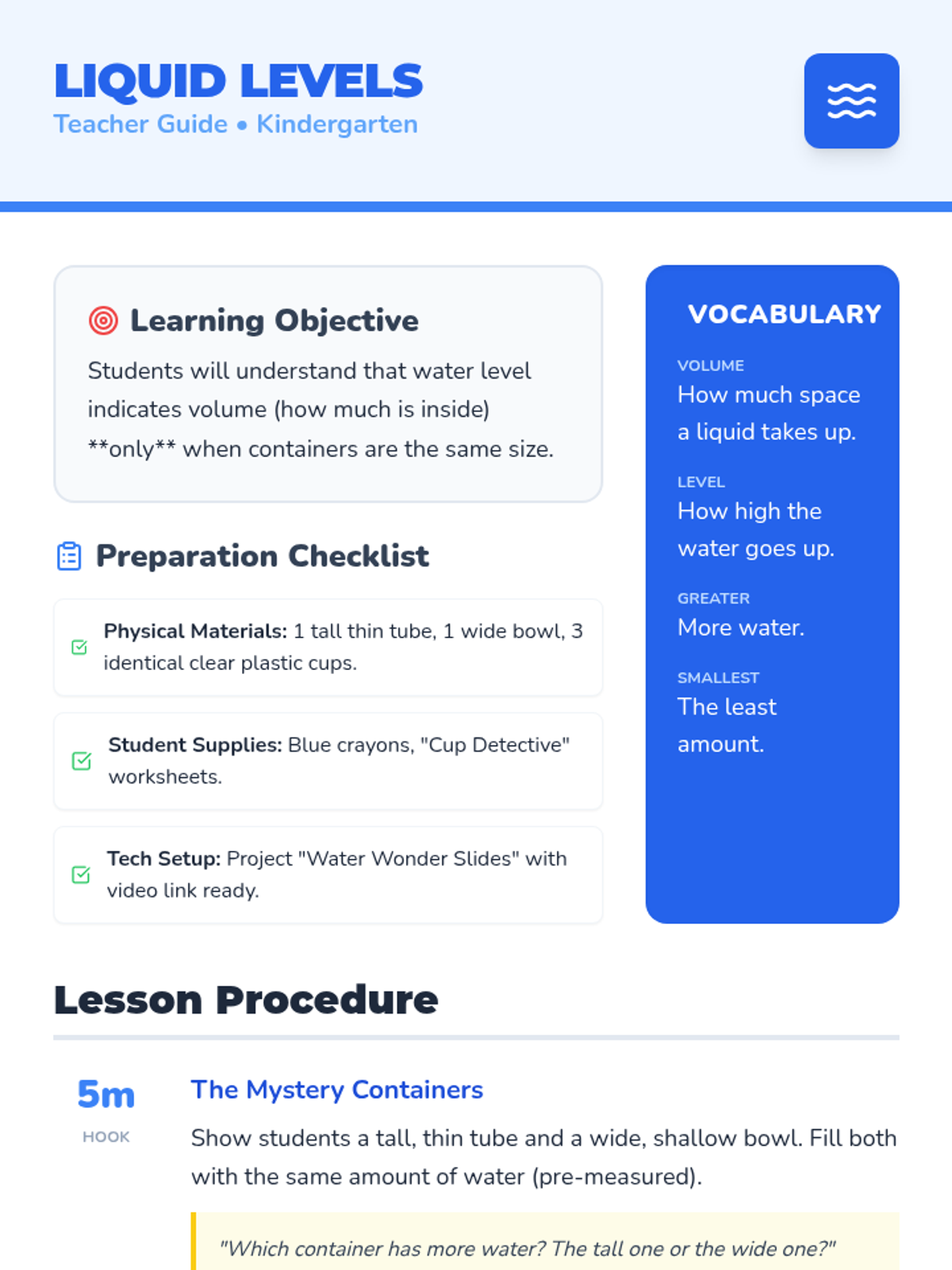 A Kindergarten lesson exploring how water level relates to volume when containers are identical, featuring a hands-on prediction activity and video analysis.