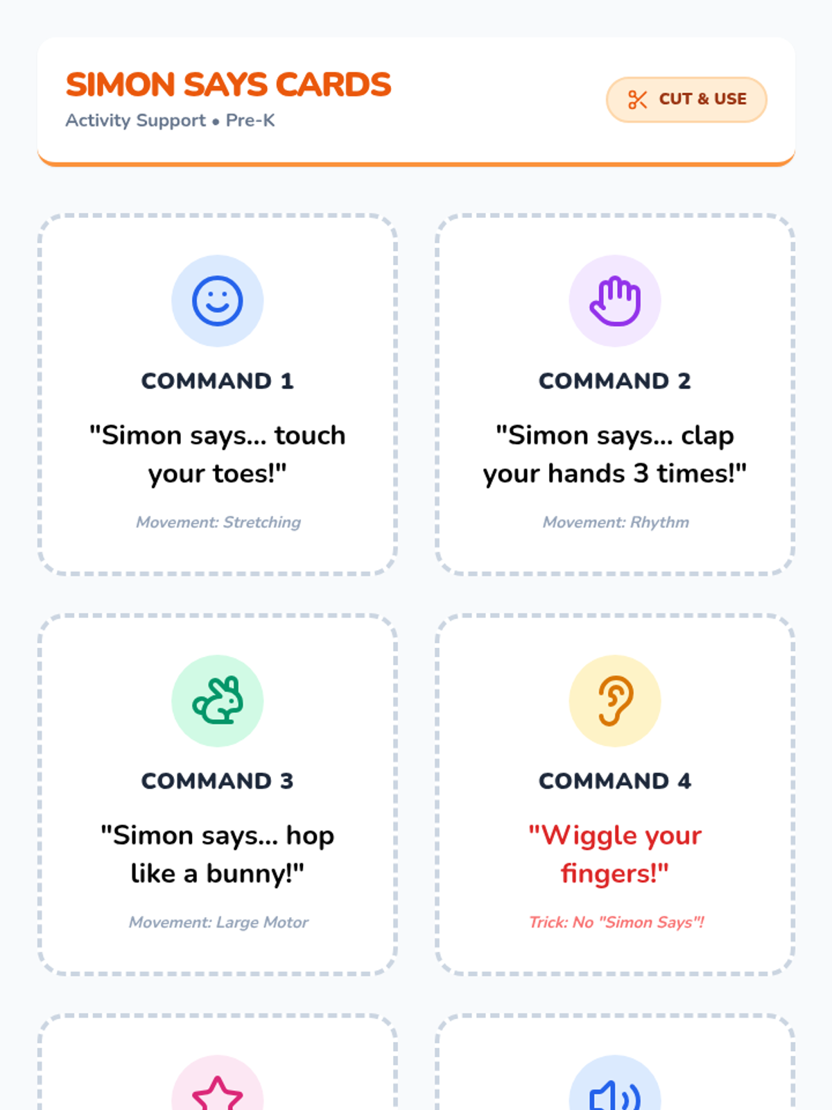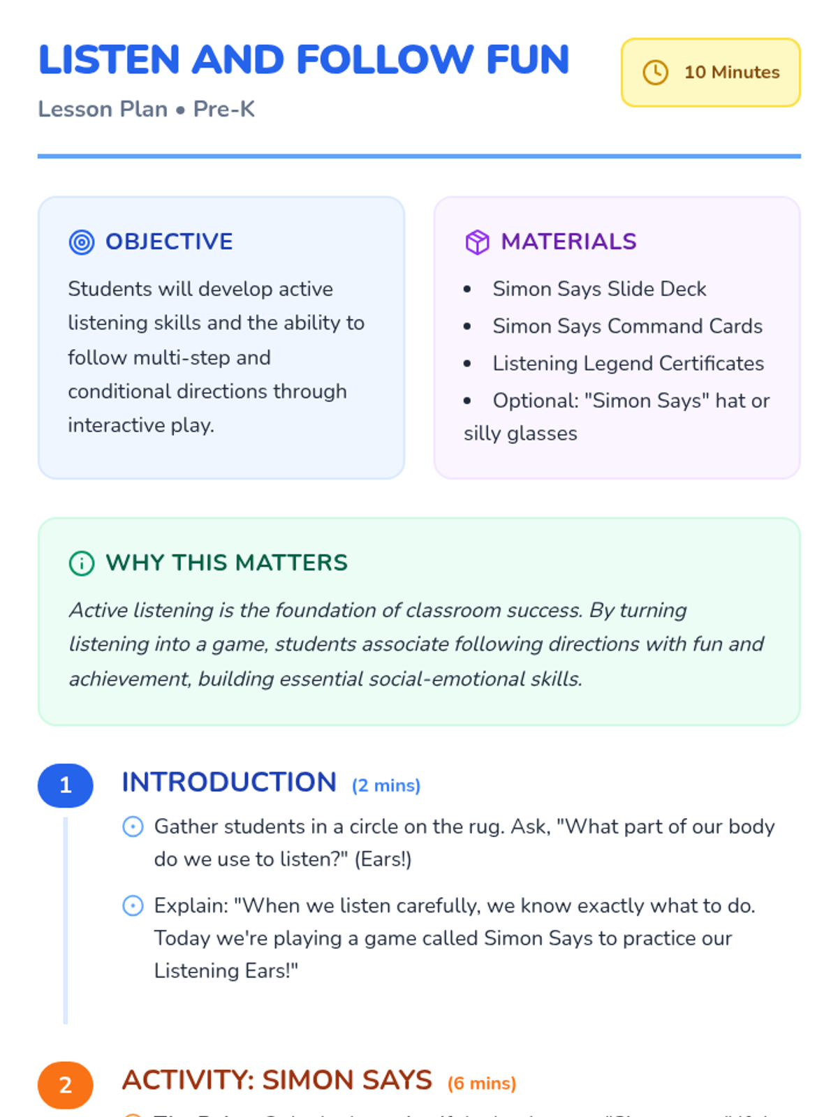 A fun, interactive lesson for Pre-K students to develop active listening skills through the classic game of Simon Says, emphasizing the importance of following directions.