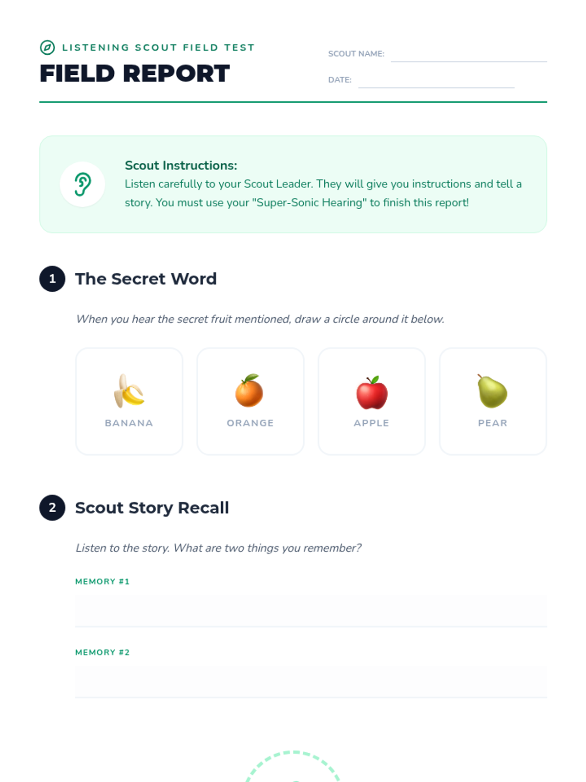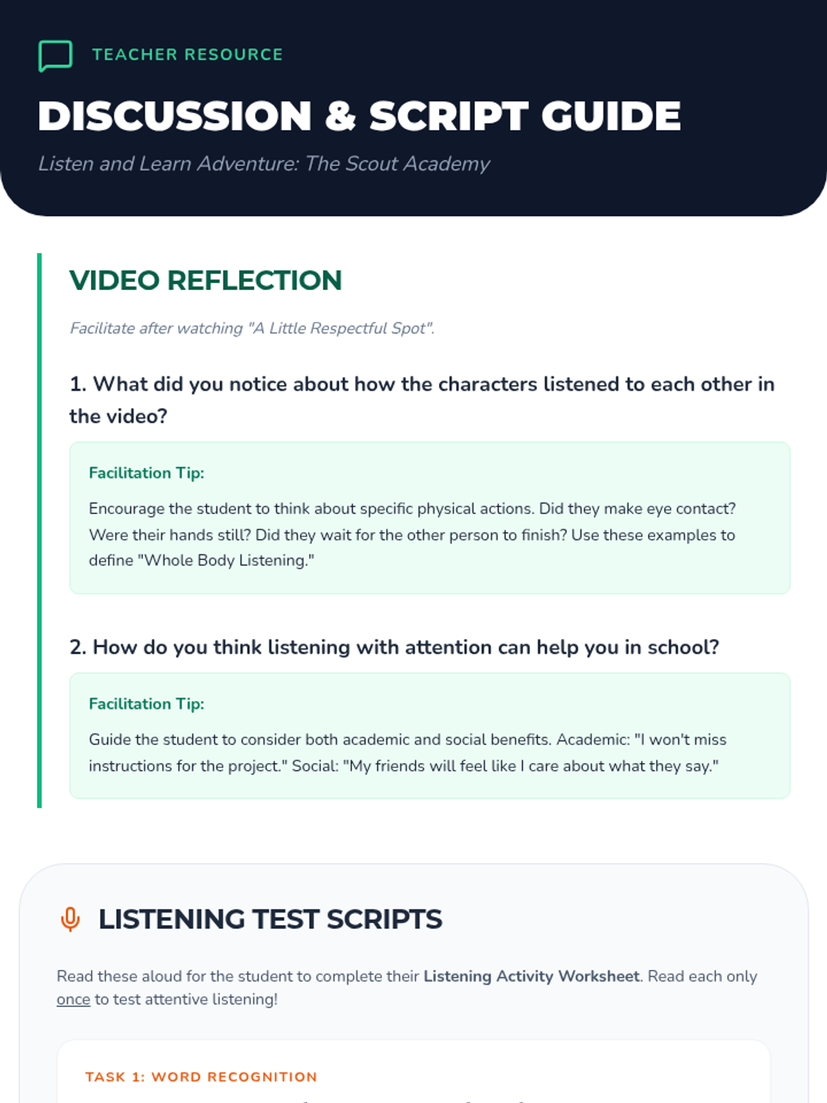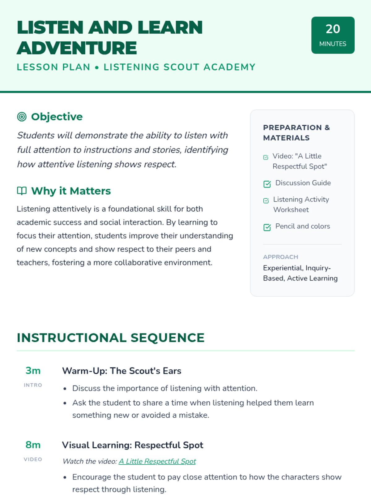 A 20-minute lesson designed for 3rd-grade students to develop attentive listening skills through storytelling and interactive activities. Students learn how listening shows respect and improves communication using the theme of a 'Listening Scout'.