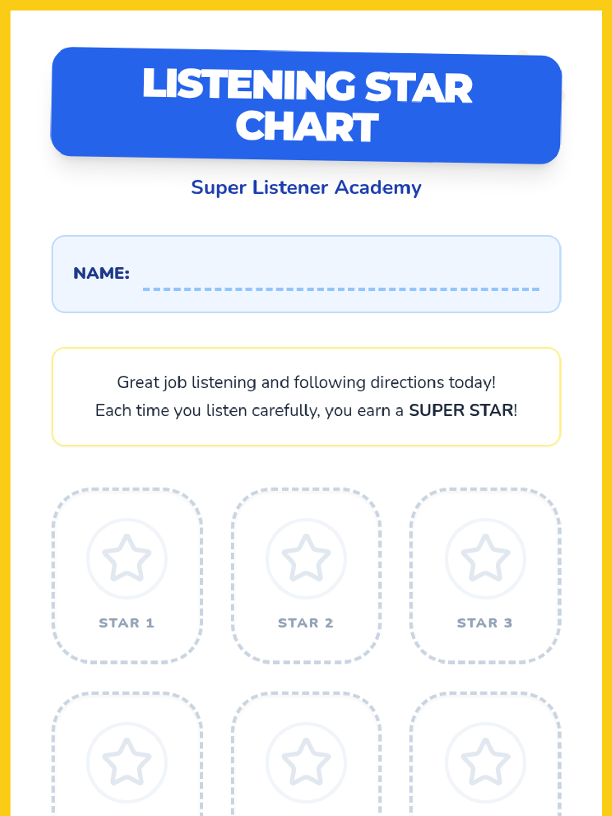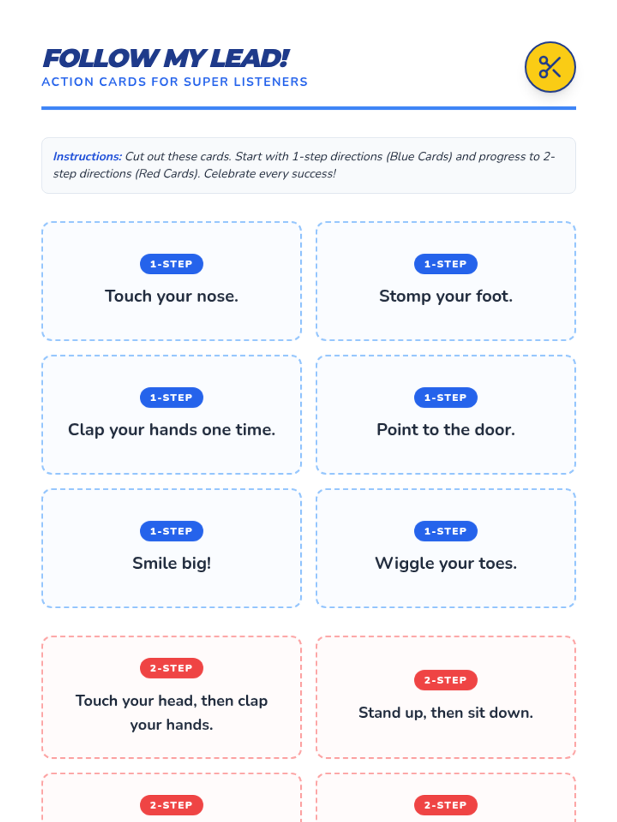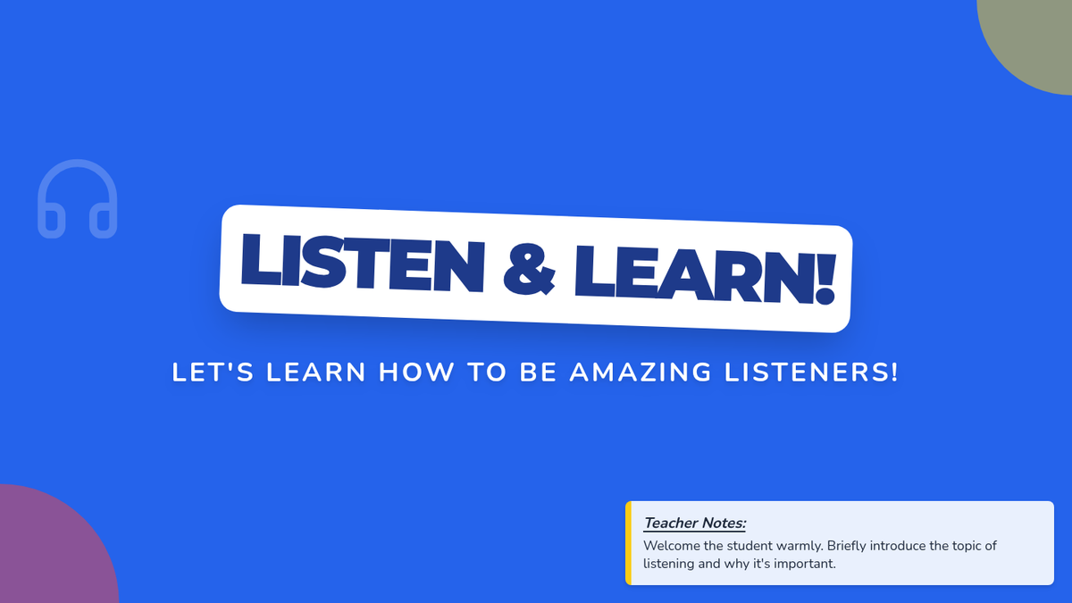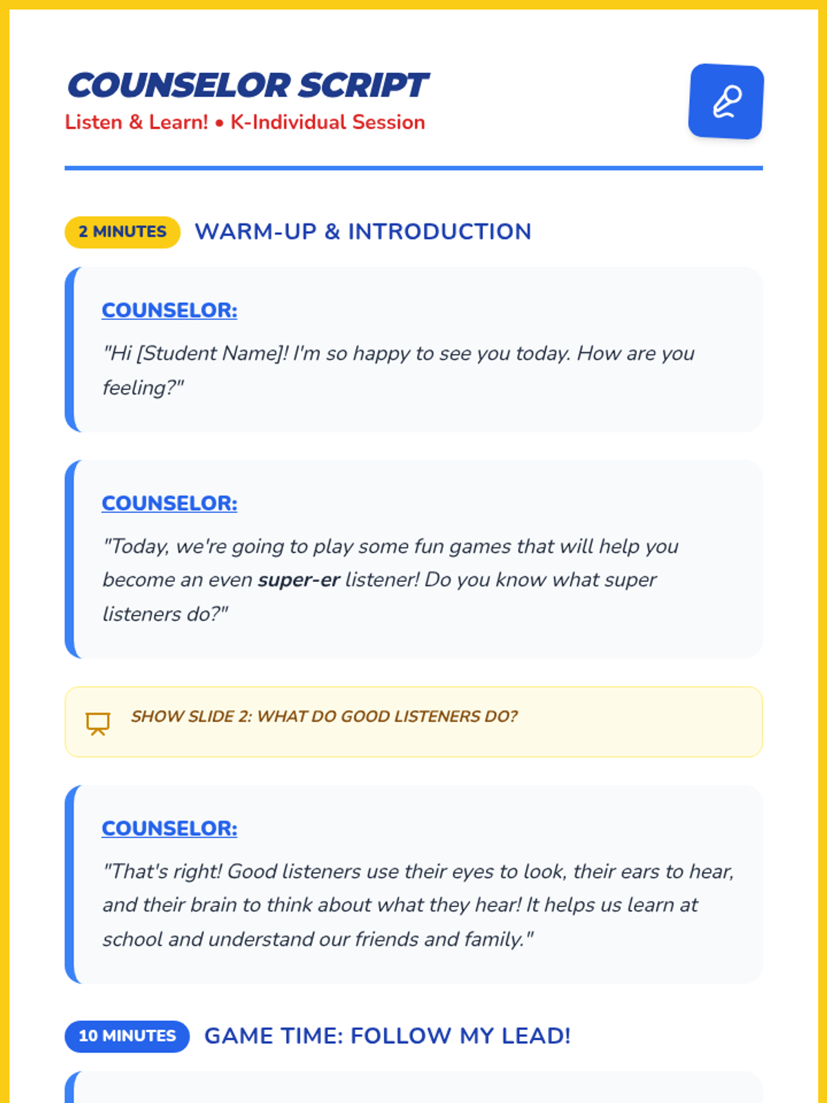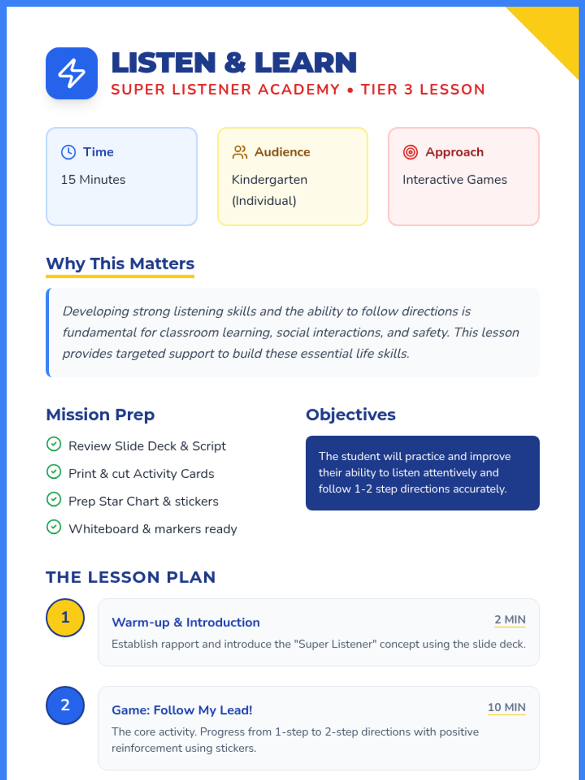 A 15-minute intensive individual counseling session for Kindergarten students focusing on developing core listening skills and the ability to follow 1-2 step directions through interactive games and positive reinforcement.
