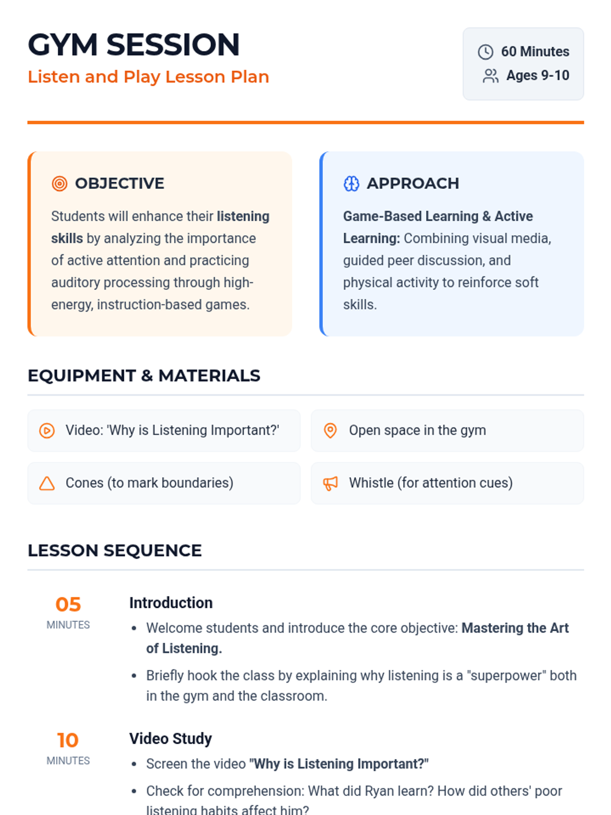 An active, game-based lesson for 9-10 year olds focused on developing critical listening skills through a video study, guided discussion, and a high-energy 'Simon Says' gym session.