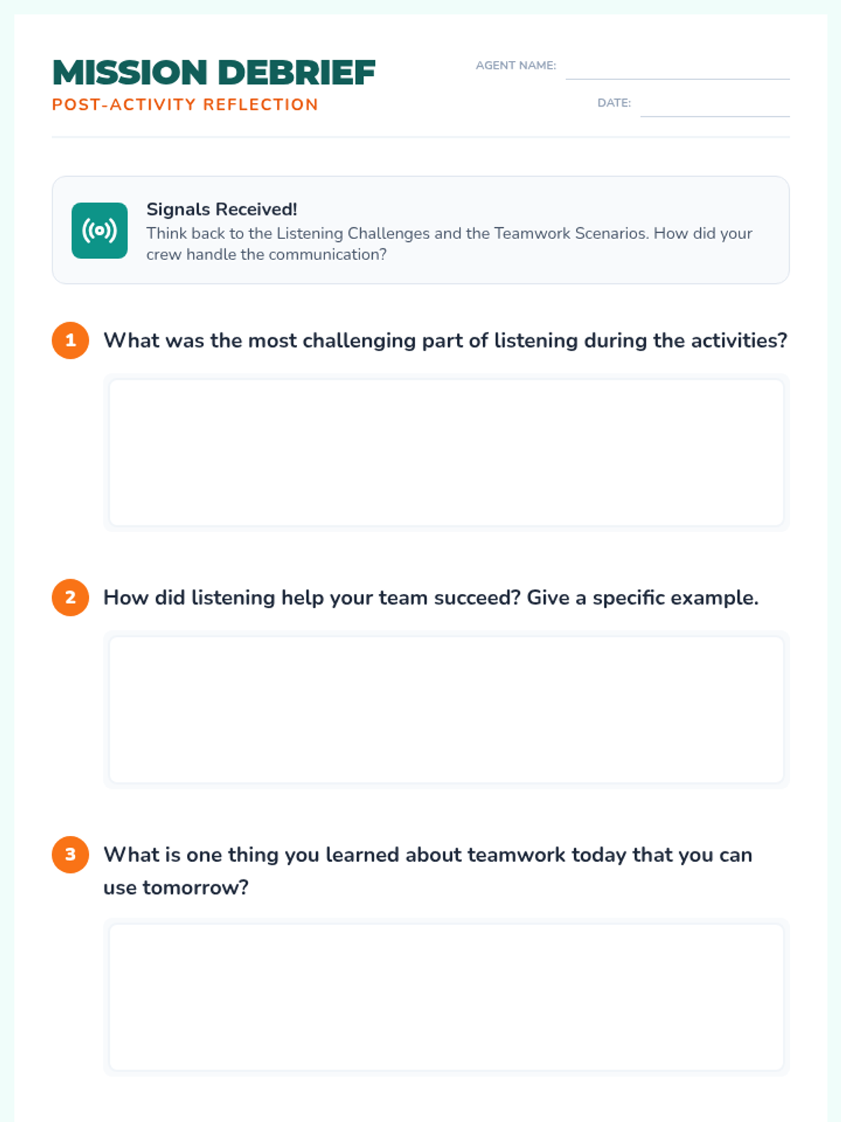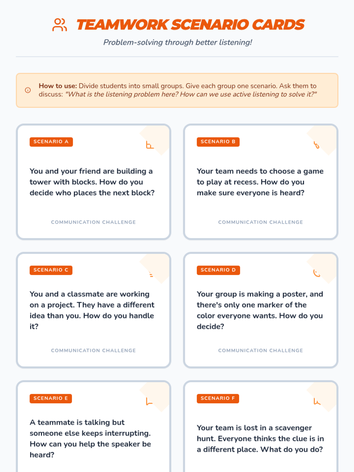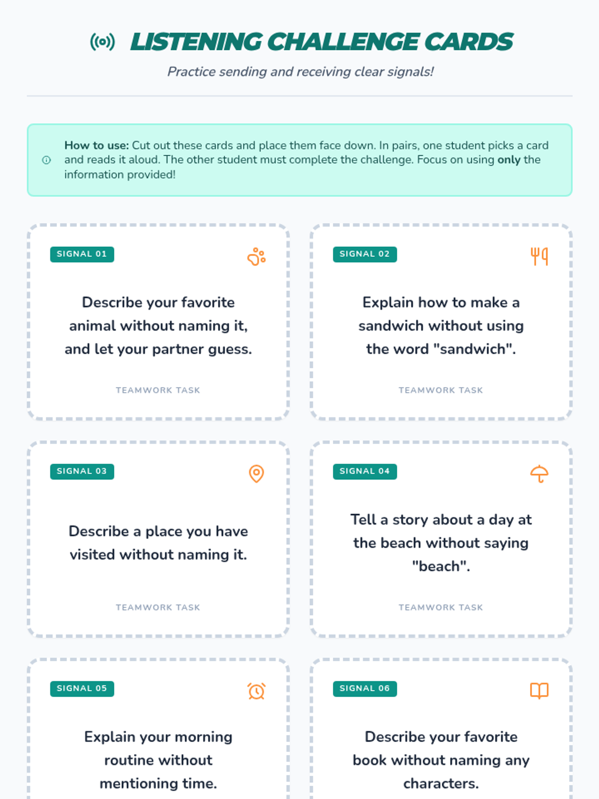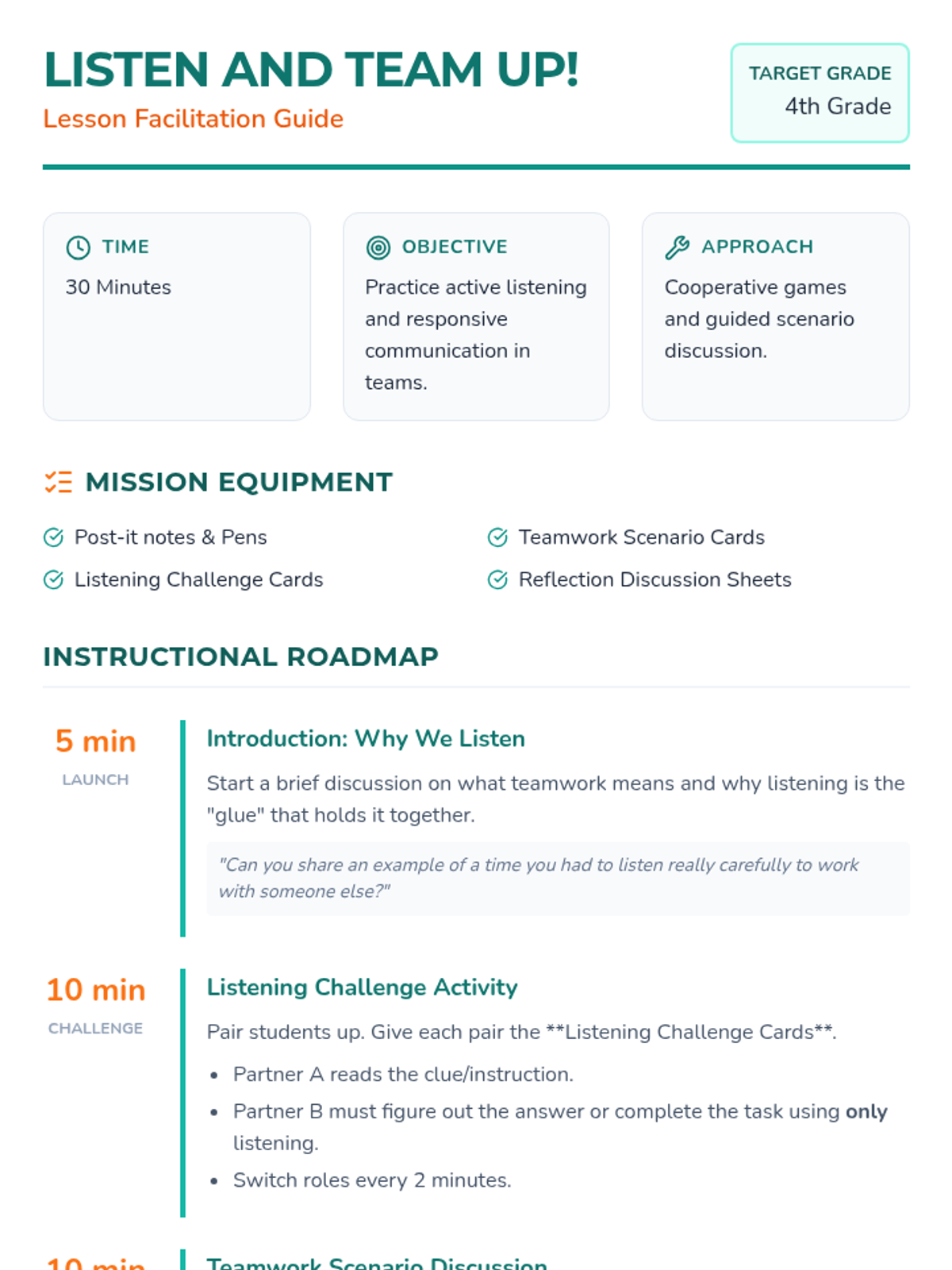 A high-energy lesson for 4th graders focused on developing active listening skills through collaborative challenges and scenario-based problem solving. Students will learn that teamwork is only as strong as the communication between its members.