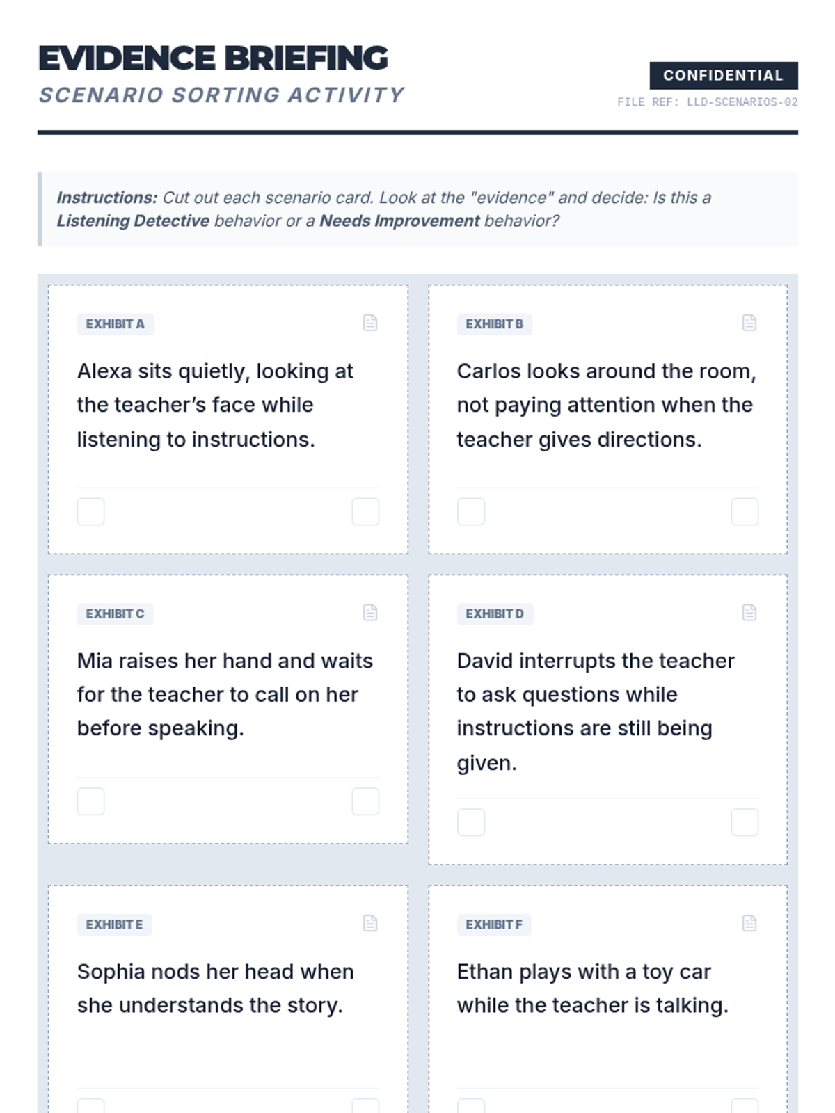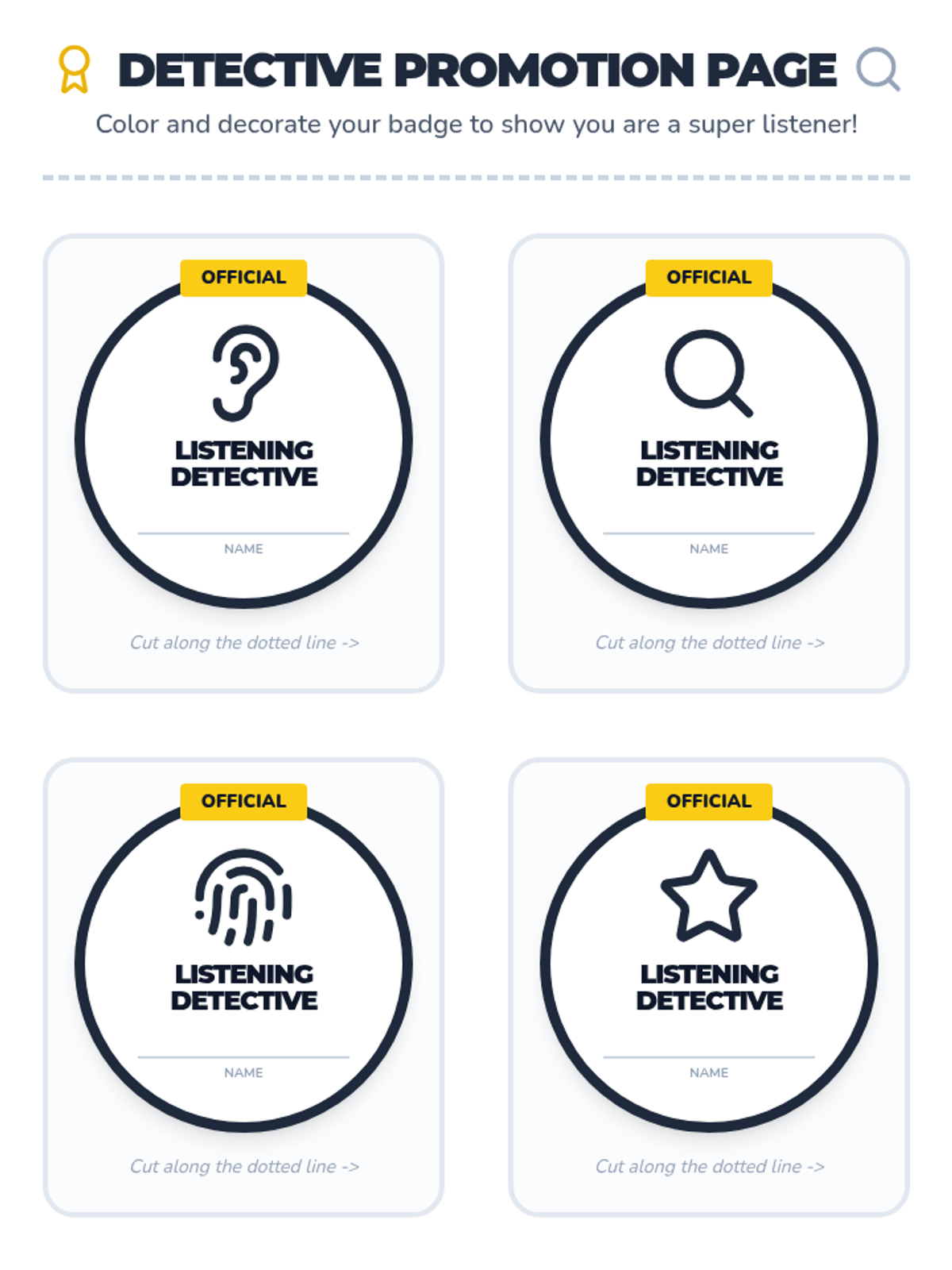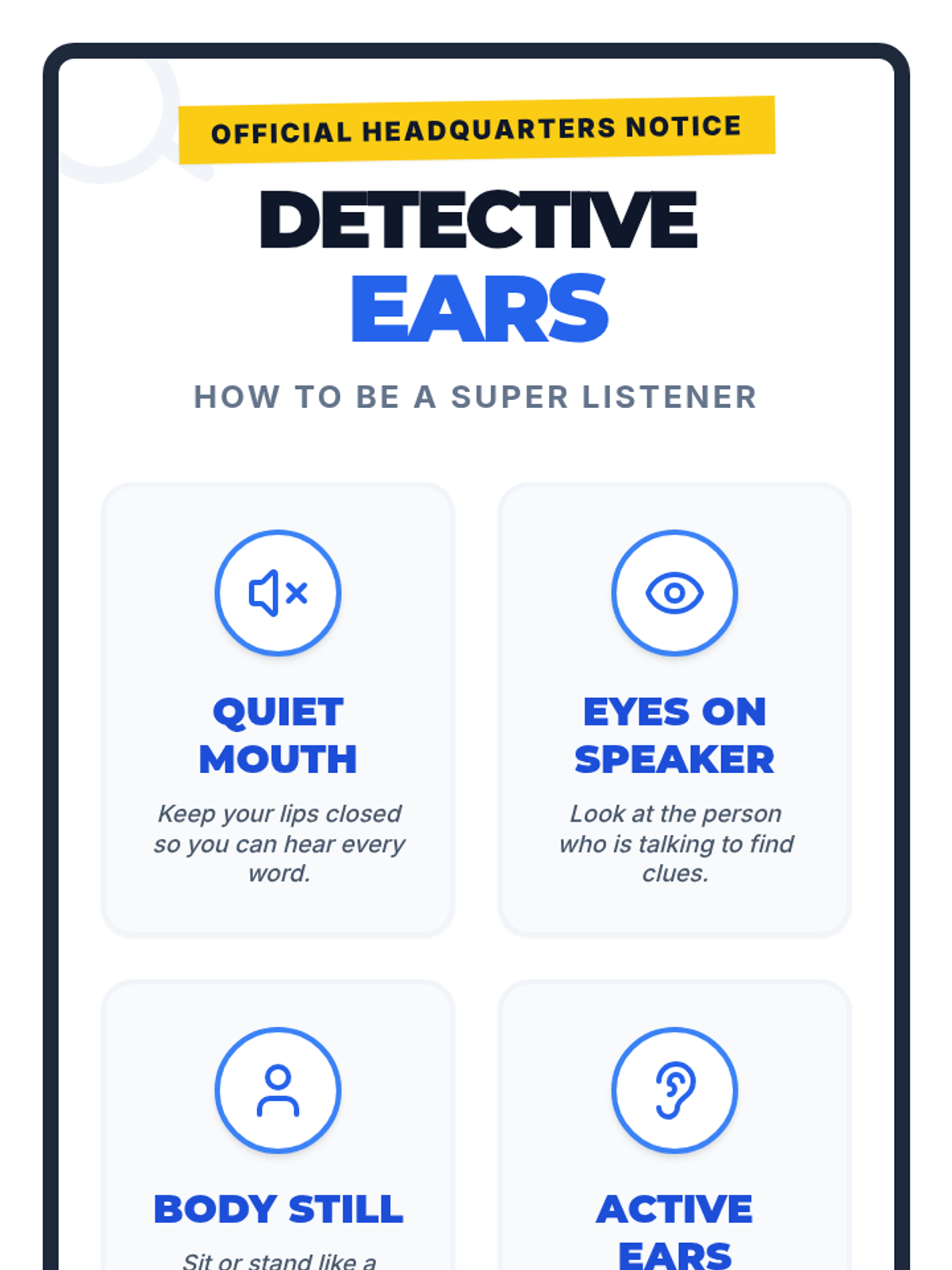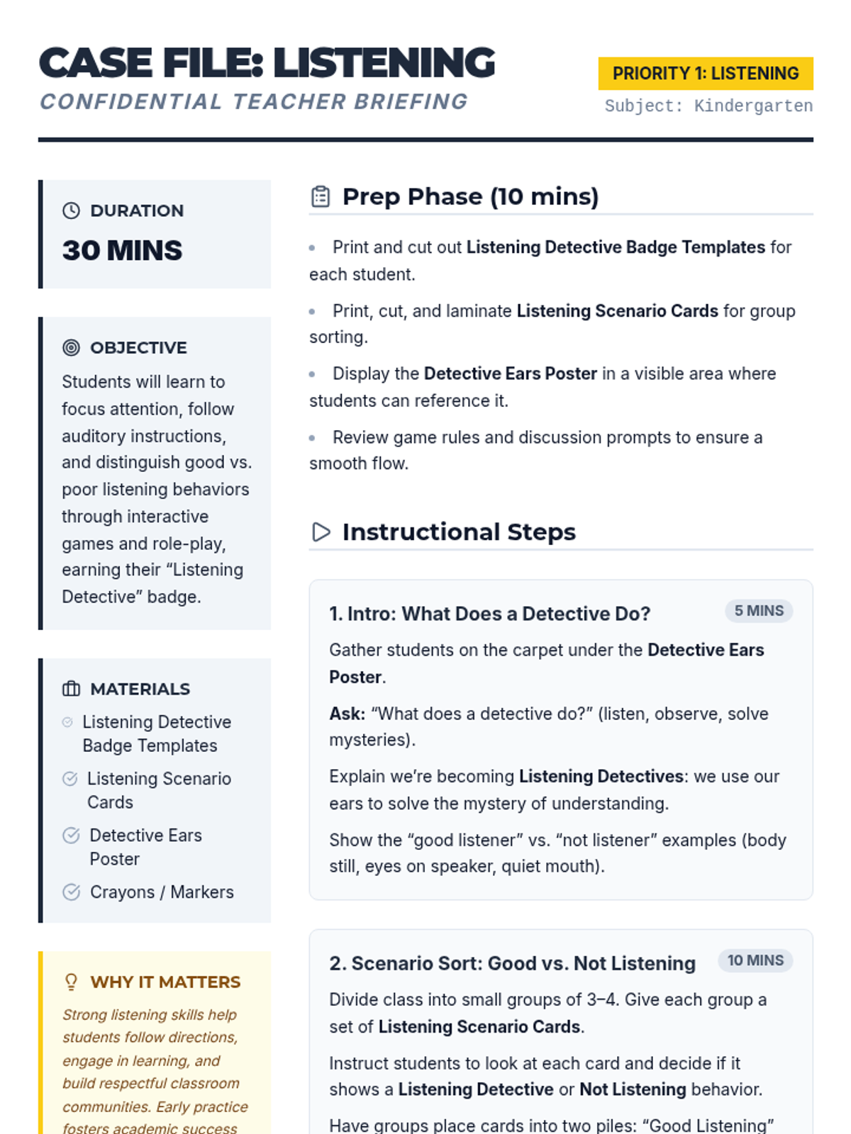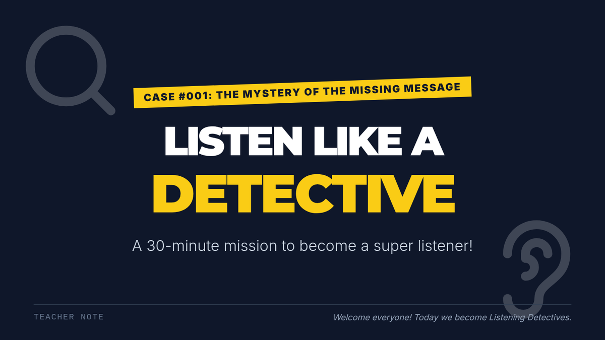 A fun 30-minute lesson for kindergarteners to develop essential listening skills through interactive detective-themed games and activities. Students learn to focus attention, follow directions, and distinguish good listening behaviors to earn their 'Listening Detective' badge.