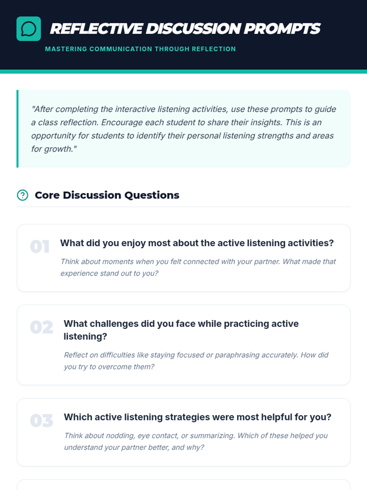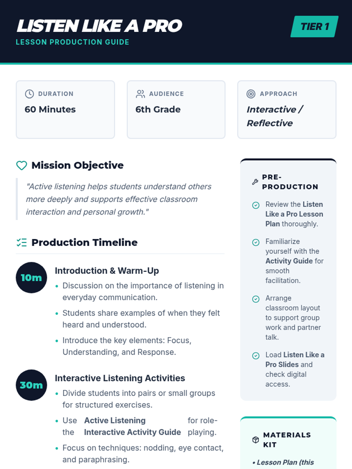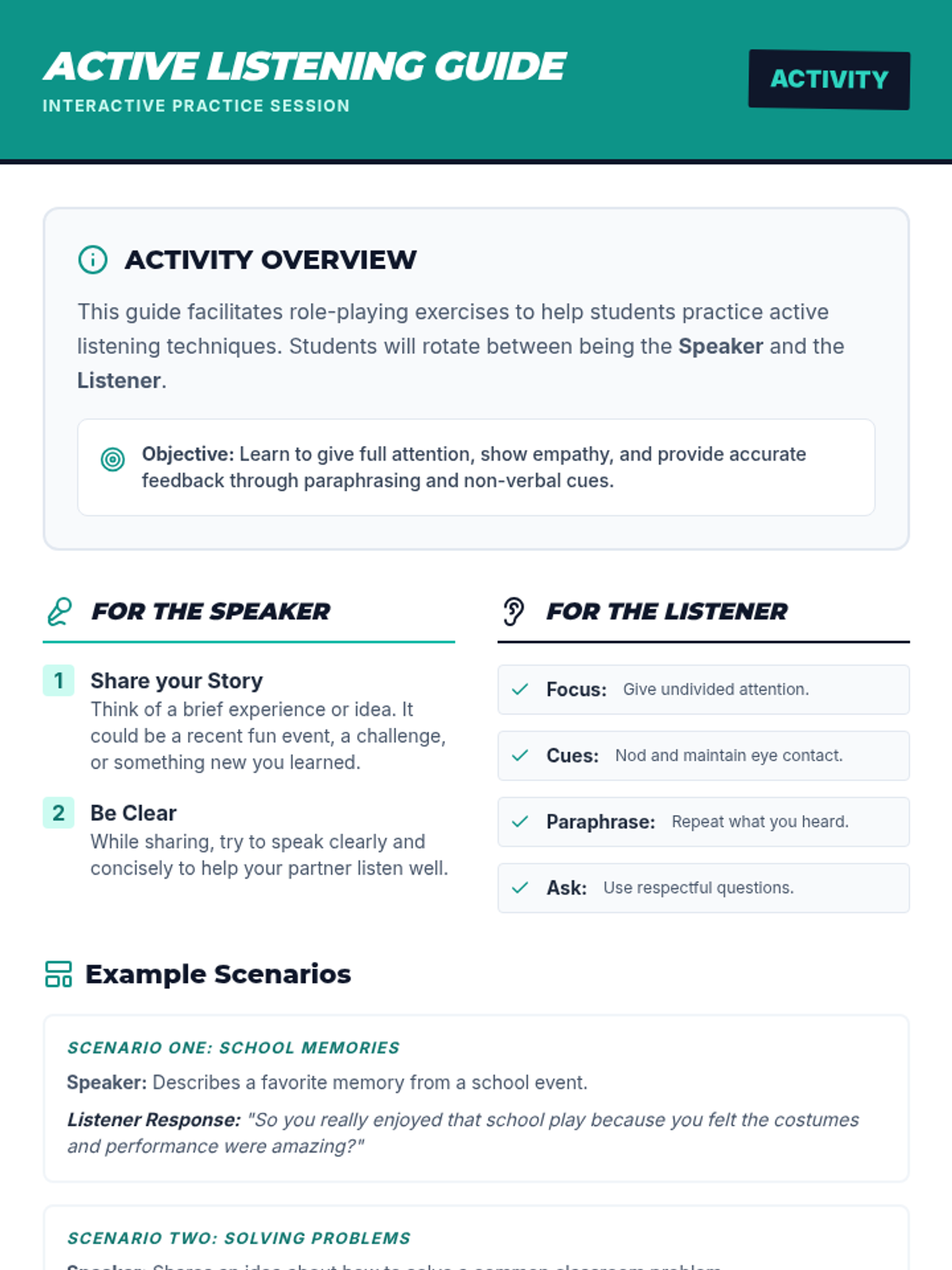A 60-minute lesson for 6th graders on active listening, featuring interactive role-playing activities, guided reflections, and practical communication techniques to build better relationships.