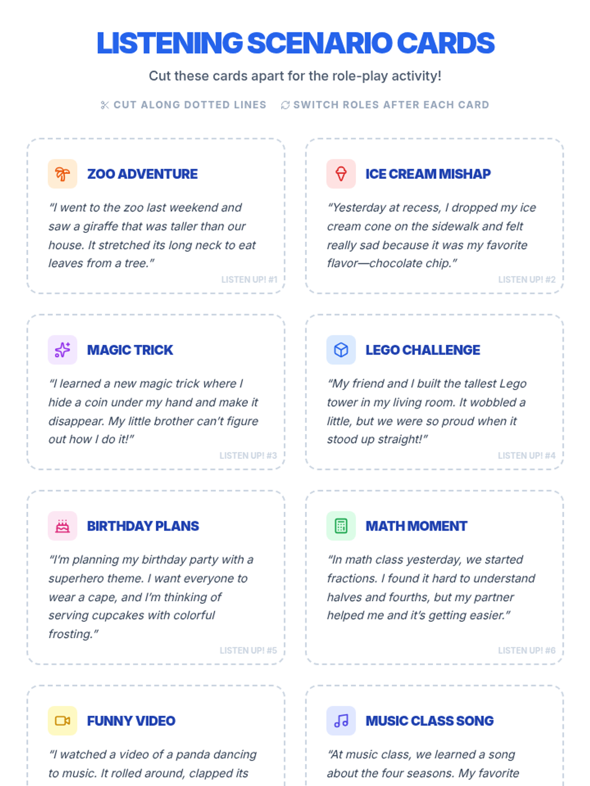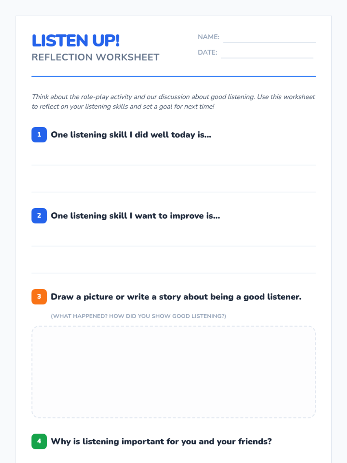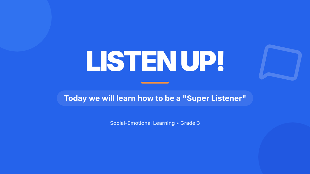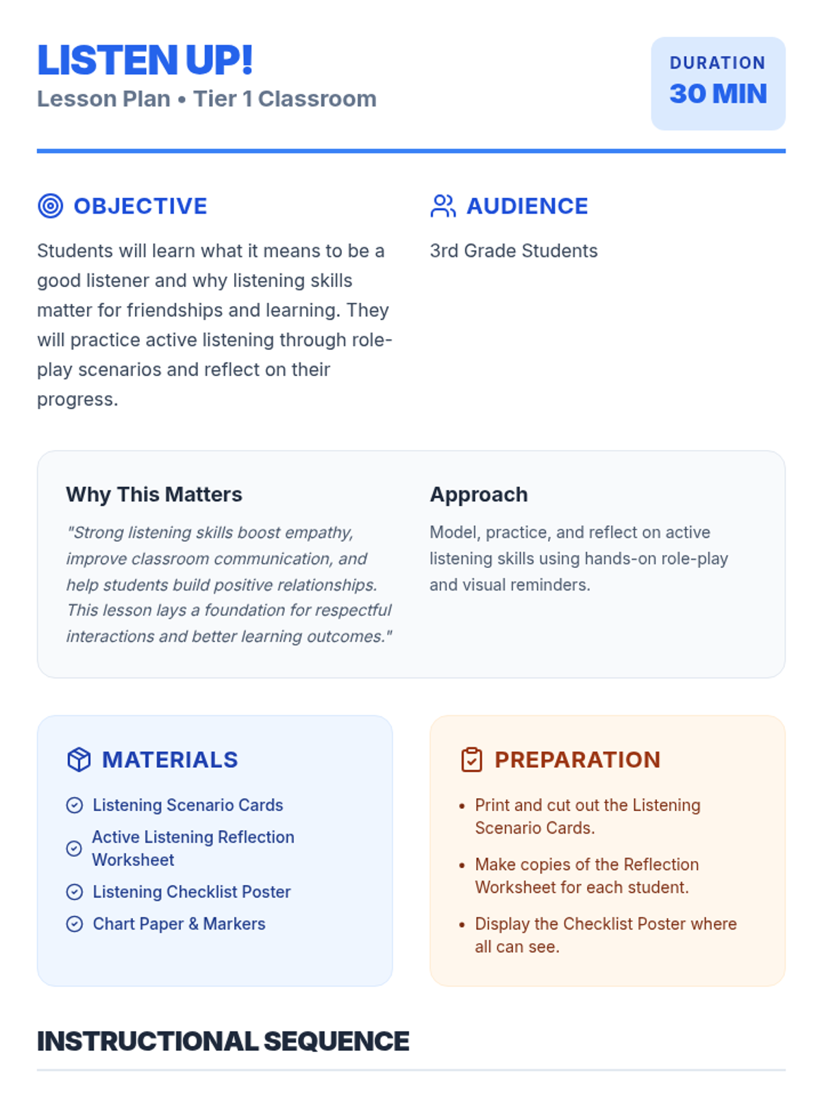 A 30-minute social-emotional learning lesson for 3rd graders focused on developing active listening skills through modeling, role-play, and reflection. Students learn key behaviors like eye contact and nodding to build better friendships and classroom habits.