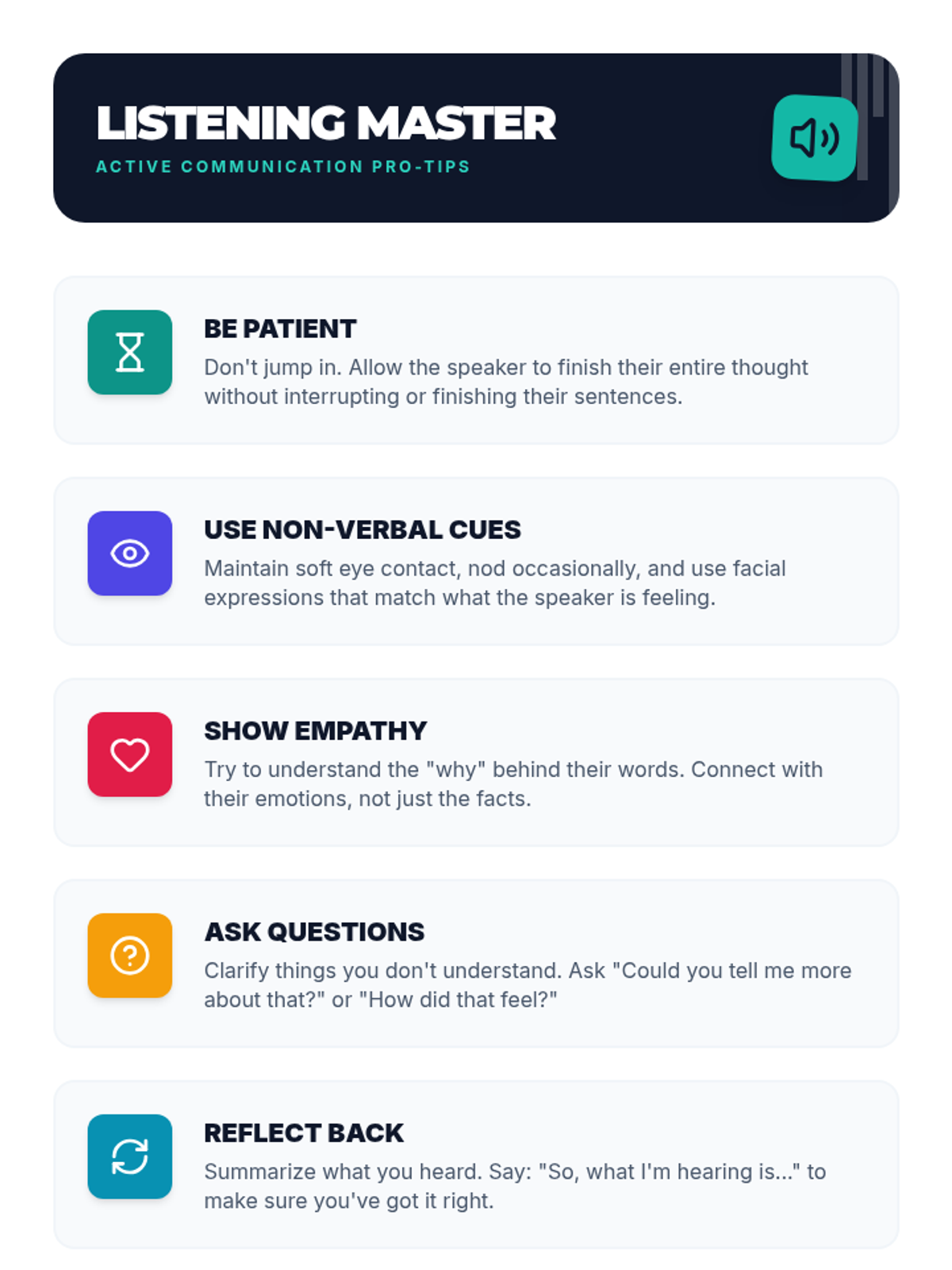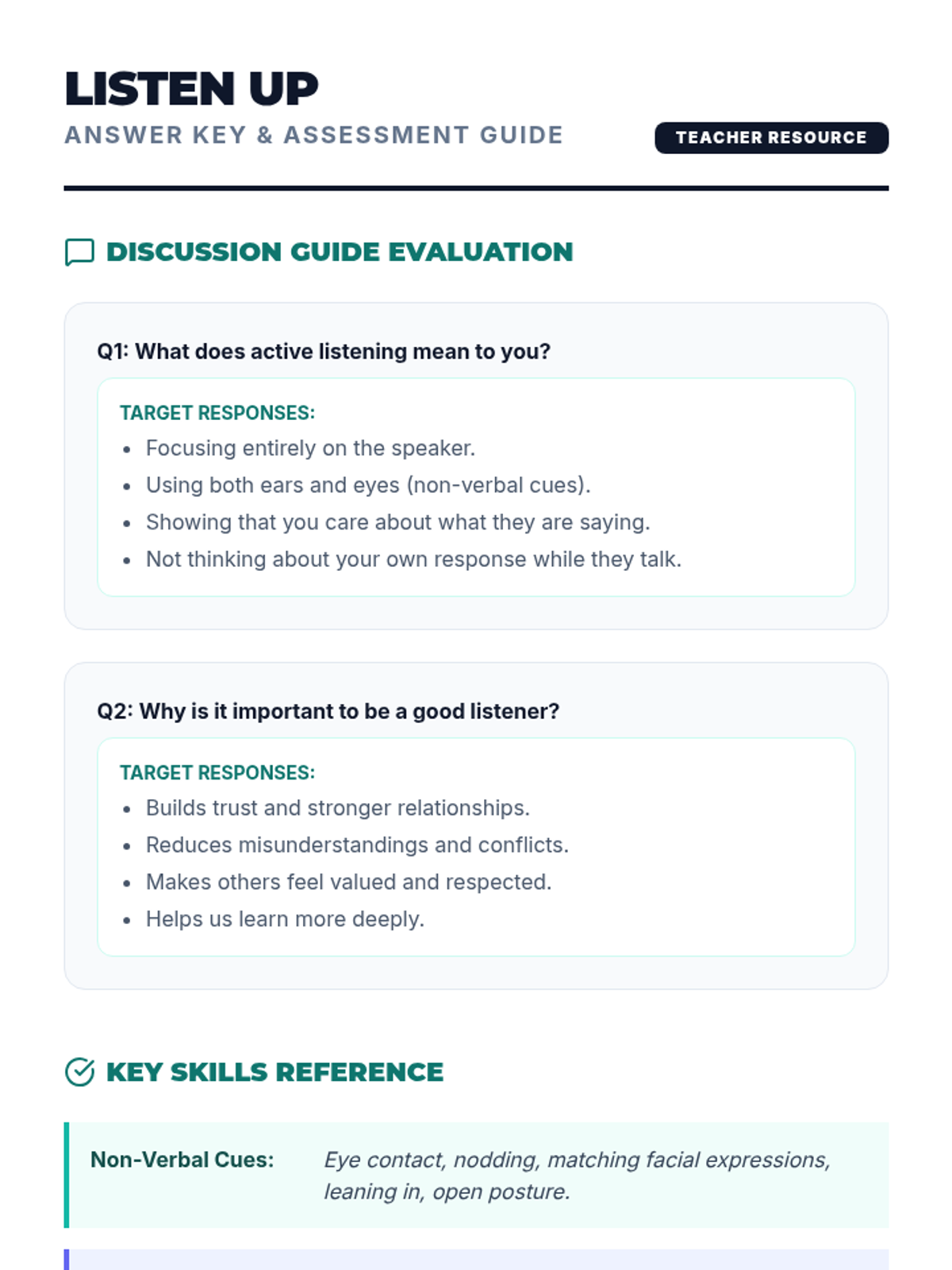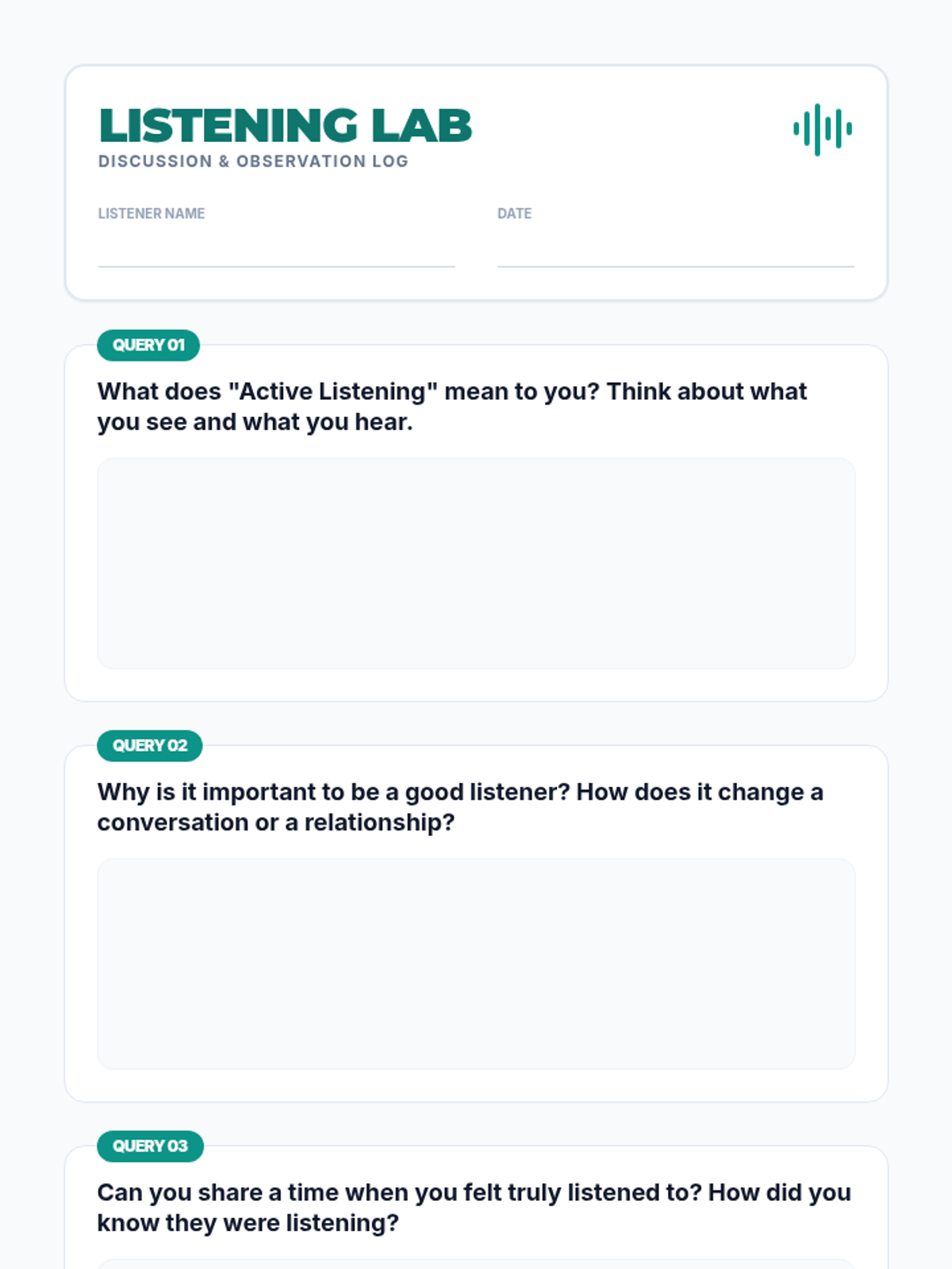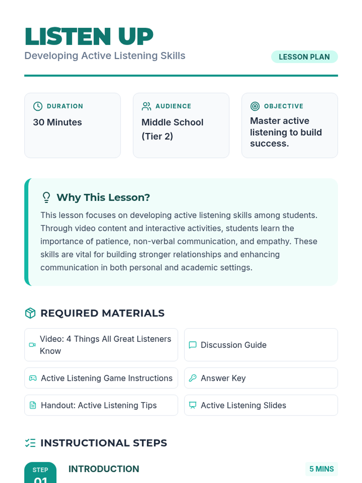 A Tier 2 lesson for middle school students focused on developing active listening skills through video analysis, discussion, and role-playing games. Students learn to apply patience, non-verbal communication, and empathy to build stronger relationships.