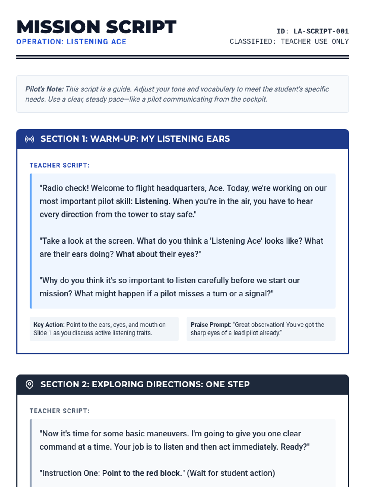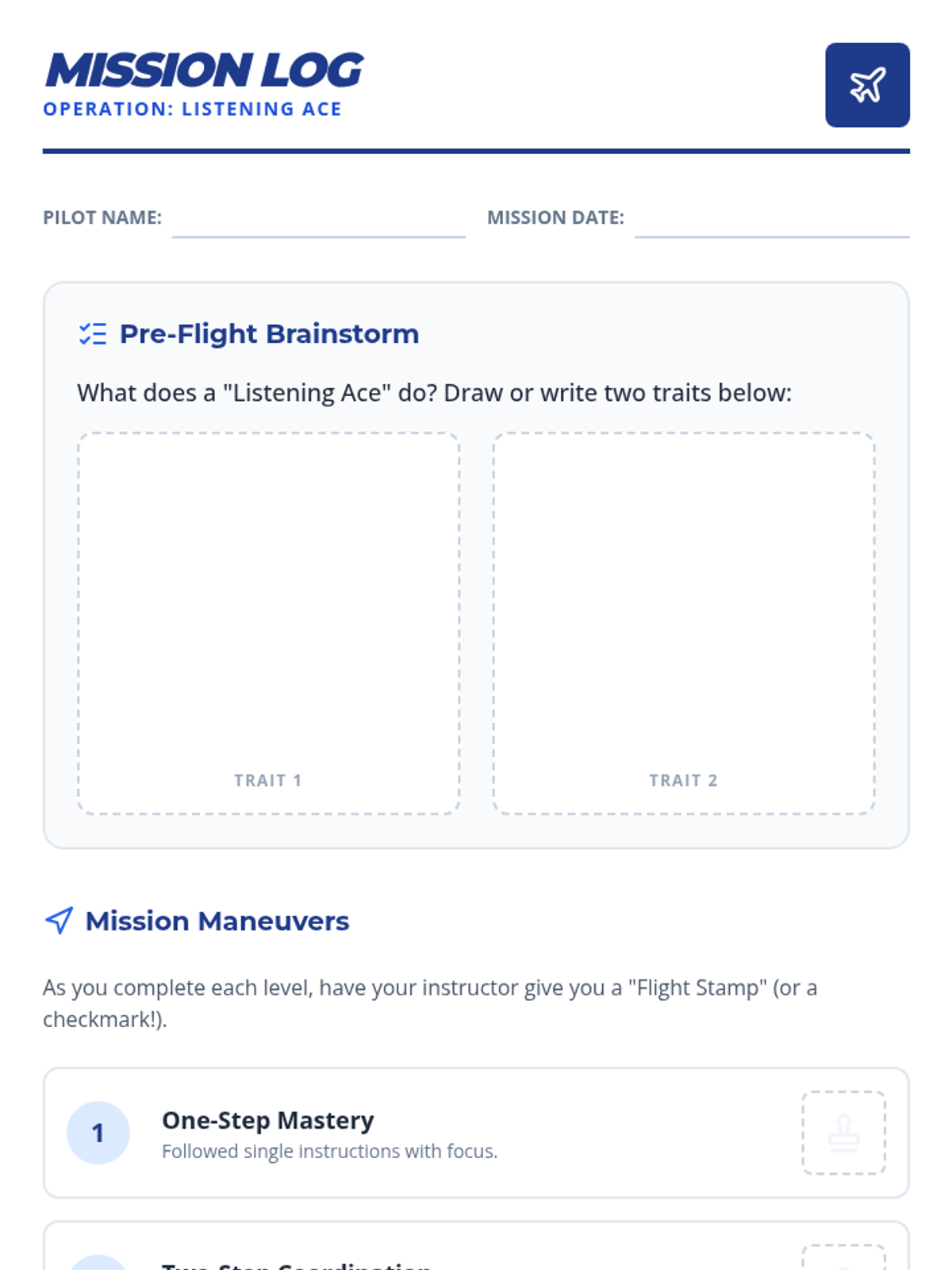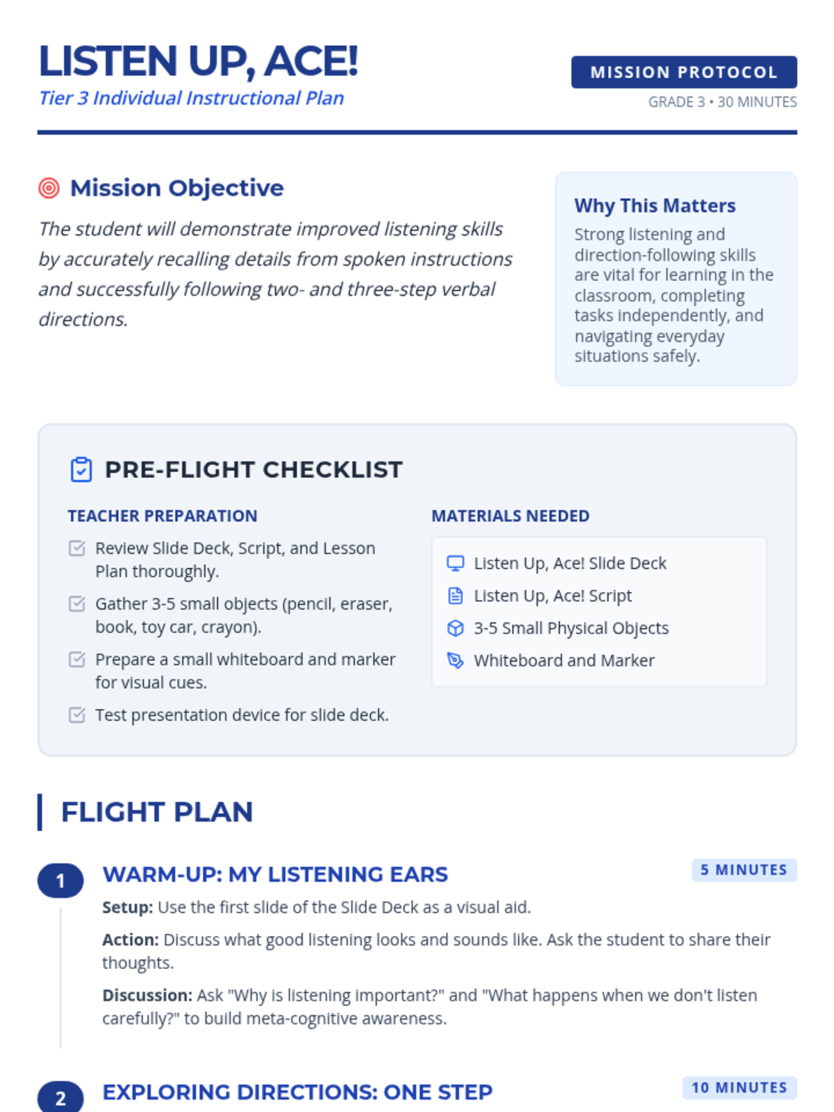 A personalized Tier 3 lesson for 3rd graders focused on mastering active listening and following multi-step directions through interactive 'Ace Pilot' themed activities.