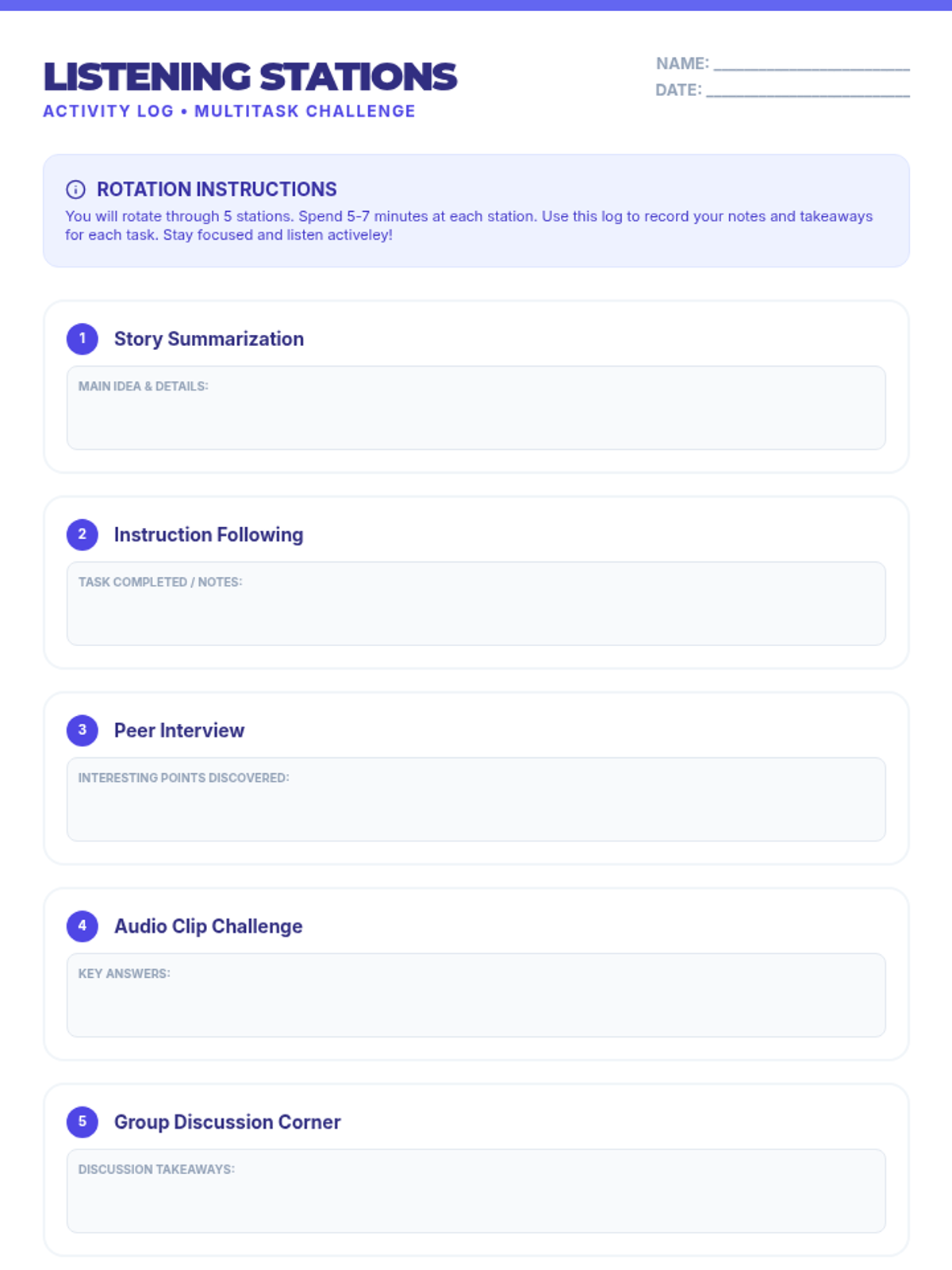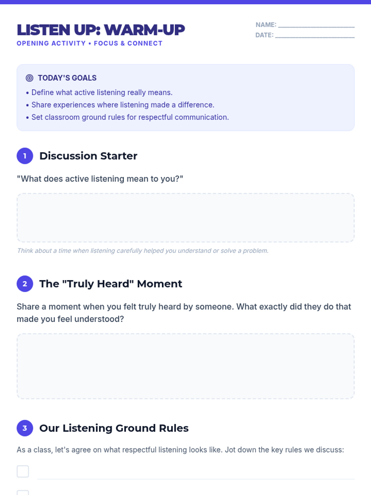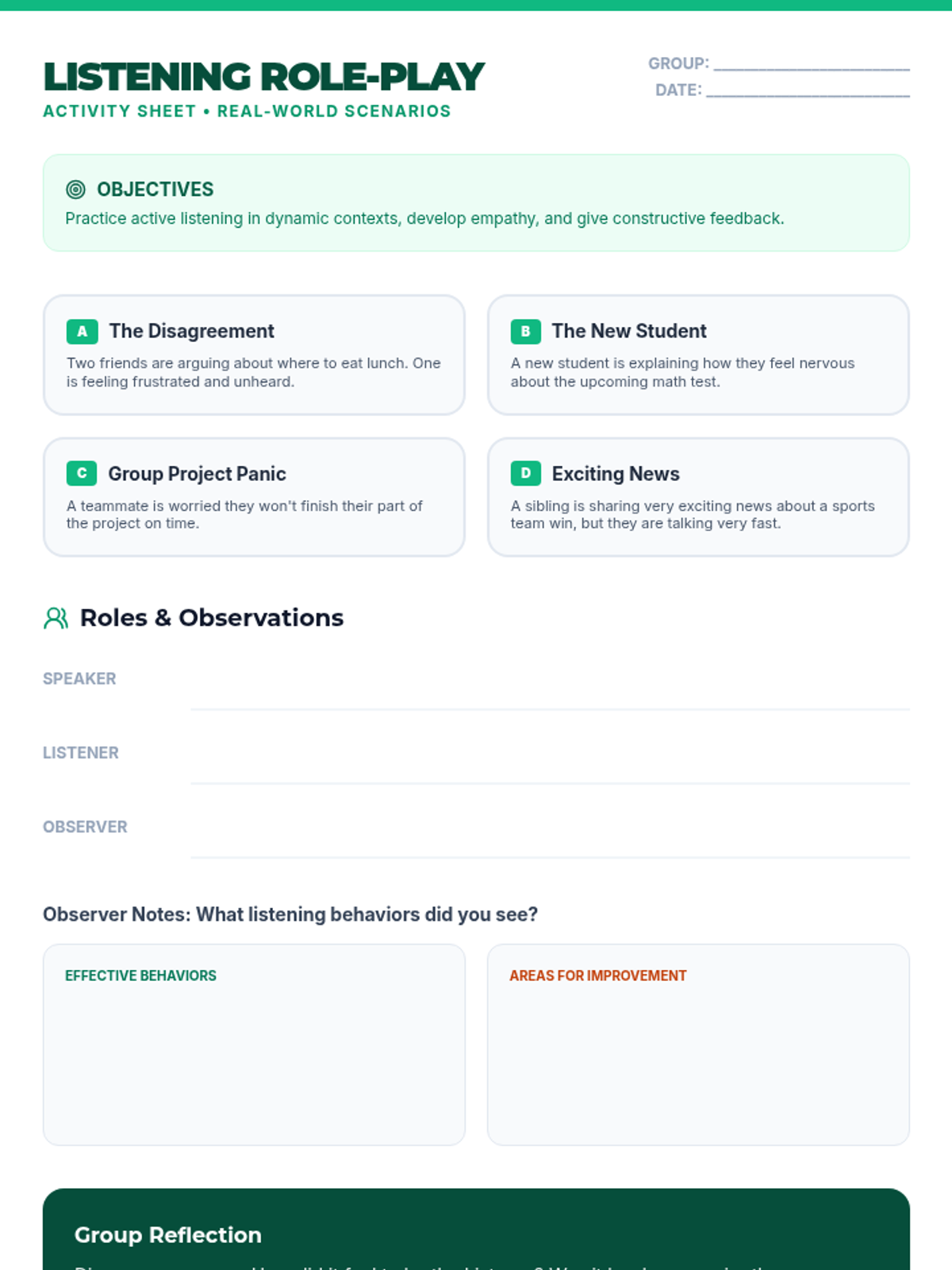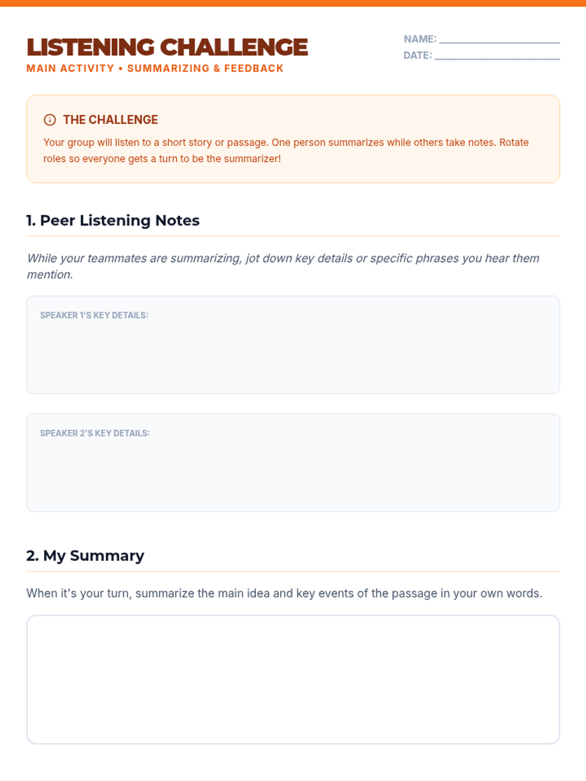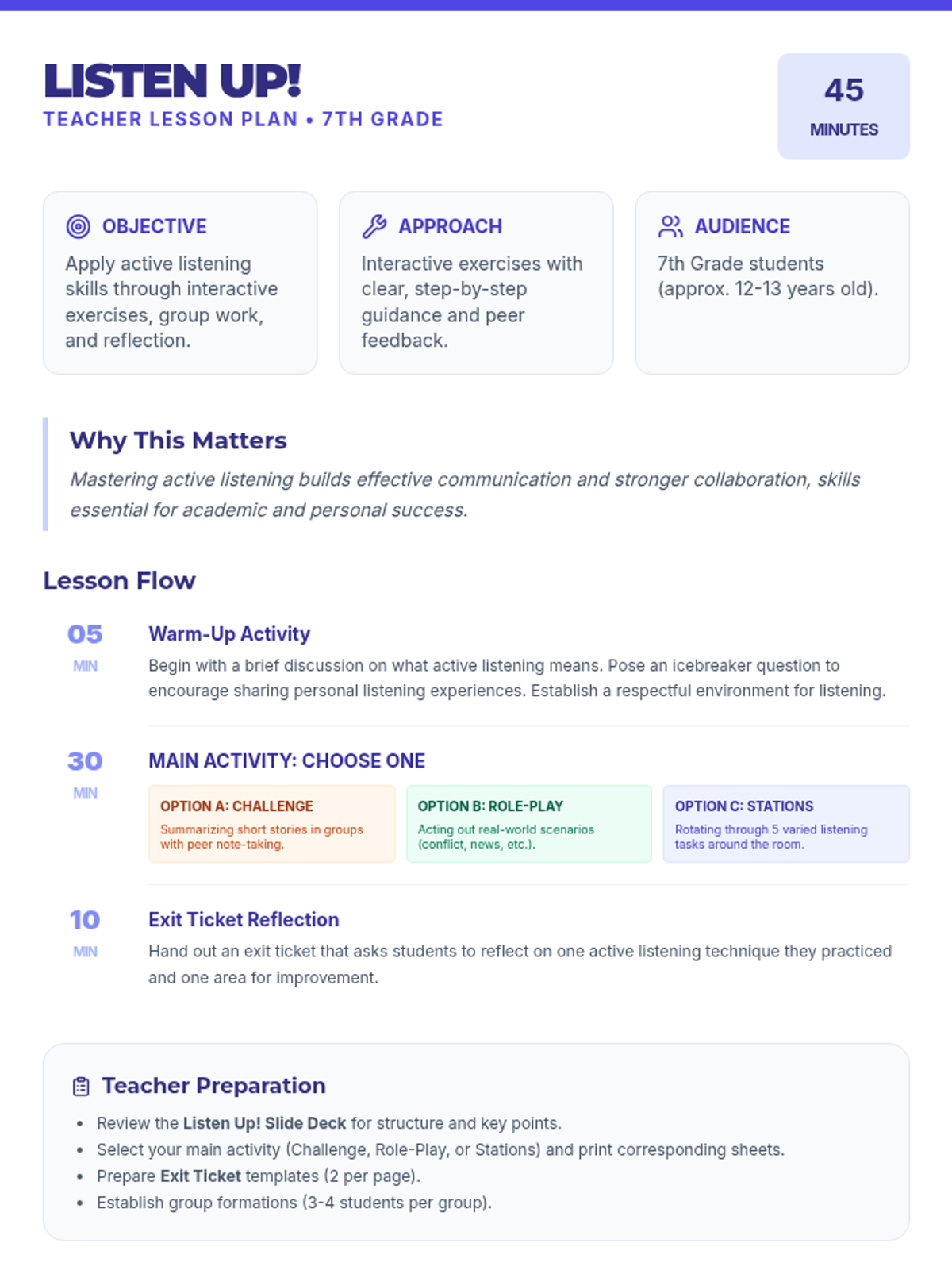 An interactive lesson for 7th graders focusing on active listening skills, including summarizing, summarizing, and providing constructive feedback through various engaging activities.
