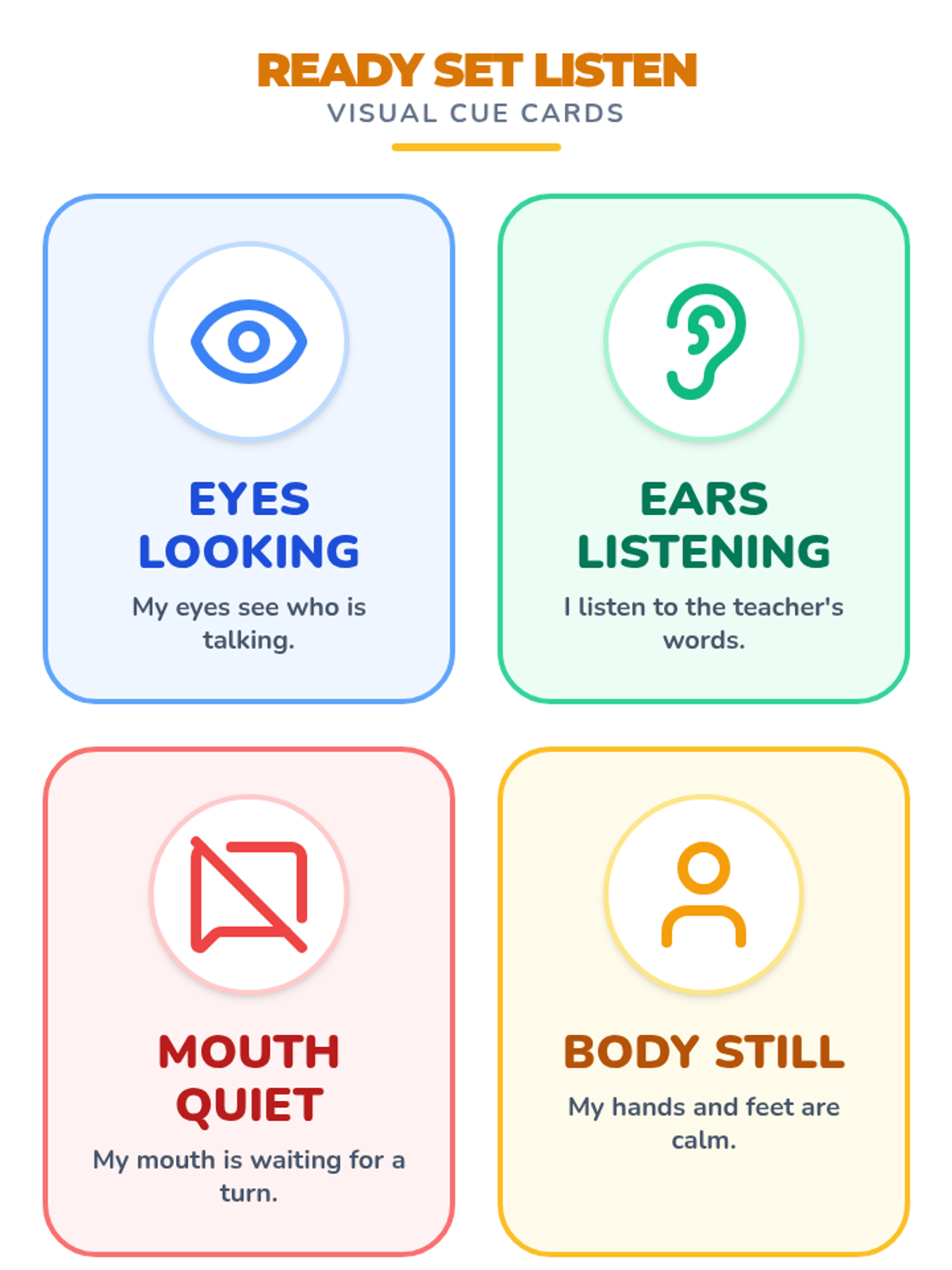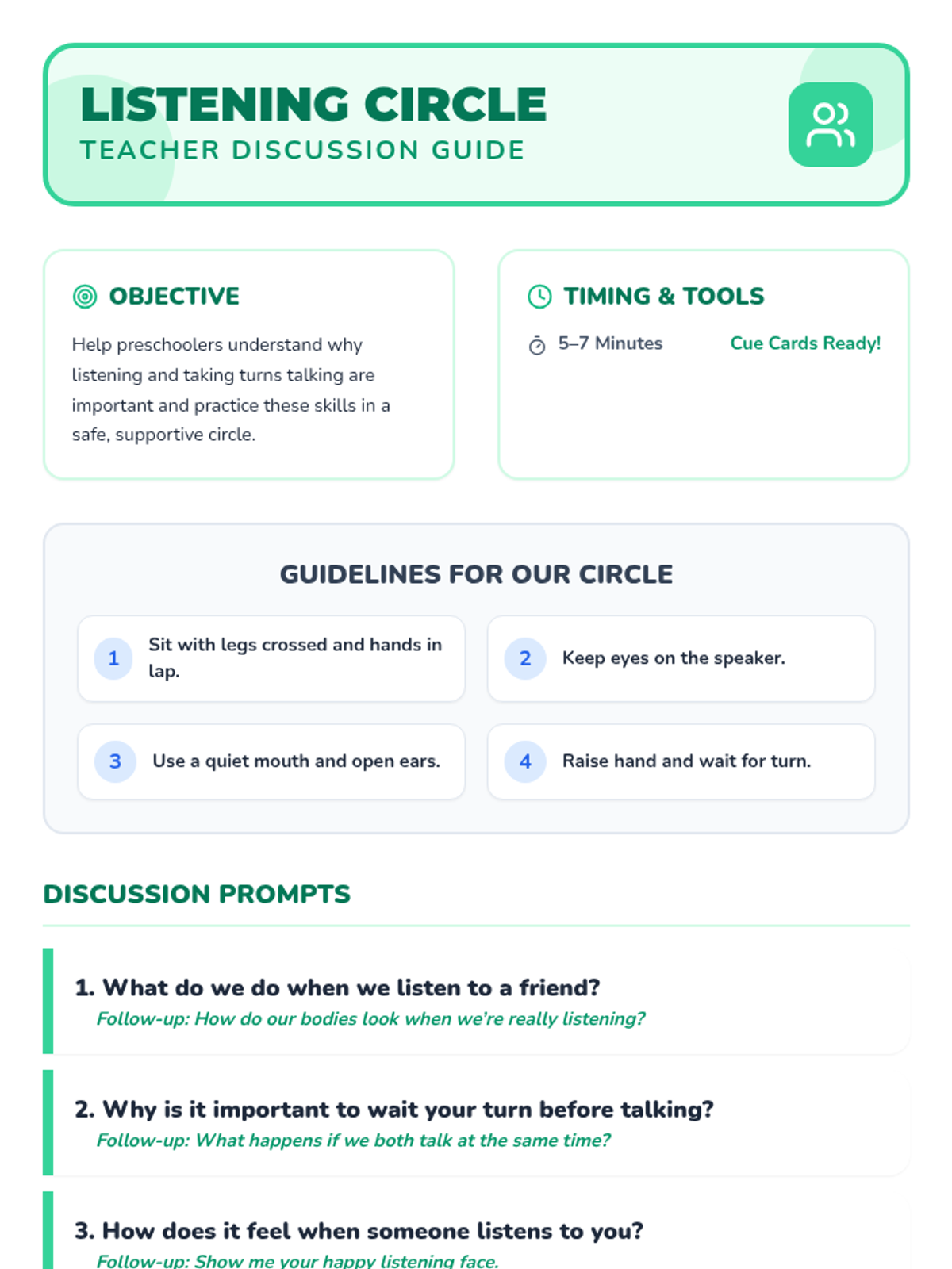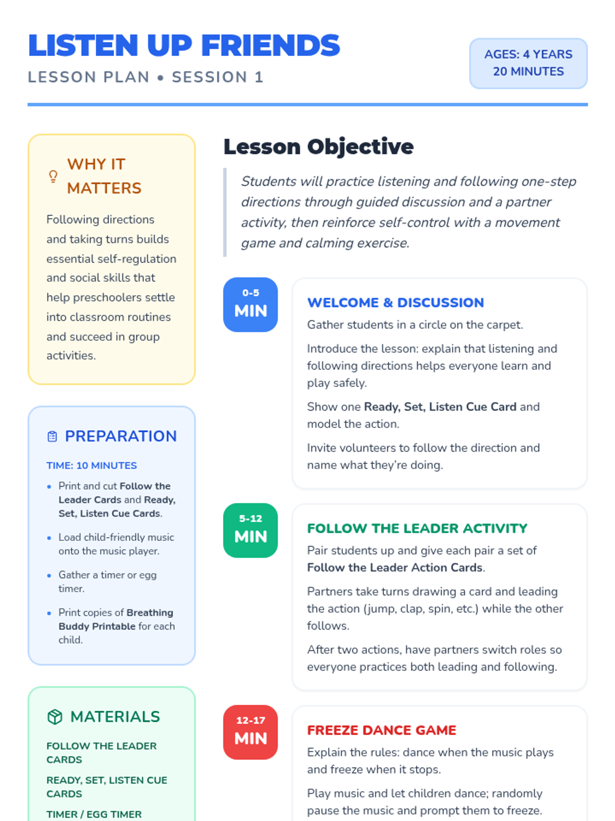 Students practice listening and following one-step directions through guided circle time, movement games like Freeze Dance, and a calming breathing exercise.