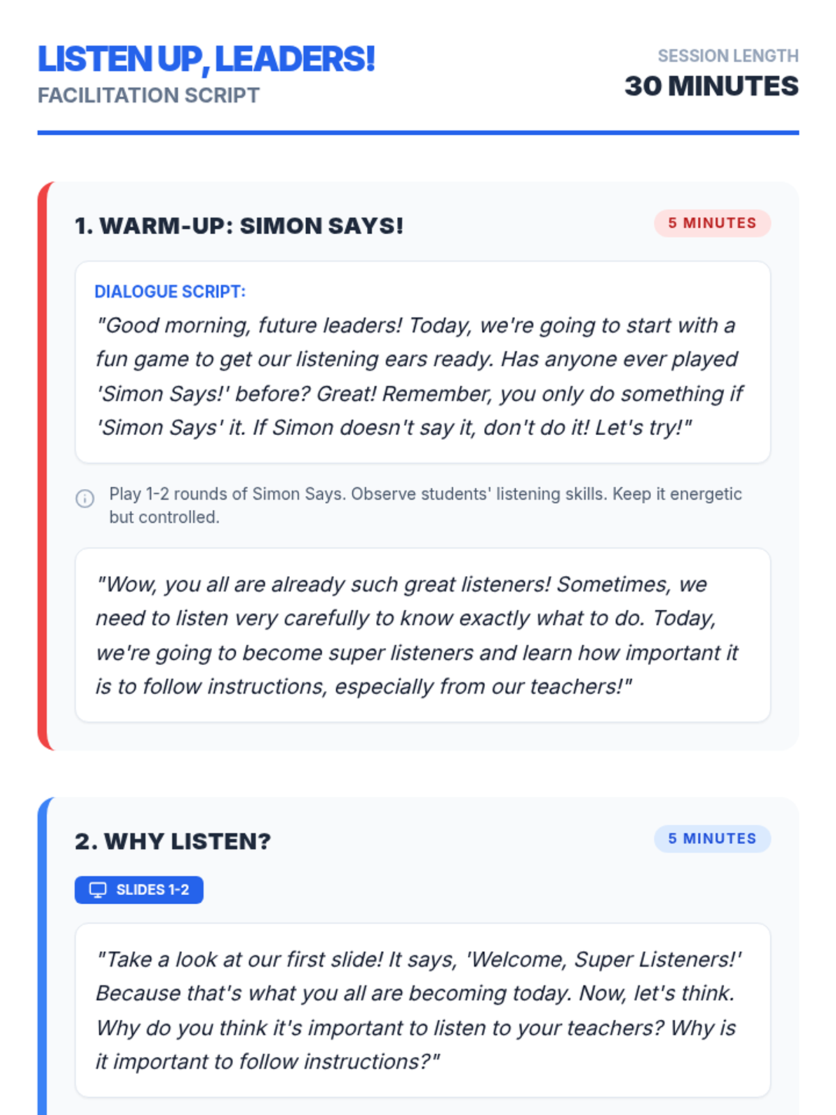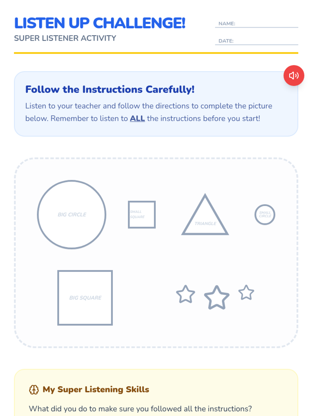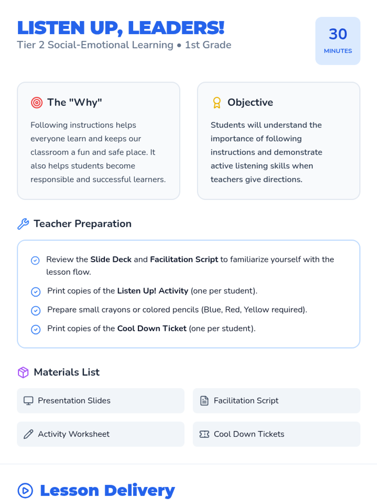 A 30-minute social-emotional learning lesson for 1st graders focusing on the importance of following instructions and practicing active listening skills through interactive games and a listening challenge.