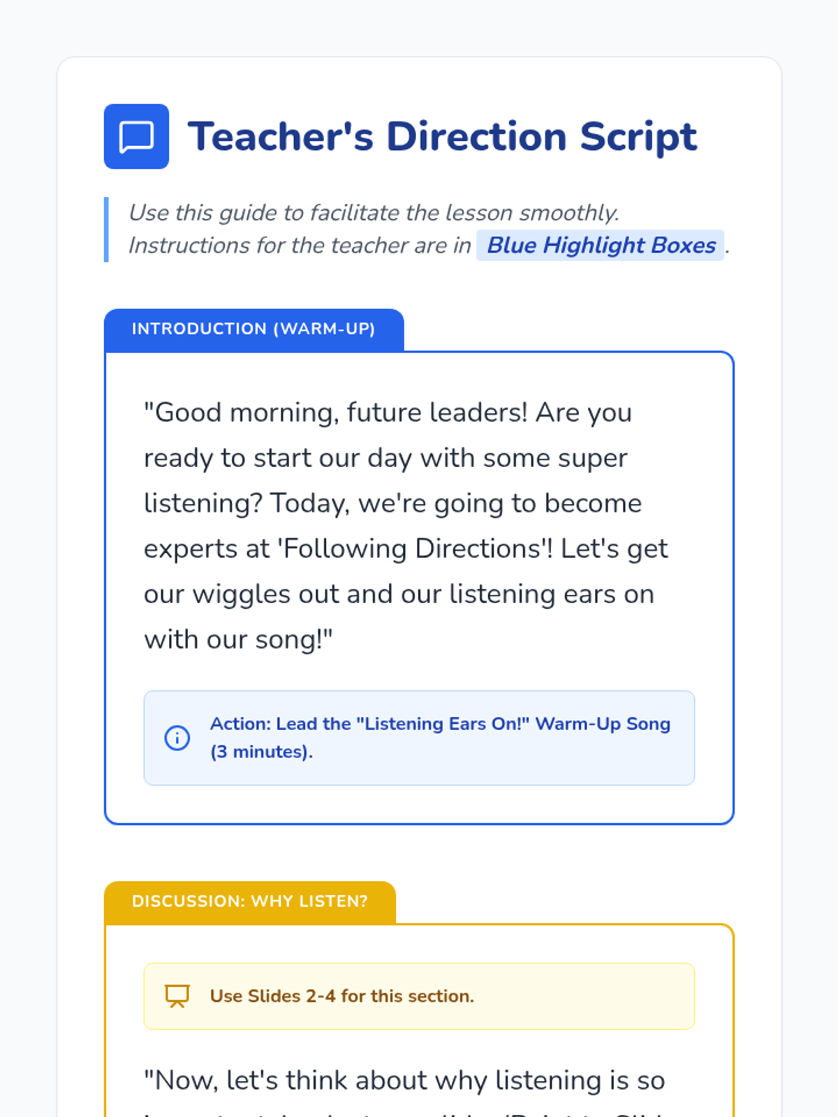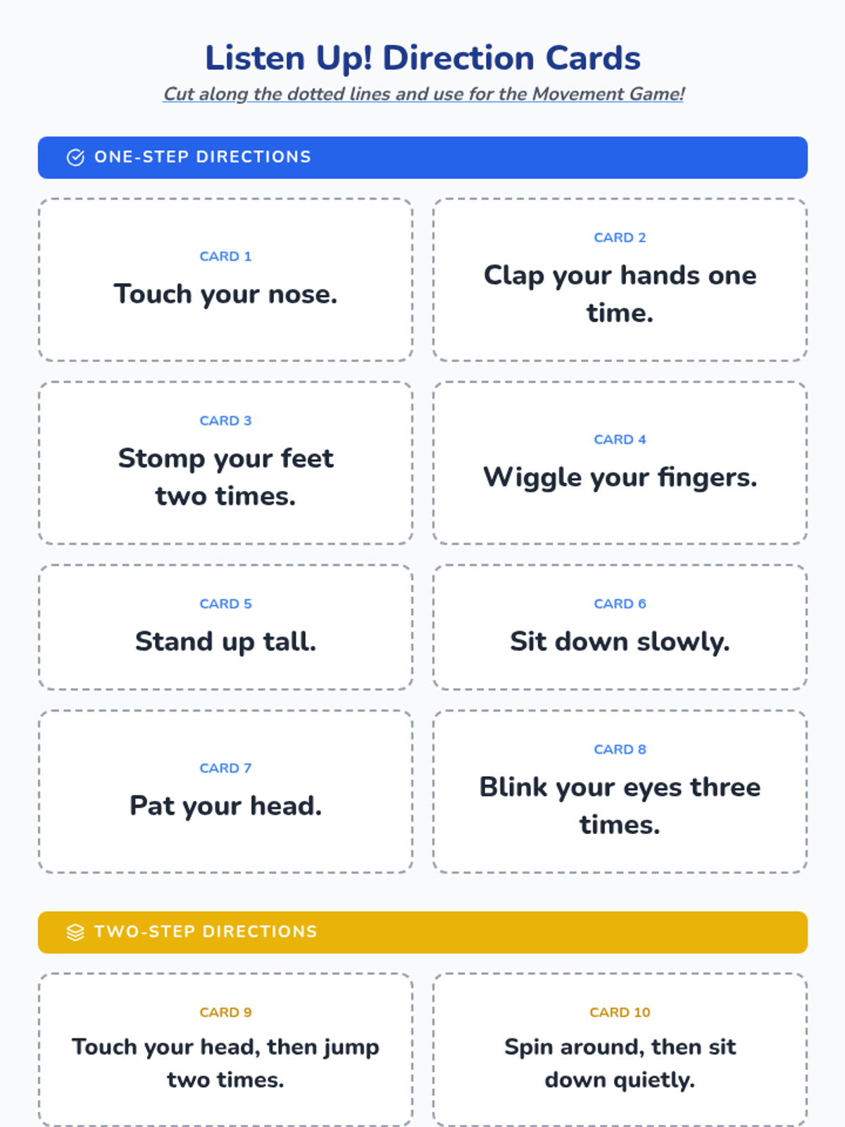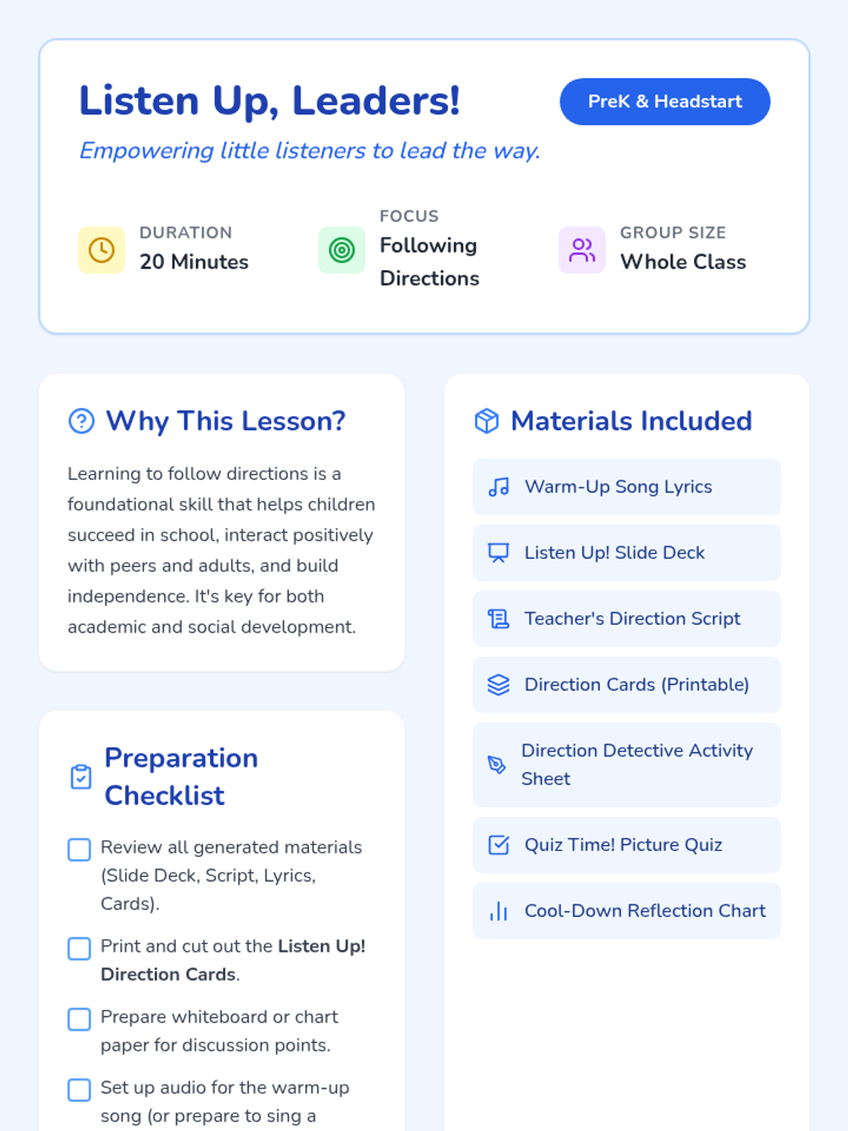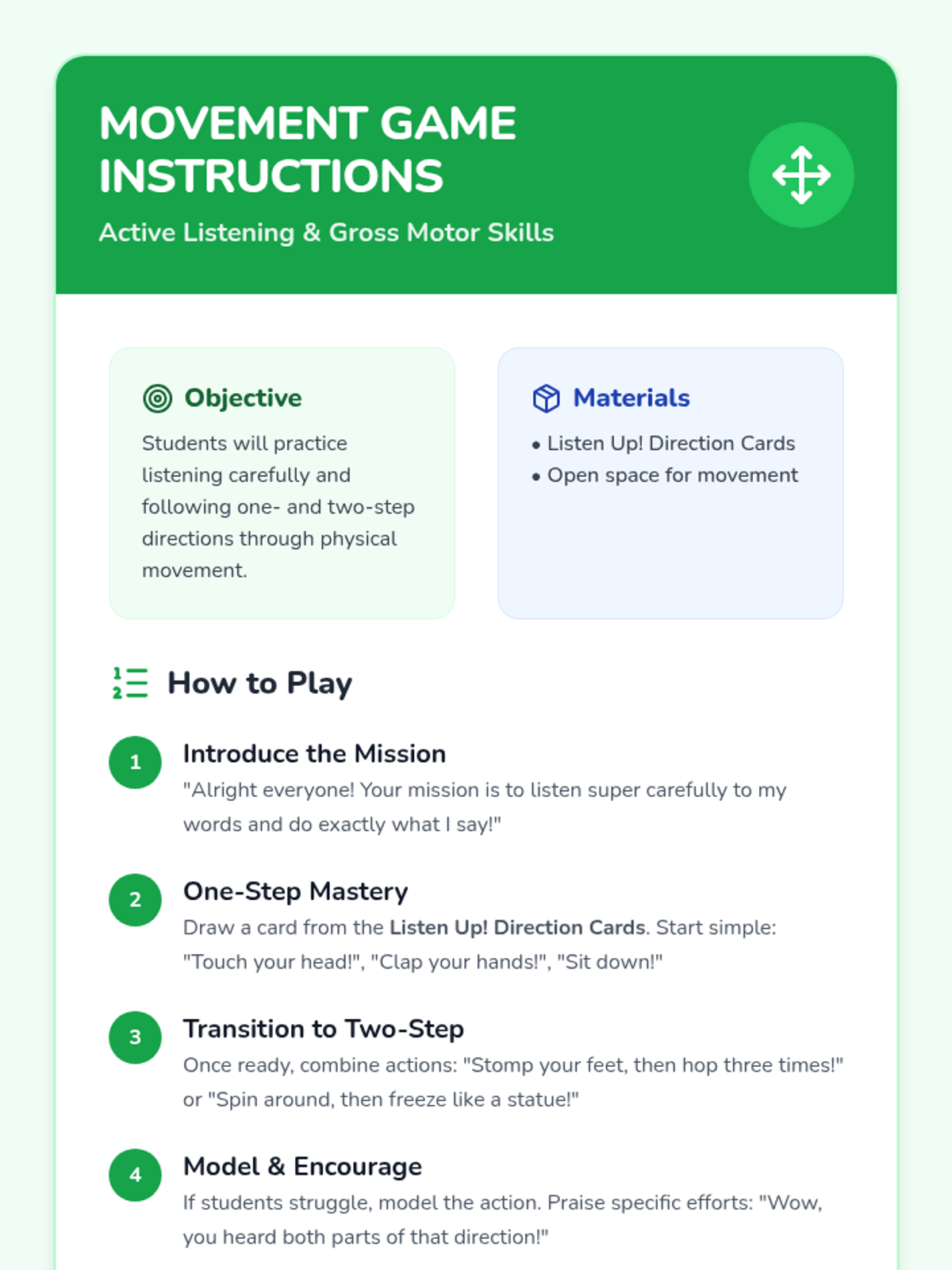A 20-minute interactive lesson for Headstart and PreK students focused on the foundational skill of following one- and two-step directions through games, songs, and visual activities.
