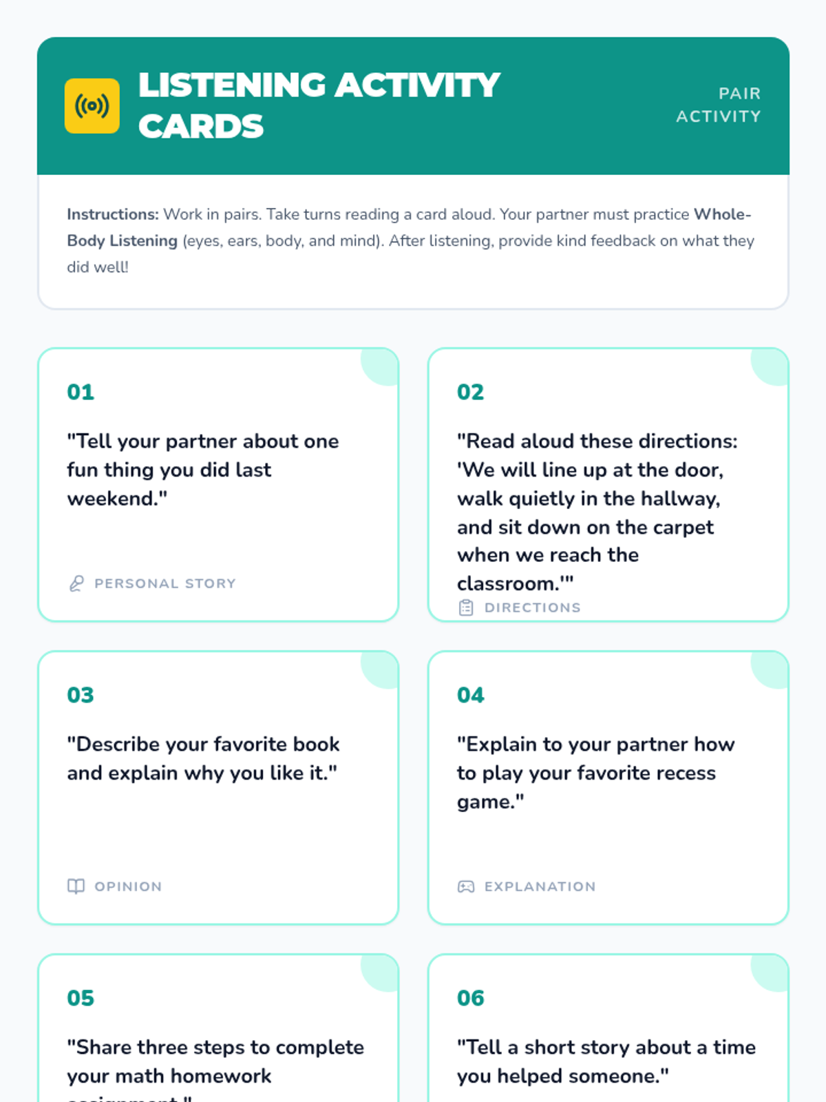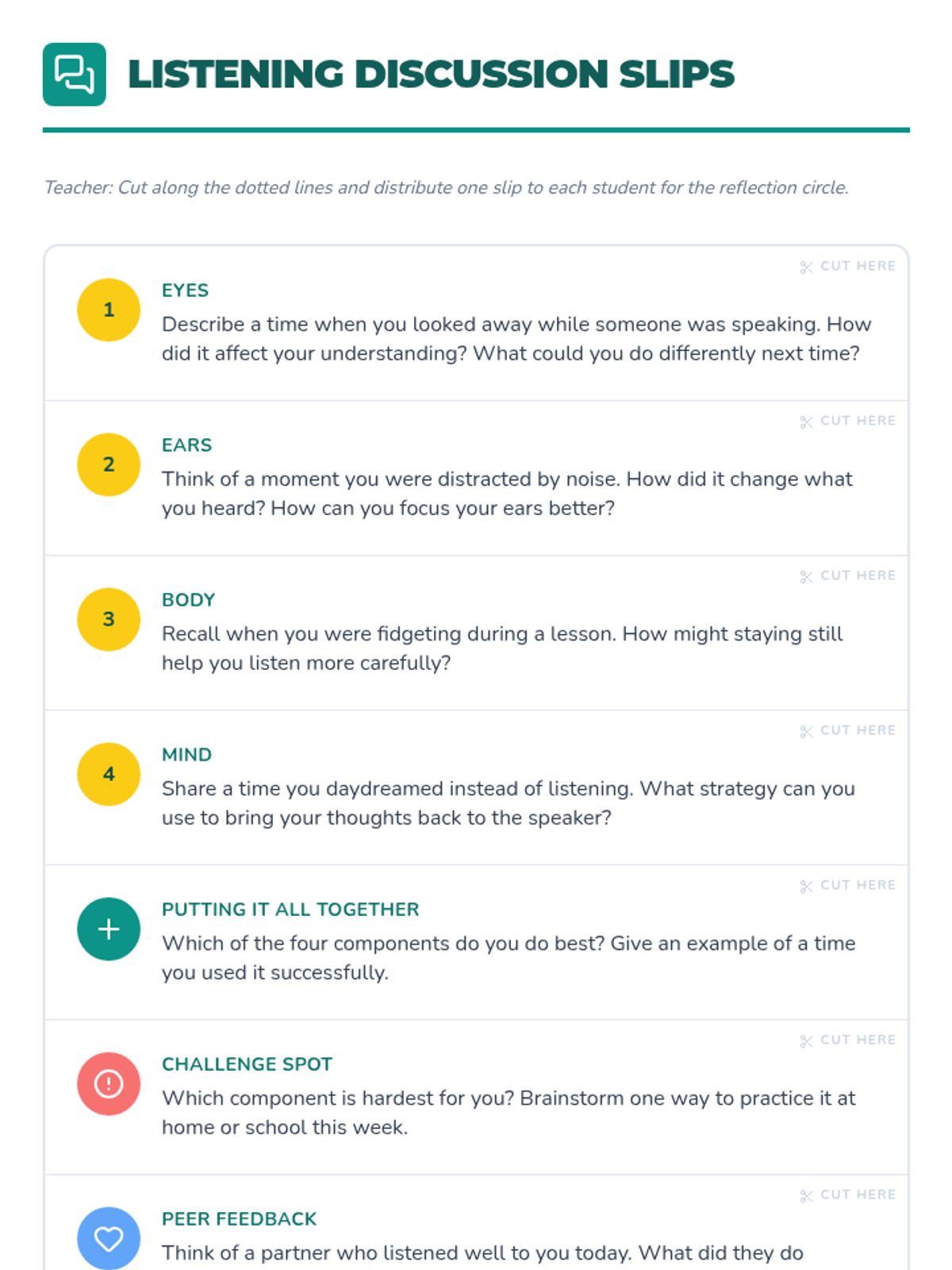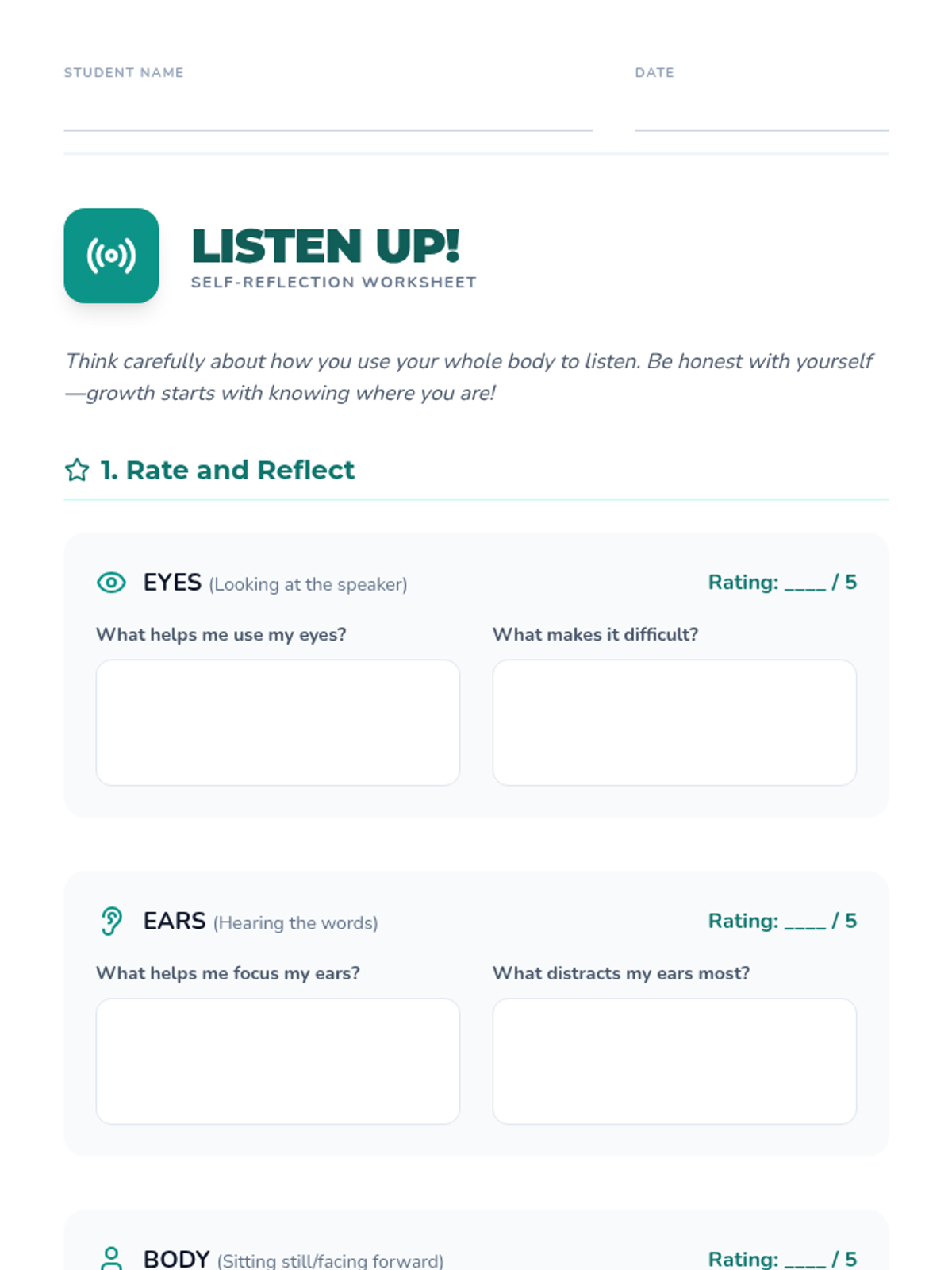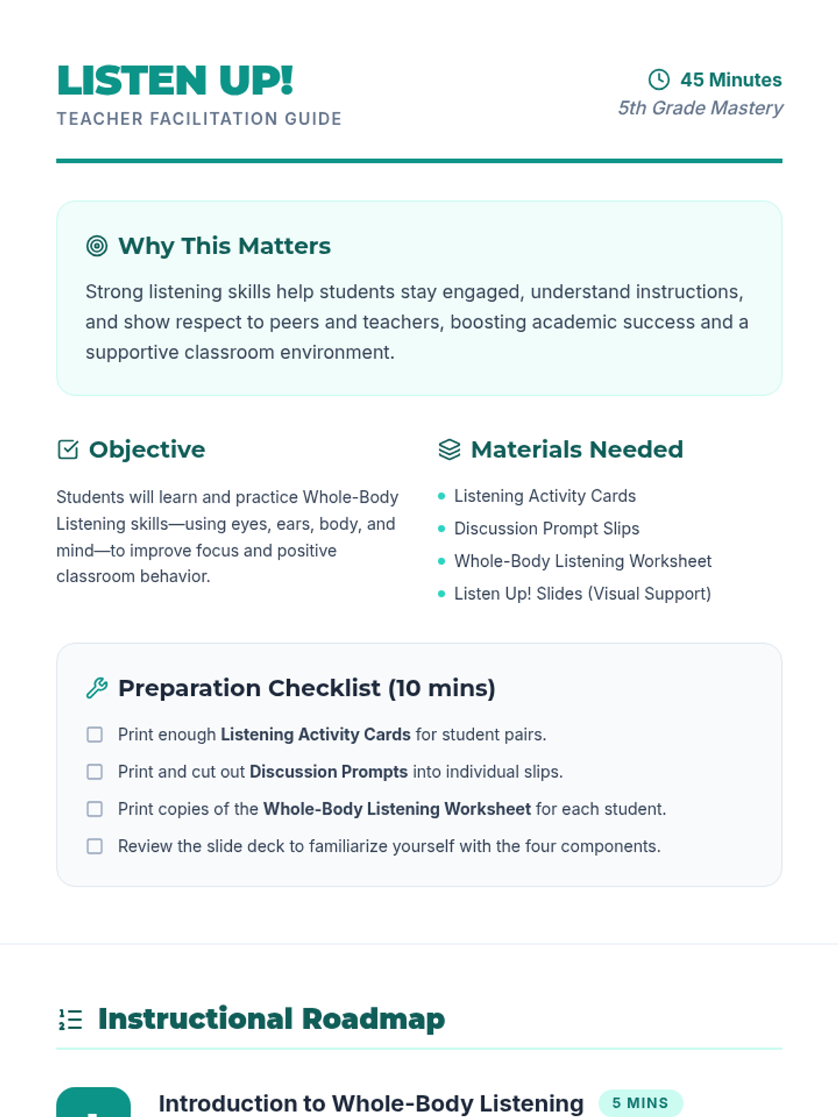 A 45-minute lesson for 5th graders on Whole-Body Listening, covering the four key components: eyes, ears, body, and mind to improve classroom focus and peer respect.