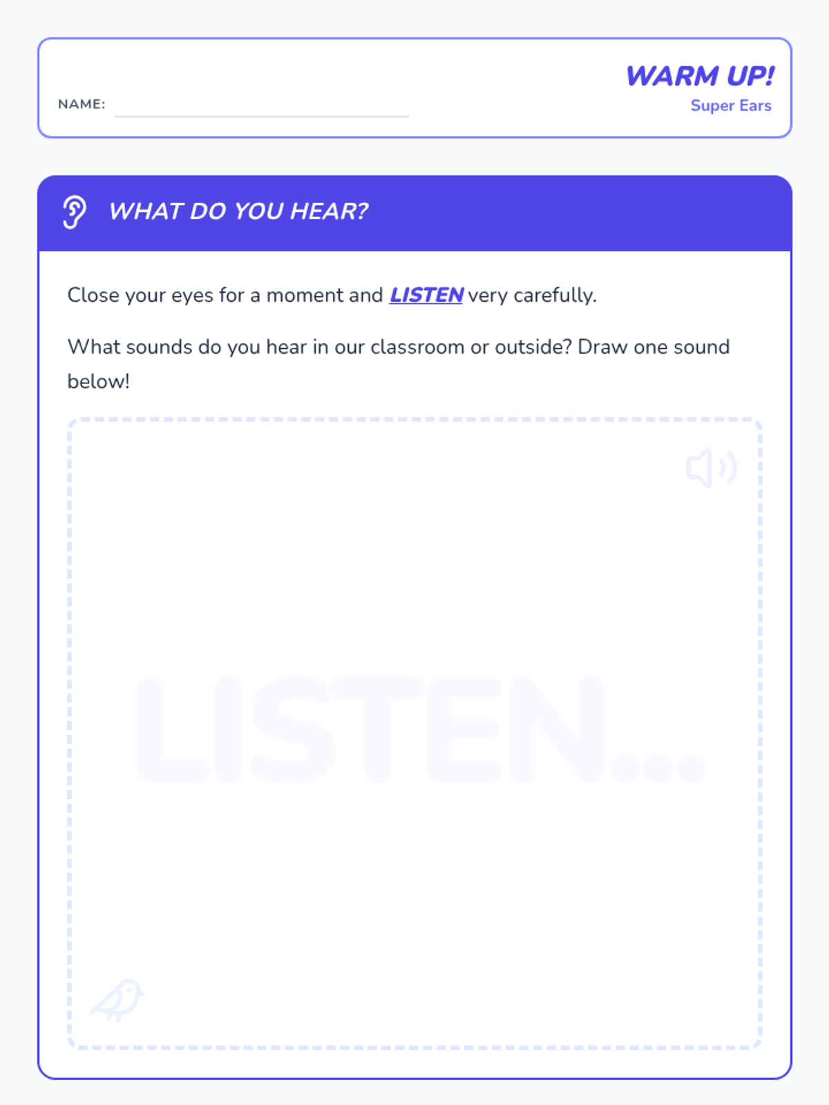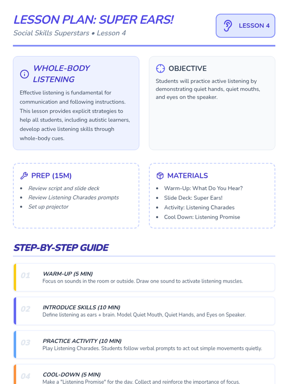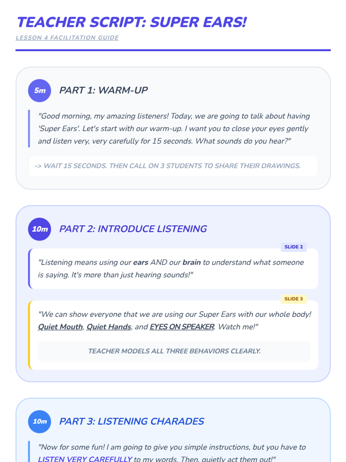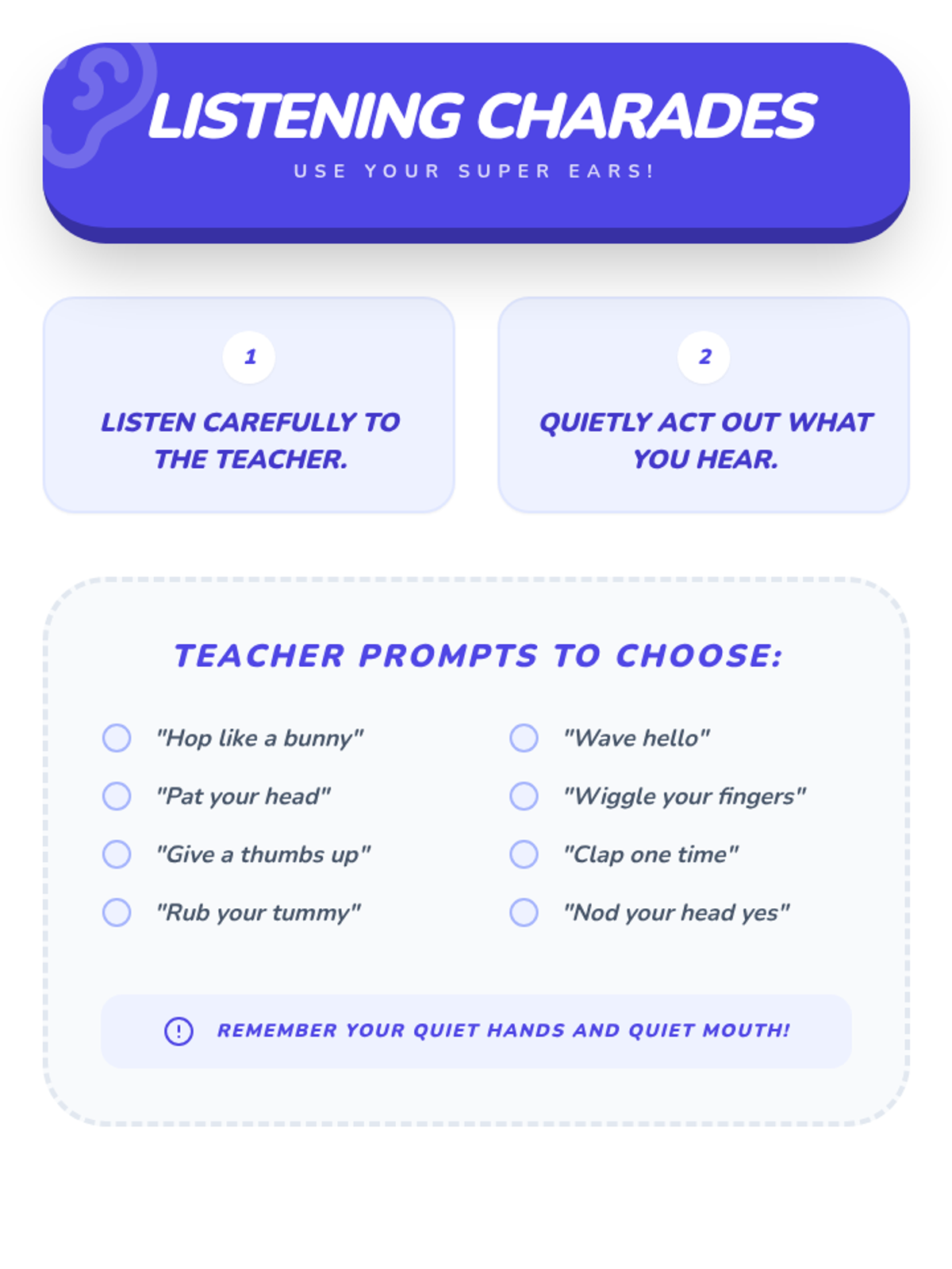 Focuses on whole-body listening skills, including quiet mouths, quiet hands, and eyes on the speaker.