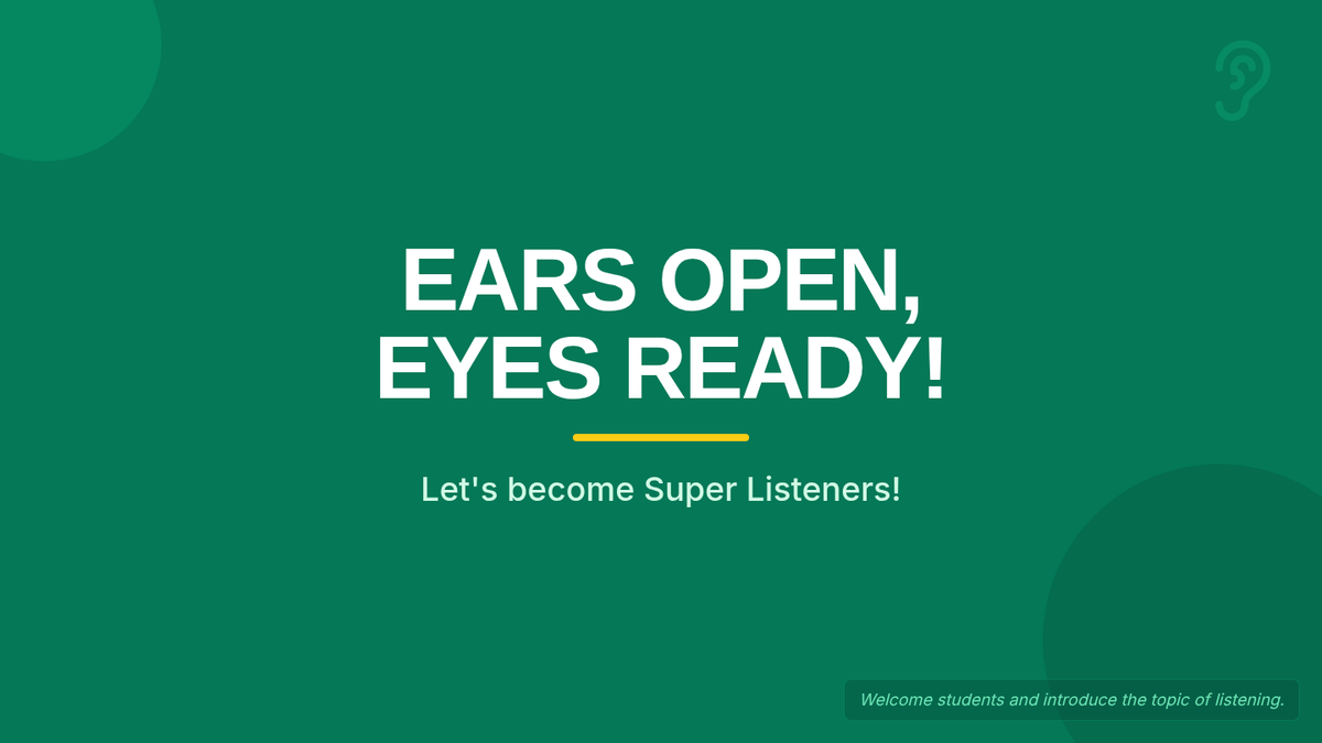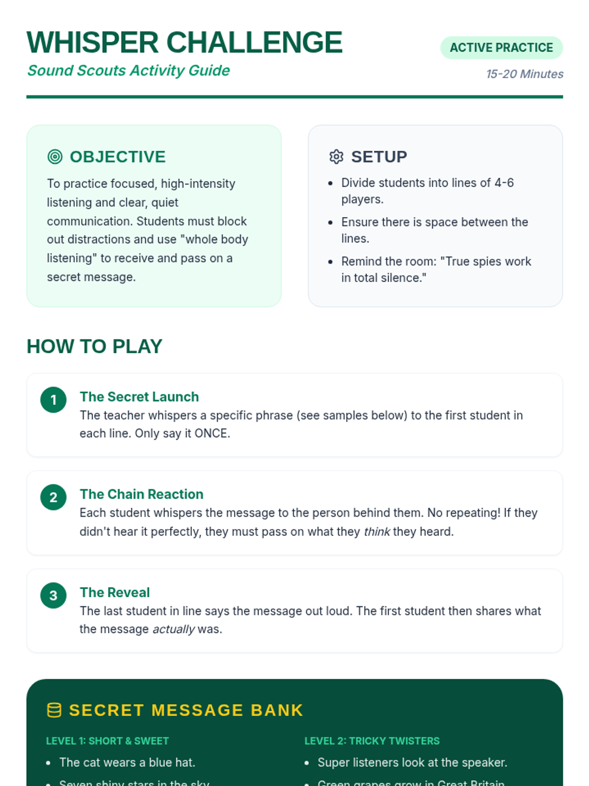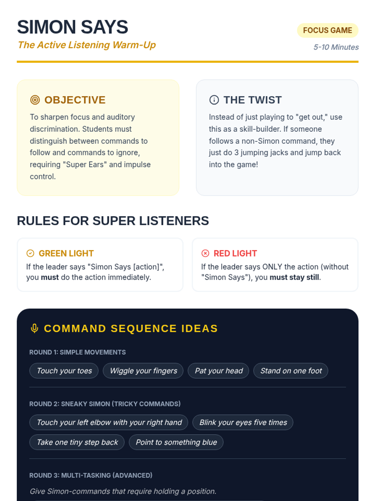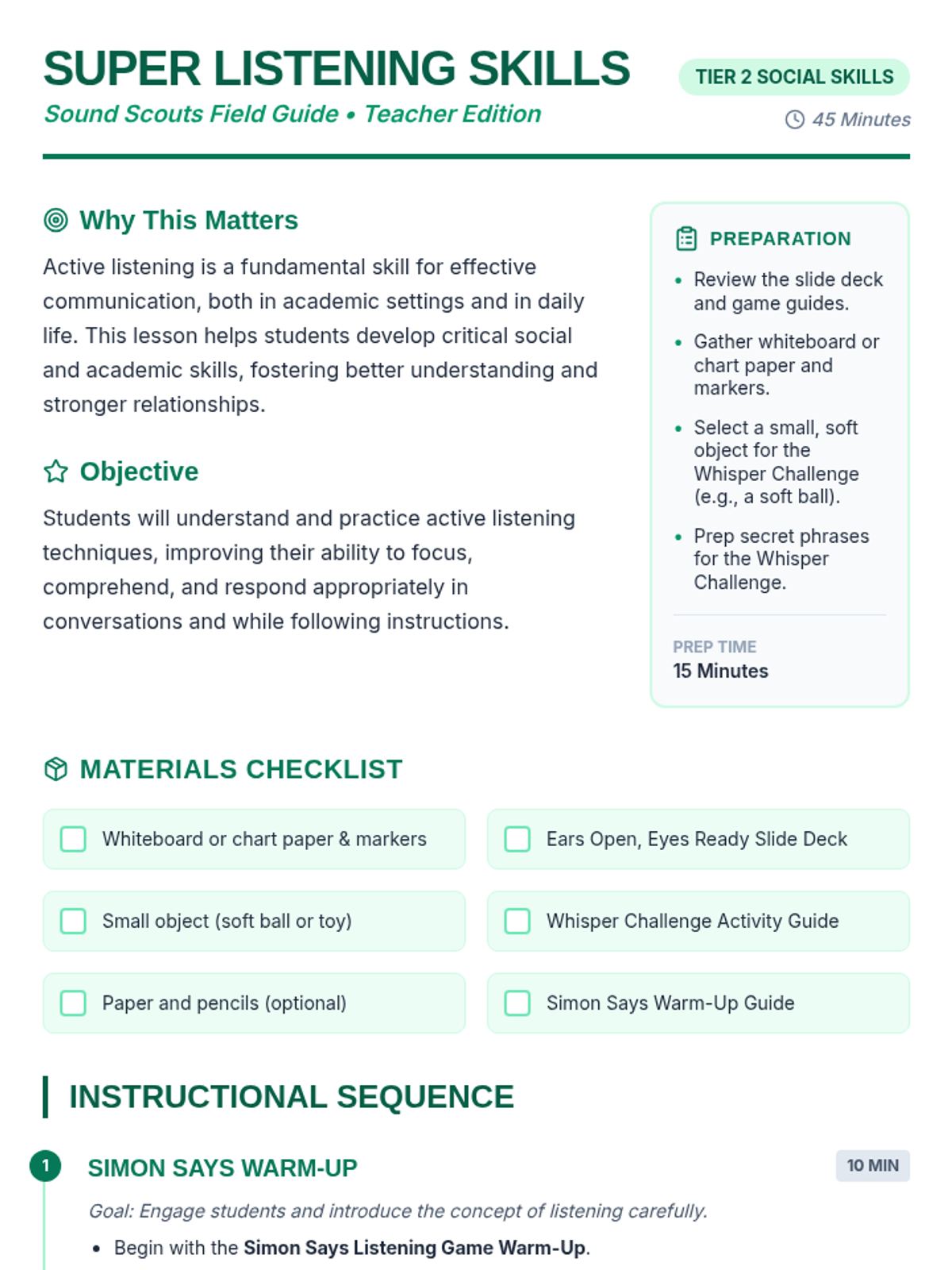 A 45-minute lesson for elementary students focused on developing active listening skills through interactive games and guided discussion. Students learn to use their whole body to listen and practice focus and attention.