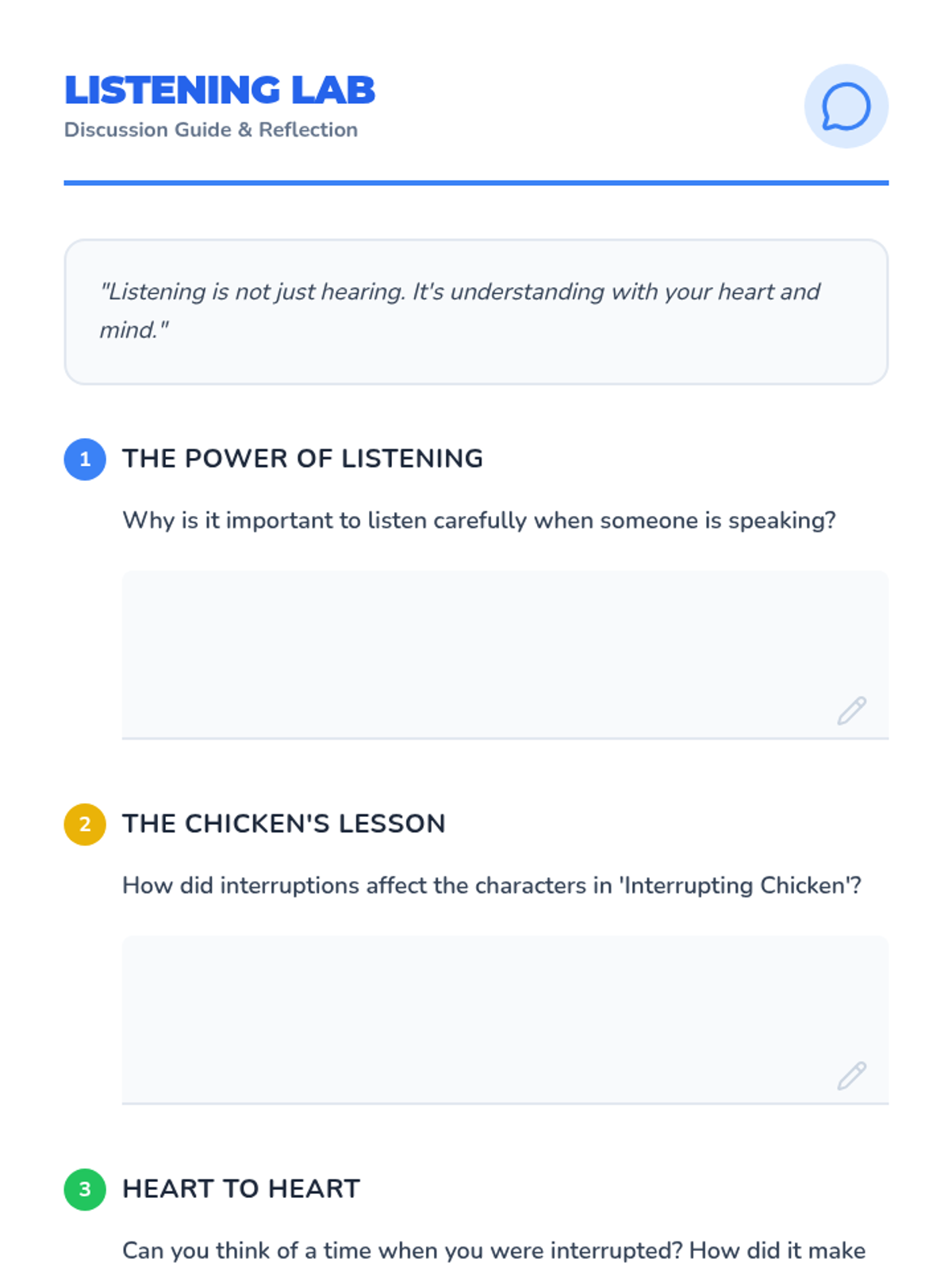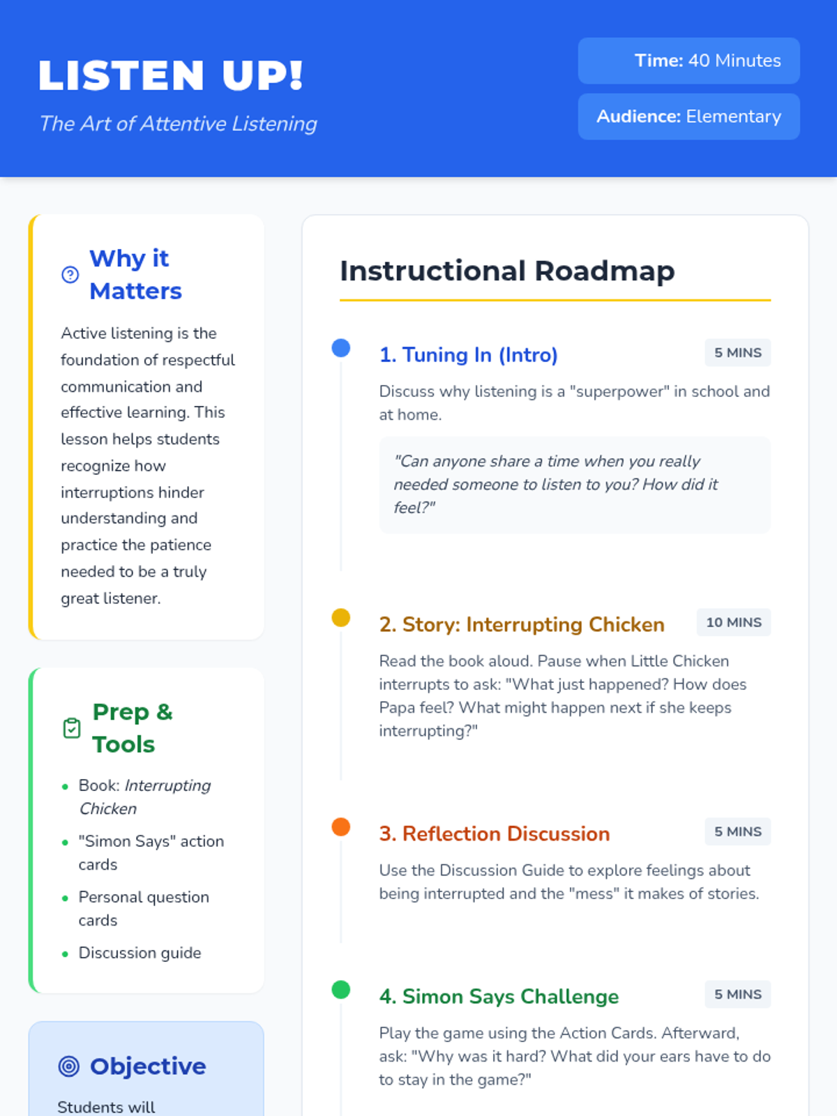 A high-energy lesson focused on developing active listening skills through storytelling, games, and personal reflection. Students will learn the value of patience and the impact of interruptions using the story 'Interrupting Chicken' and interactive games.