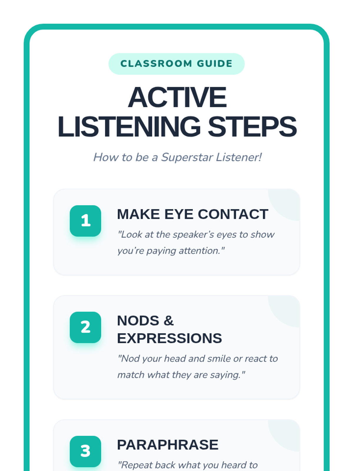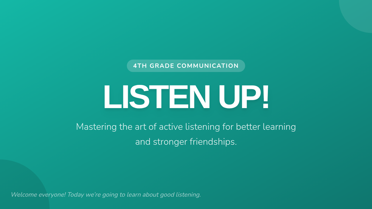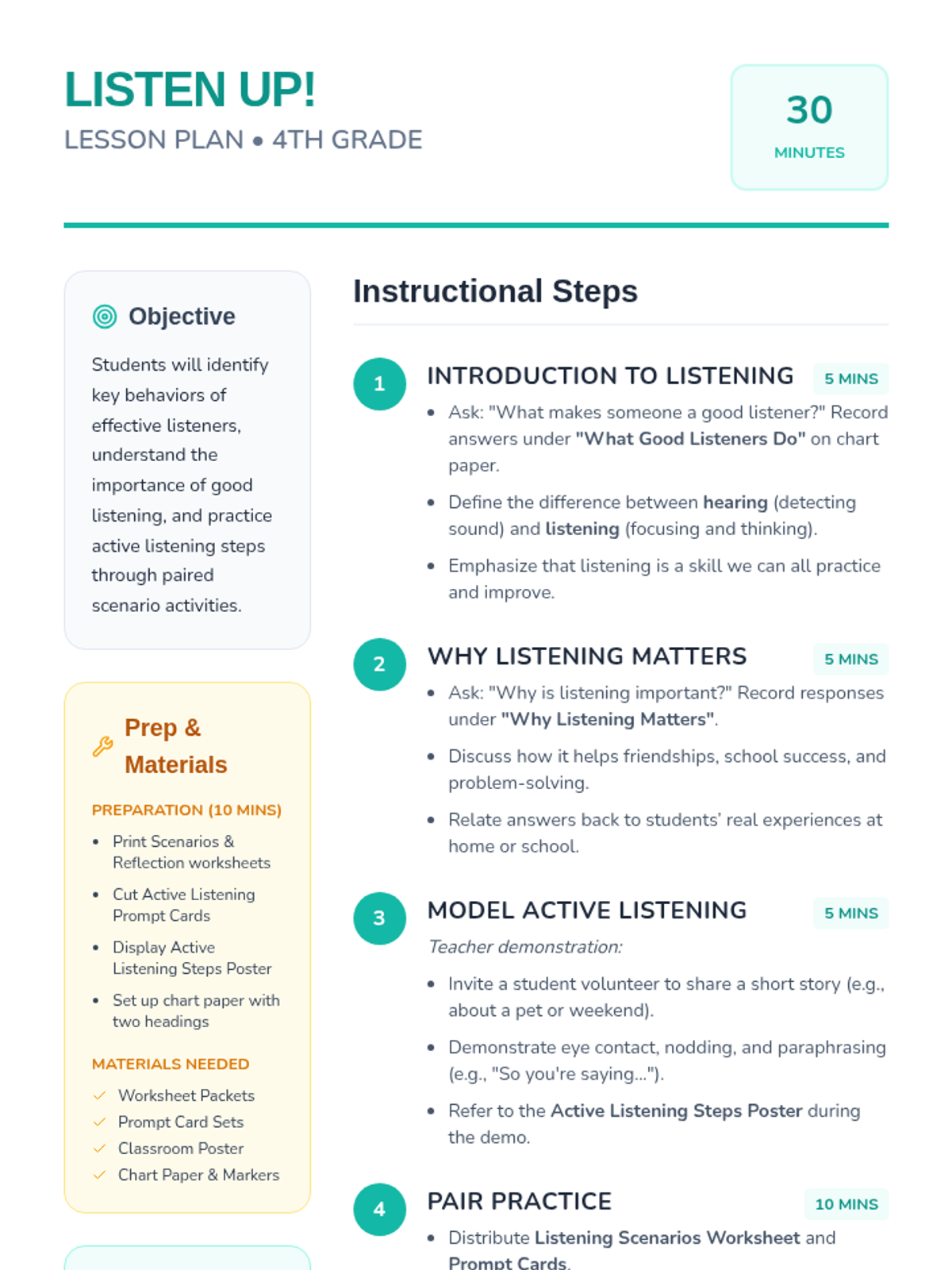 A 30-minute lesson for 4th graders on effective listening skills, covering the difference between hearing and listening, active listening techniques, and practical application.