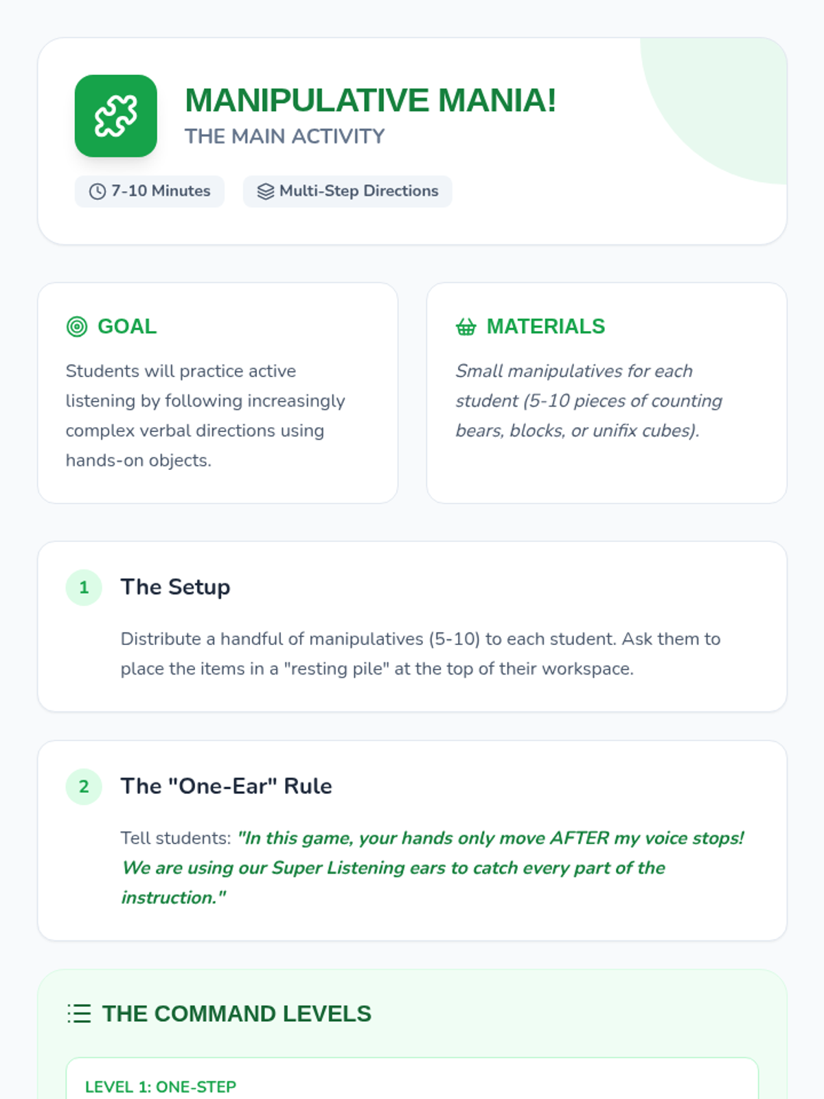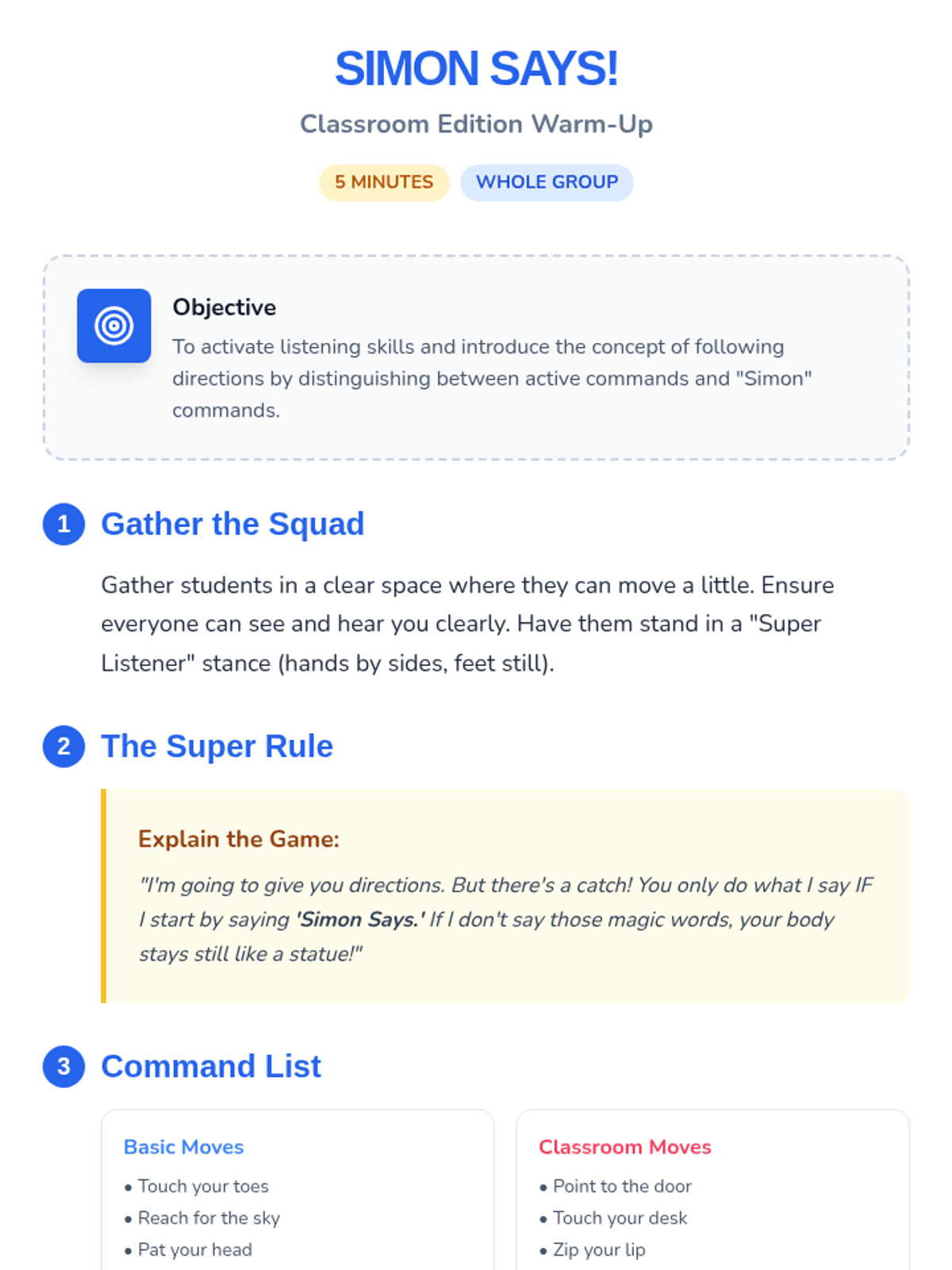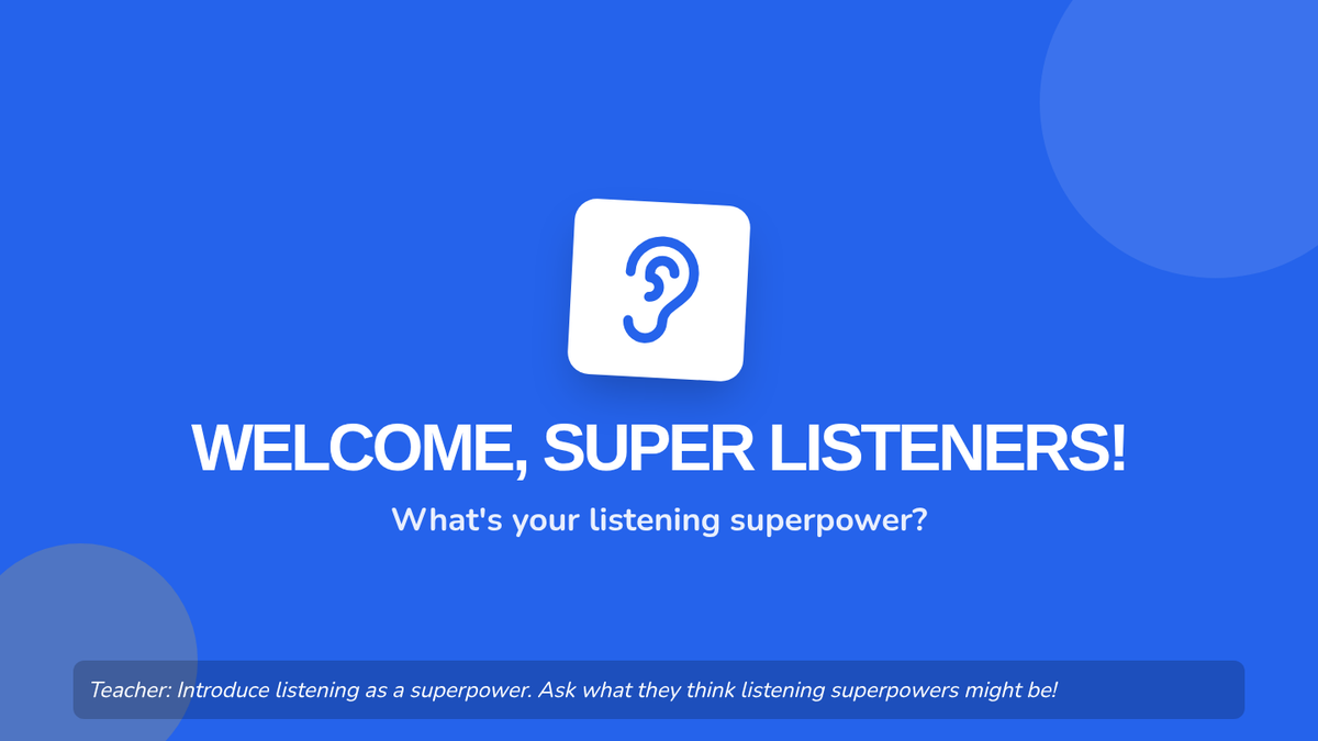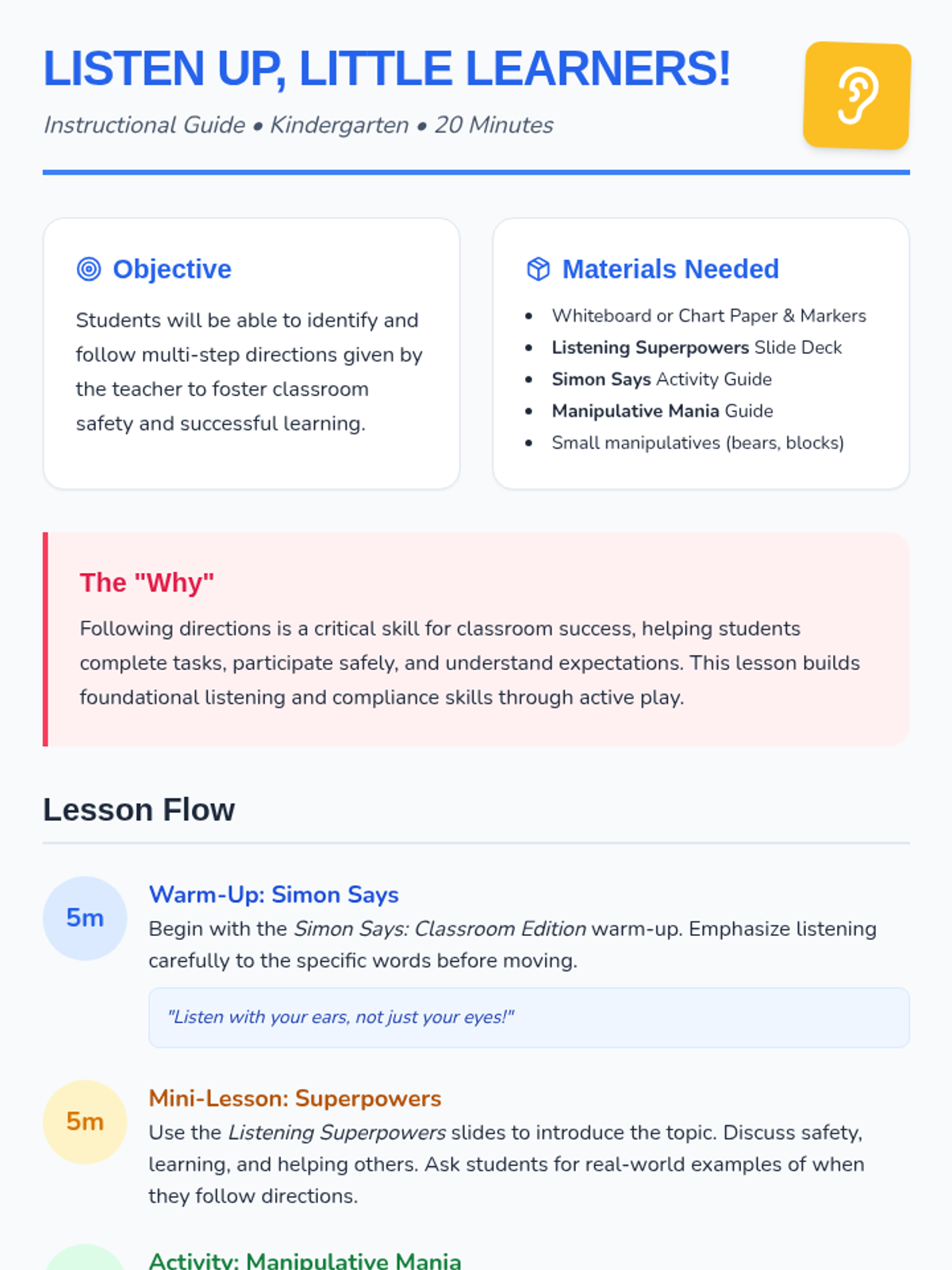 A high-energy 20-minute lesson for Kindergarteners that introduces the 'superpower' of listening and following directions through interactive games and manipulatives.