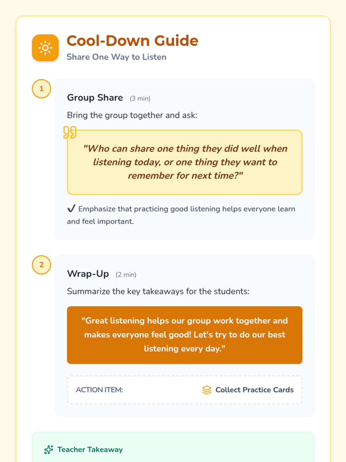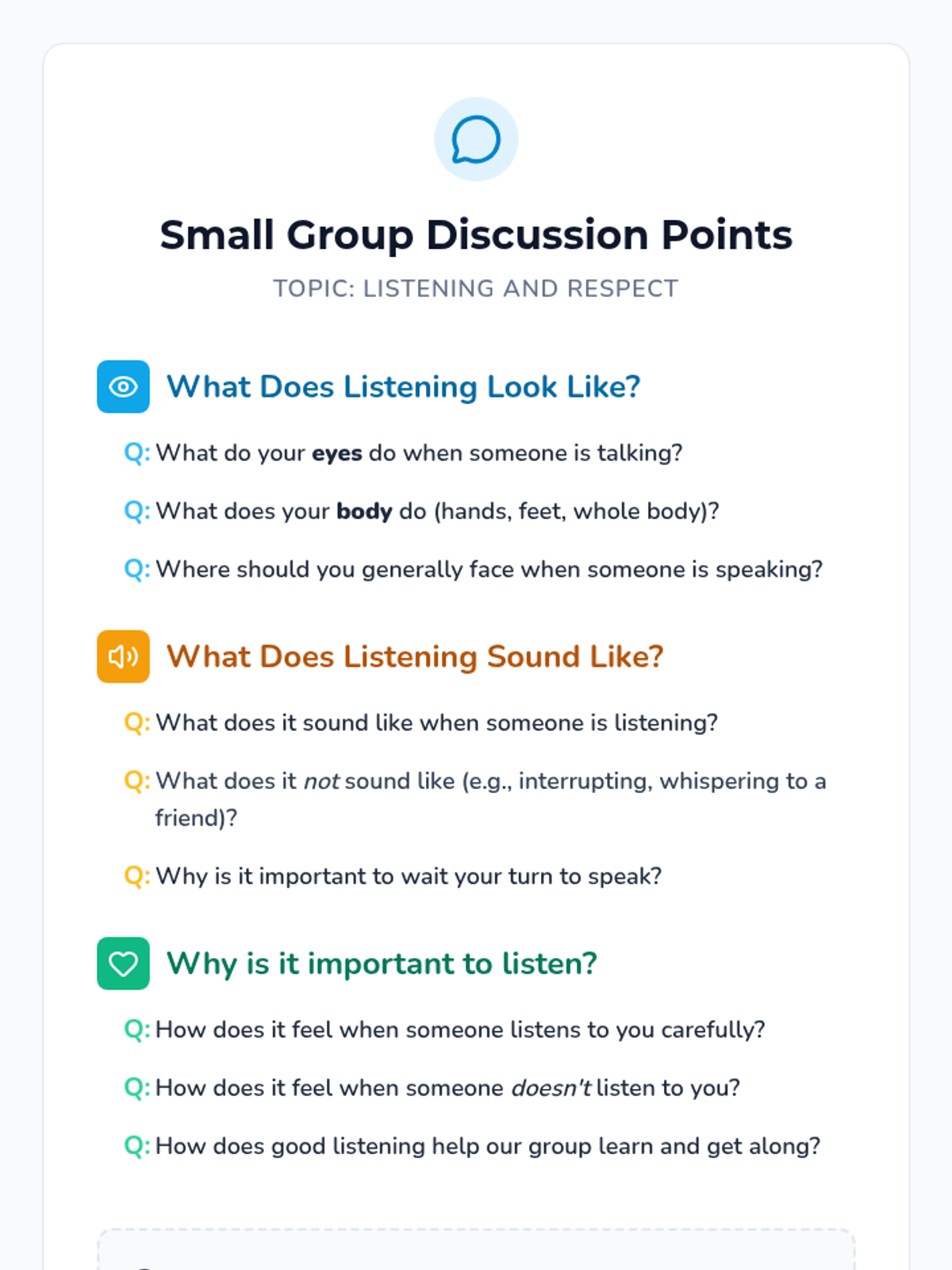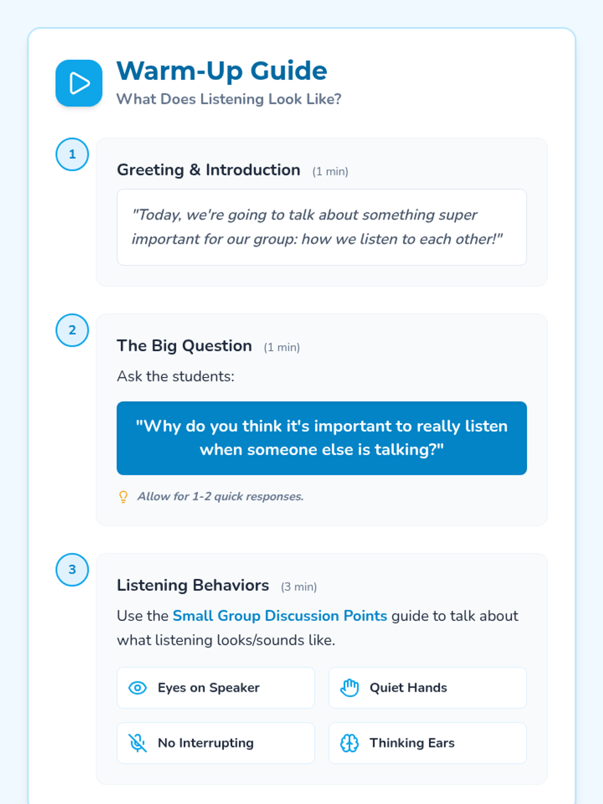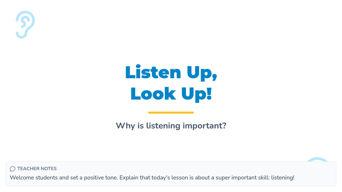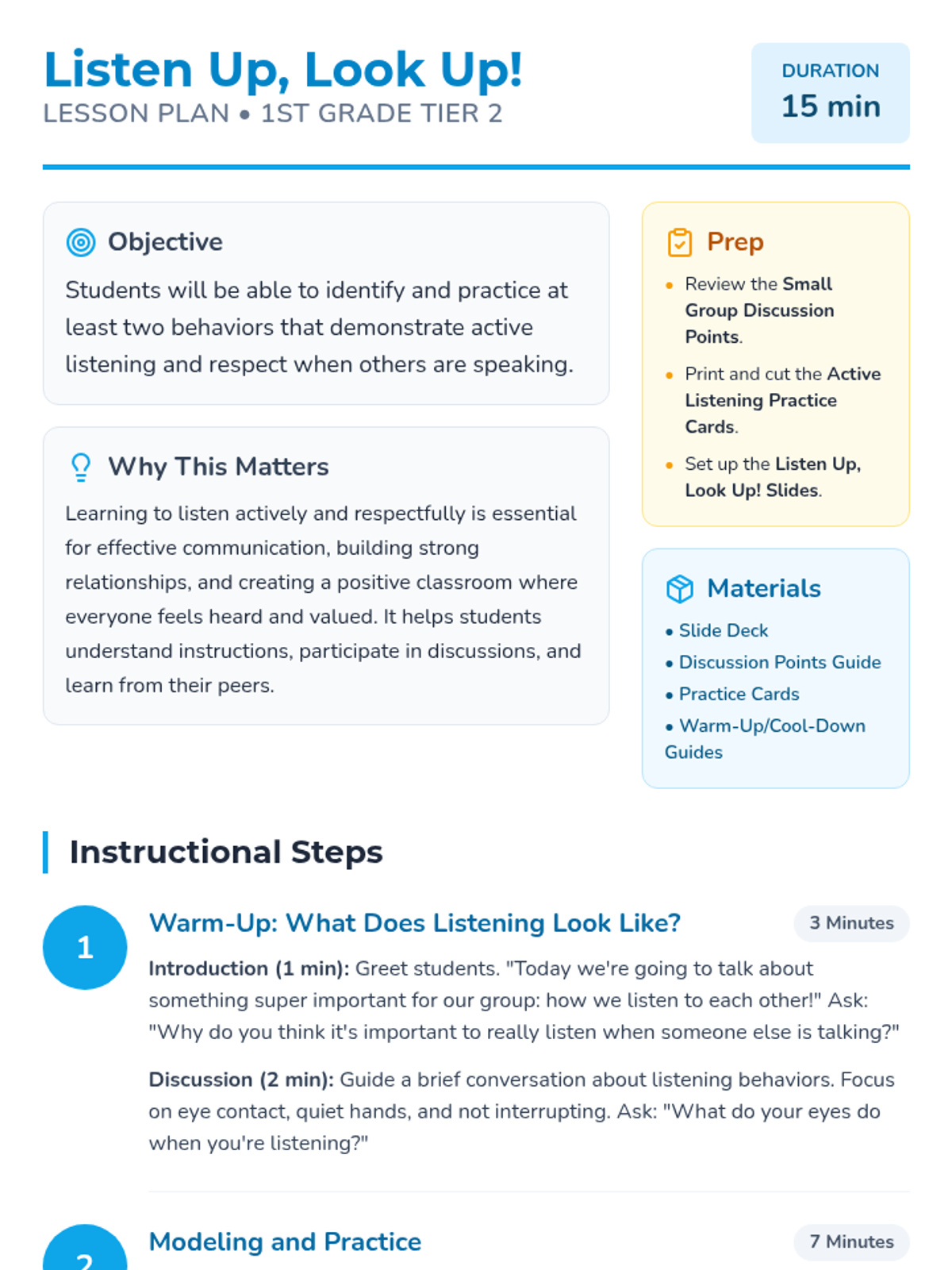A 15-minute small group lesson for 1st graders focused on identifying and practicing active listening behaviors like eye contact and quiet bodies.