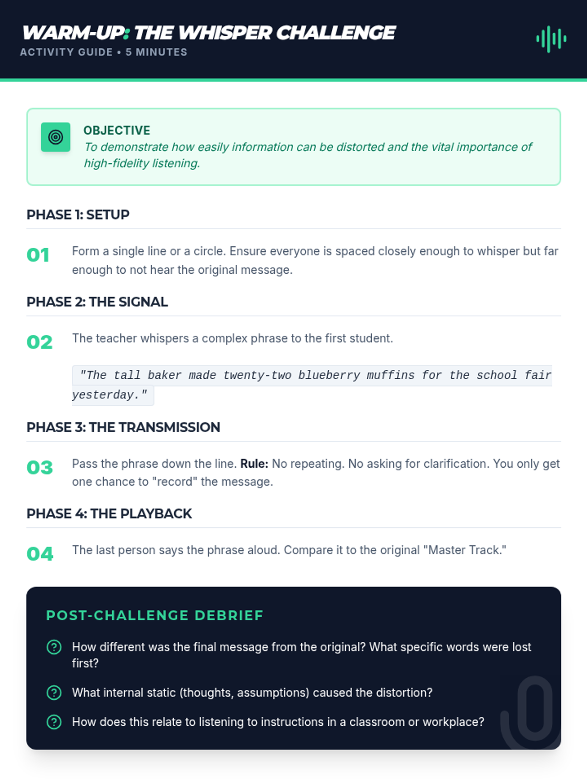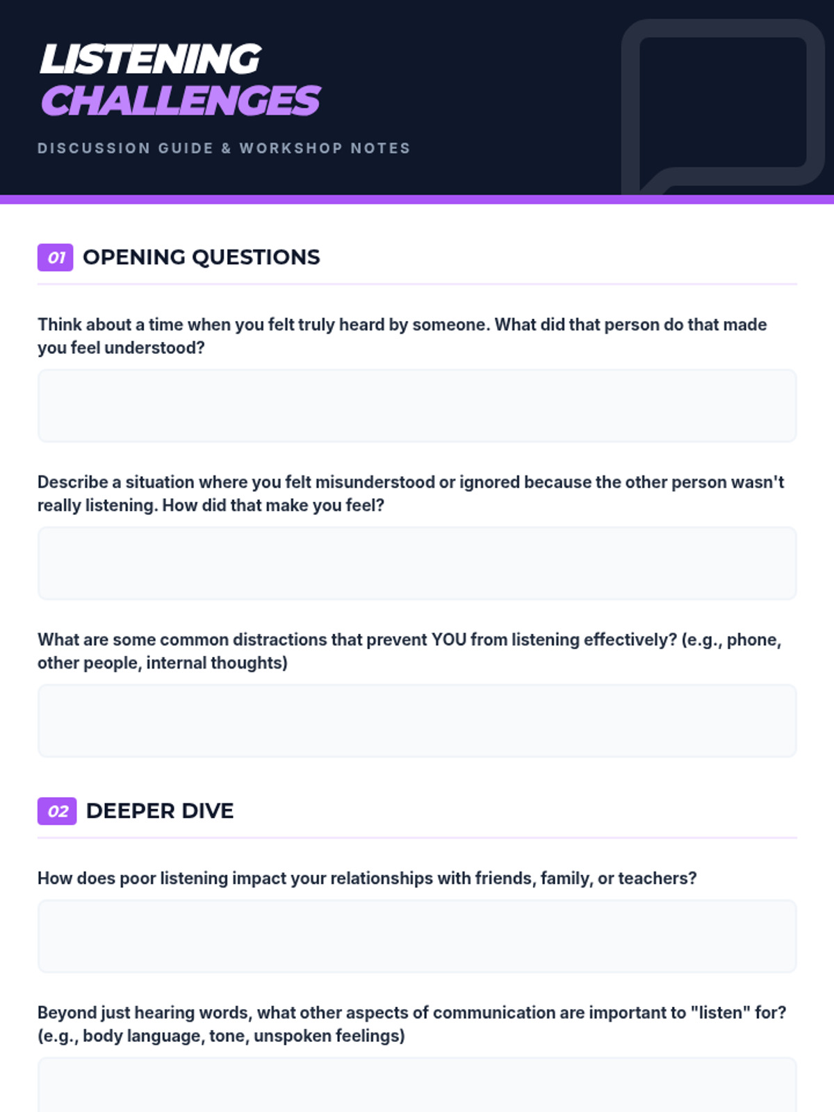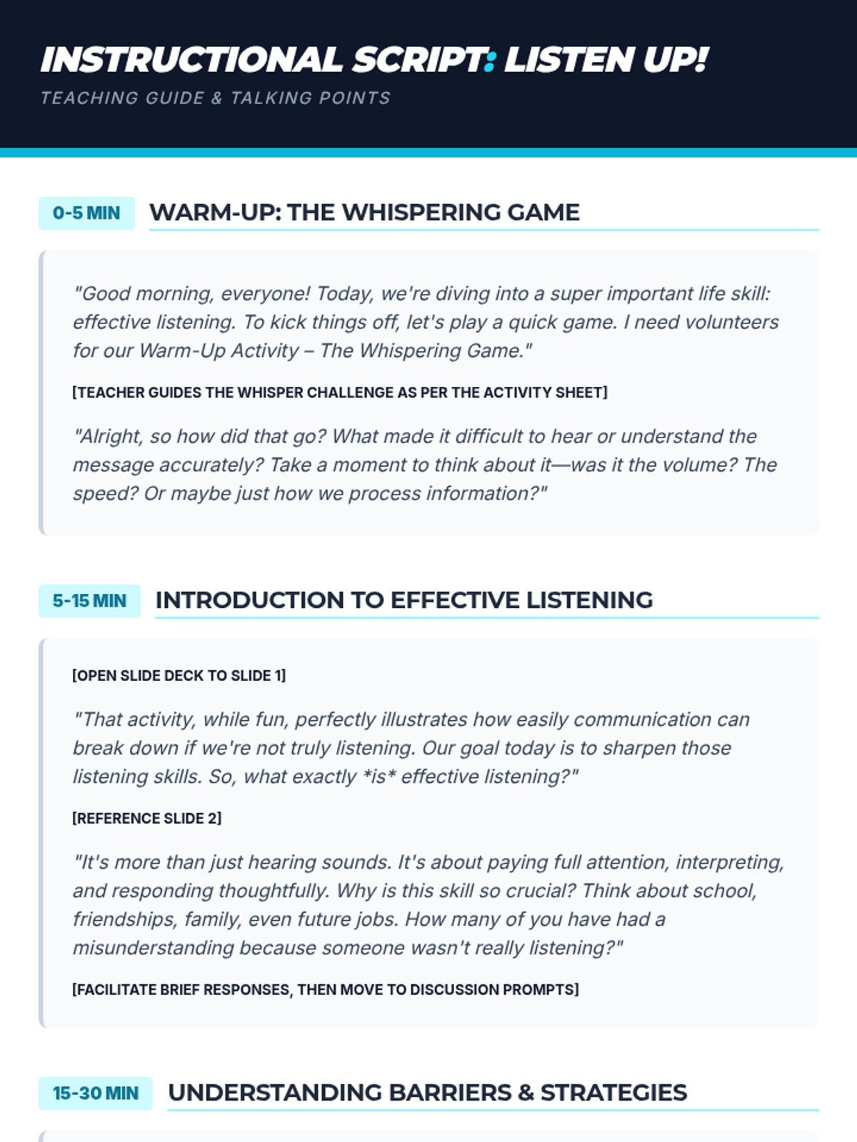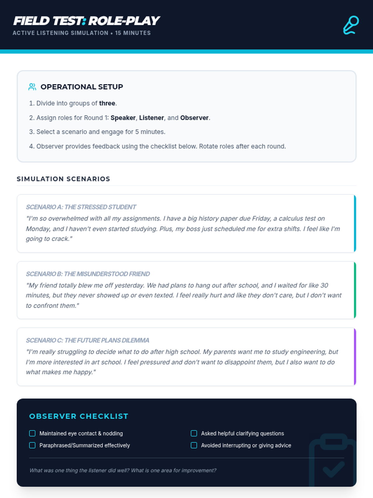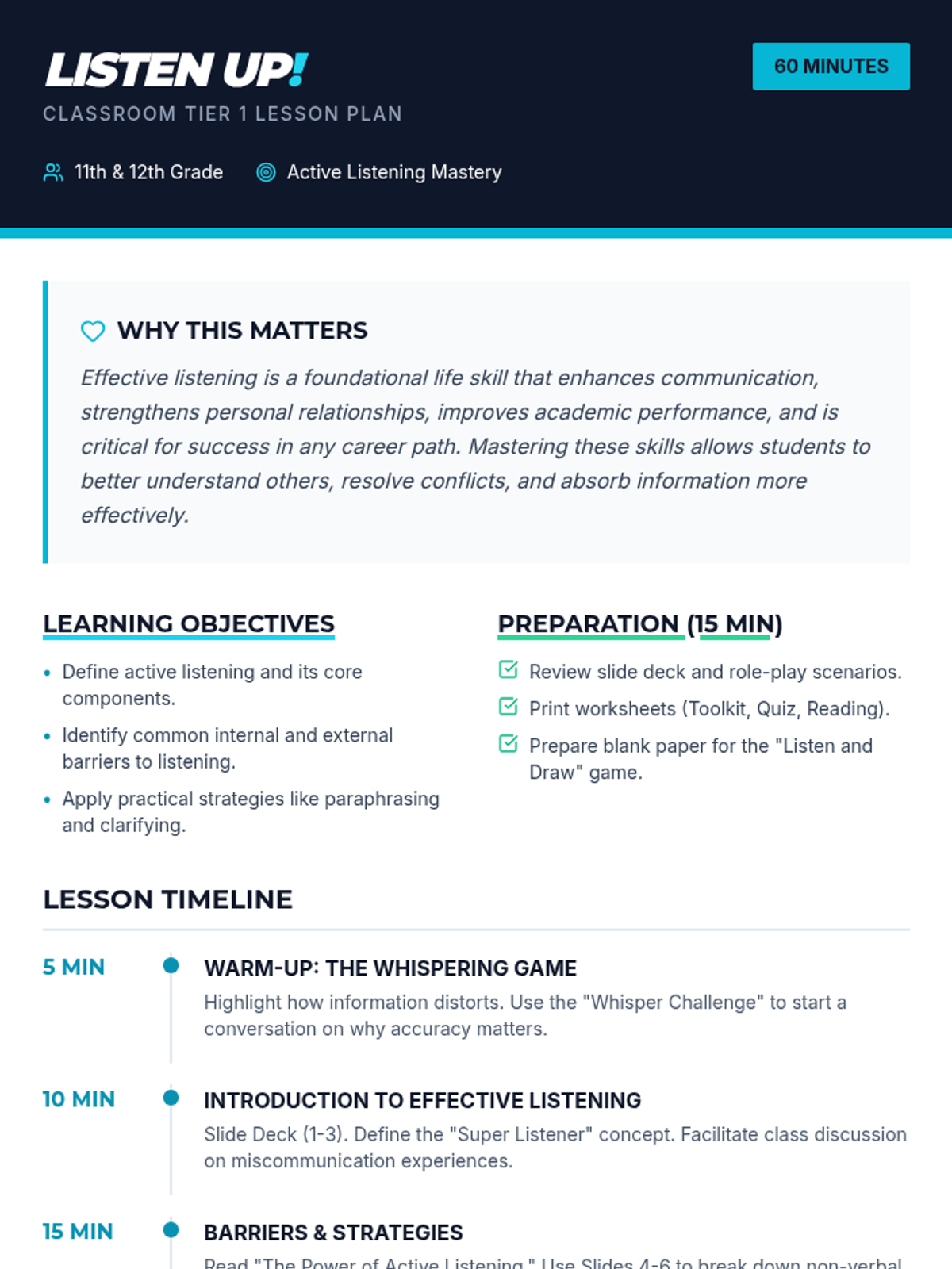 A comprehensive 60-minute lesson for high school juniors and seniors designed to improve active listening skills through interactive role-plays, reflective writing, and collaborative games.
