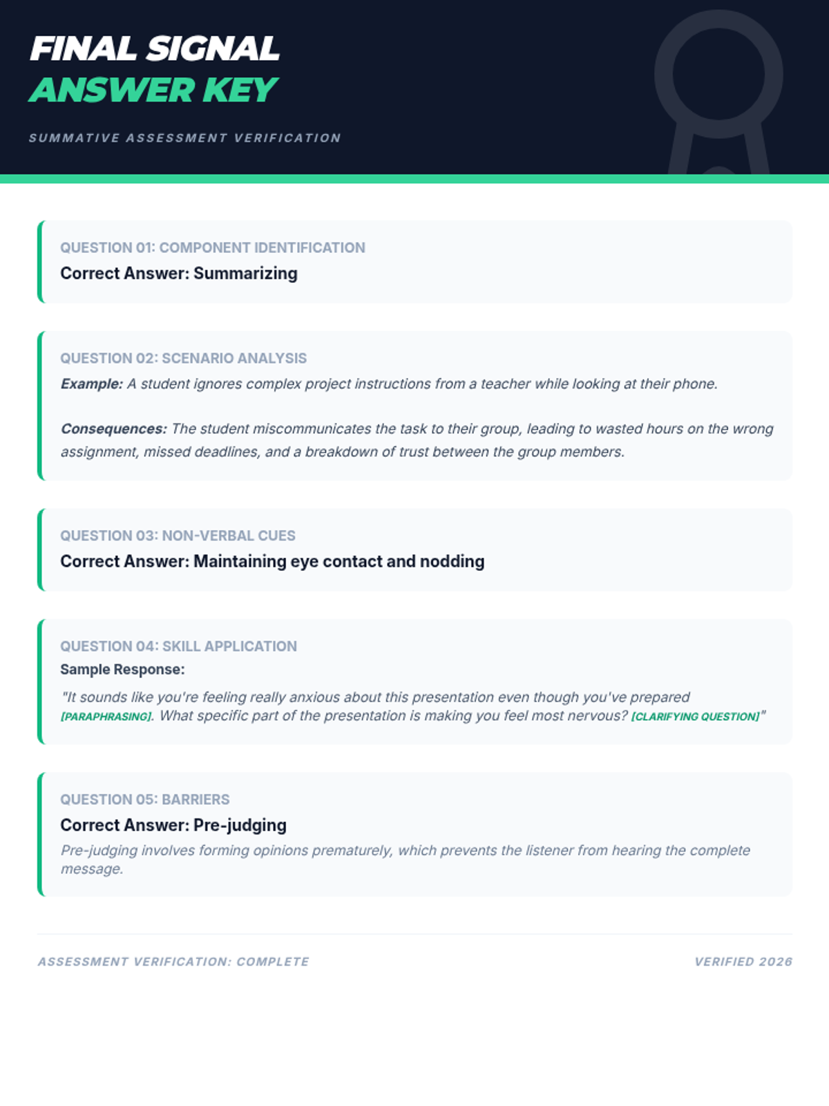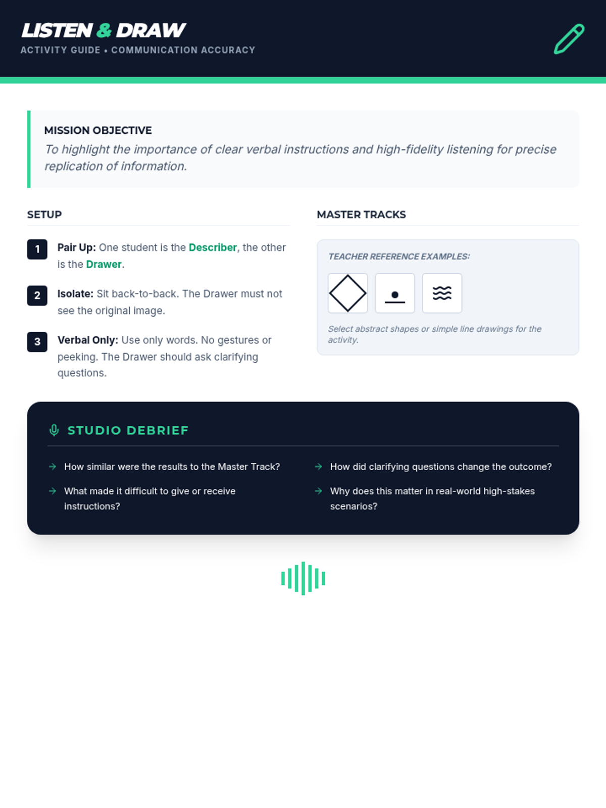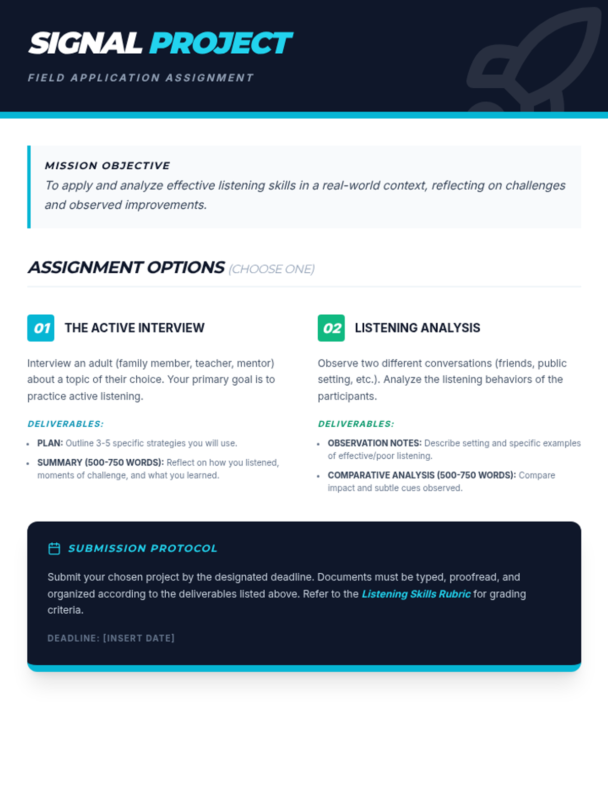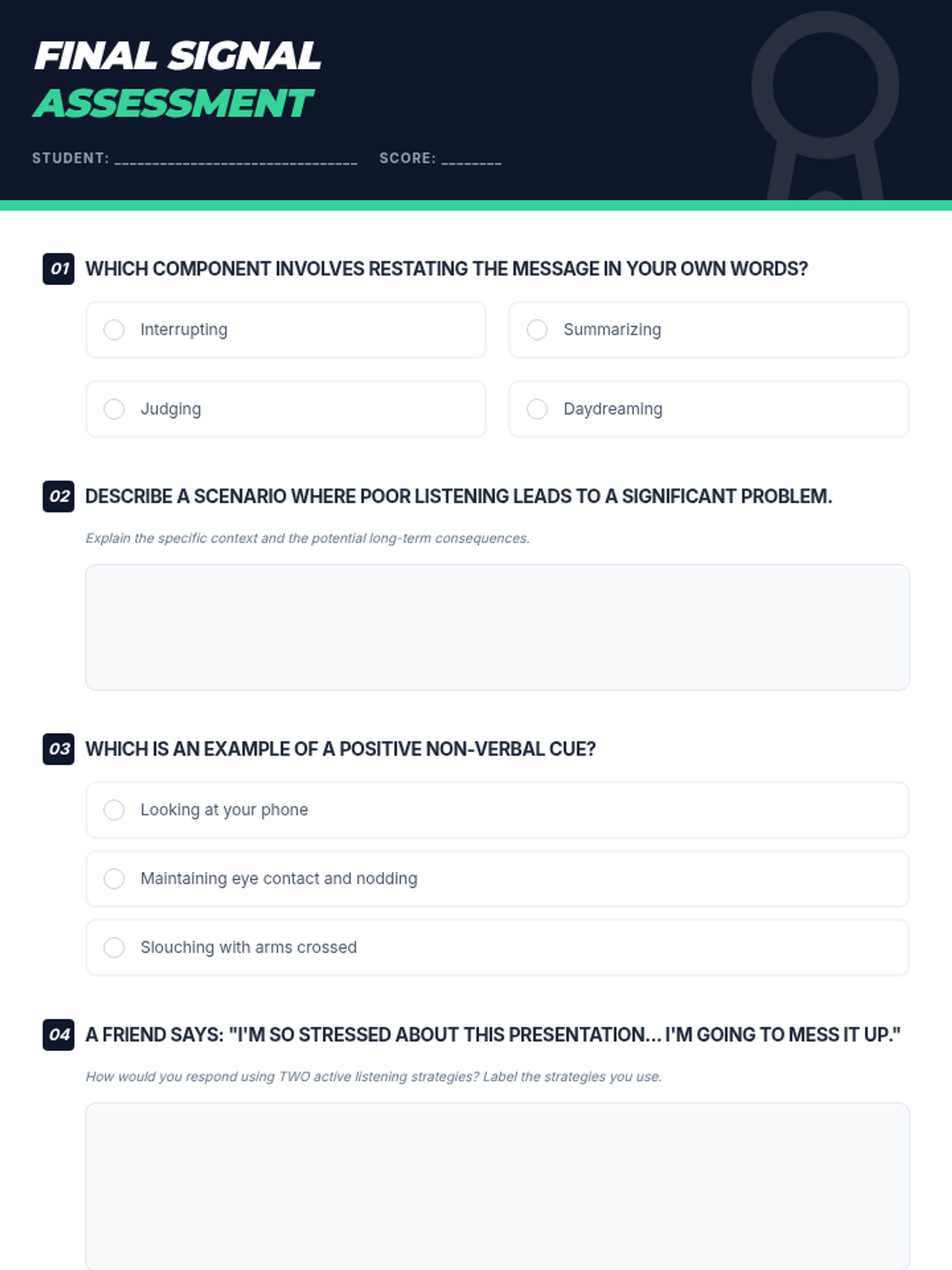 A comprehensive 60-minute lesson for high school juniors and seniors designed to improve active listening skills through interactive role-plays, reflective writing, and collaborative games.
