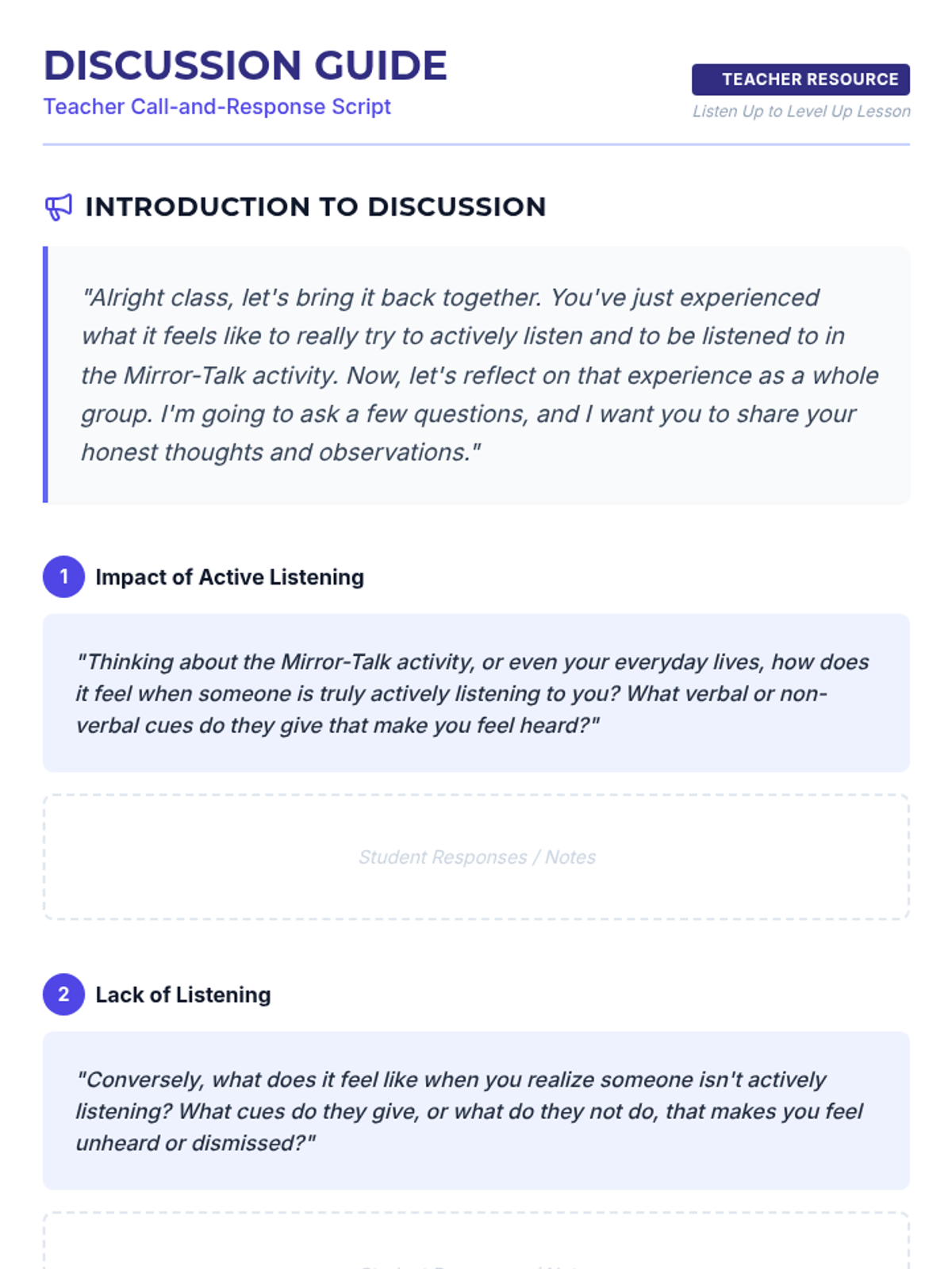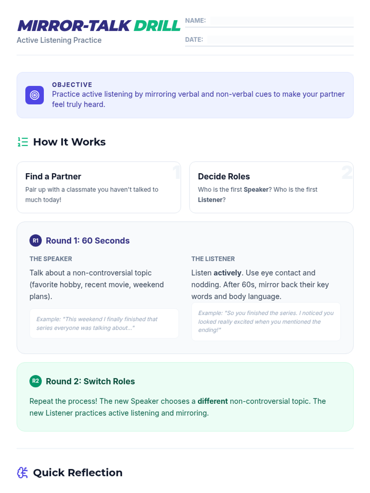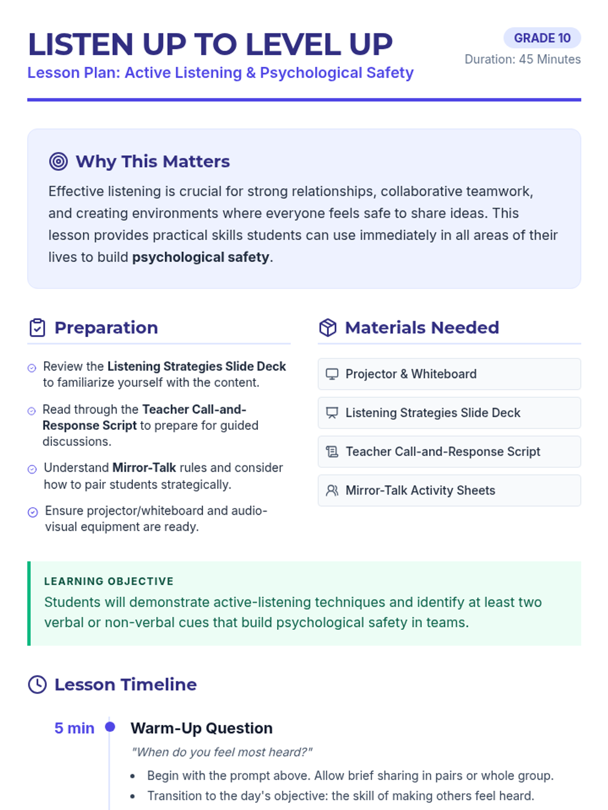 A 45-minute lesson for 10th graders focusing on active listening techniques and psychological safety. Students participate in 'Mirror-Talk' drills to practice verbal and non-verbal communication cues.