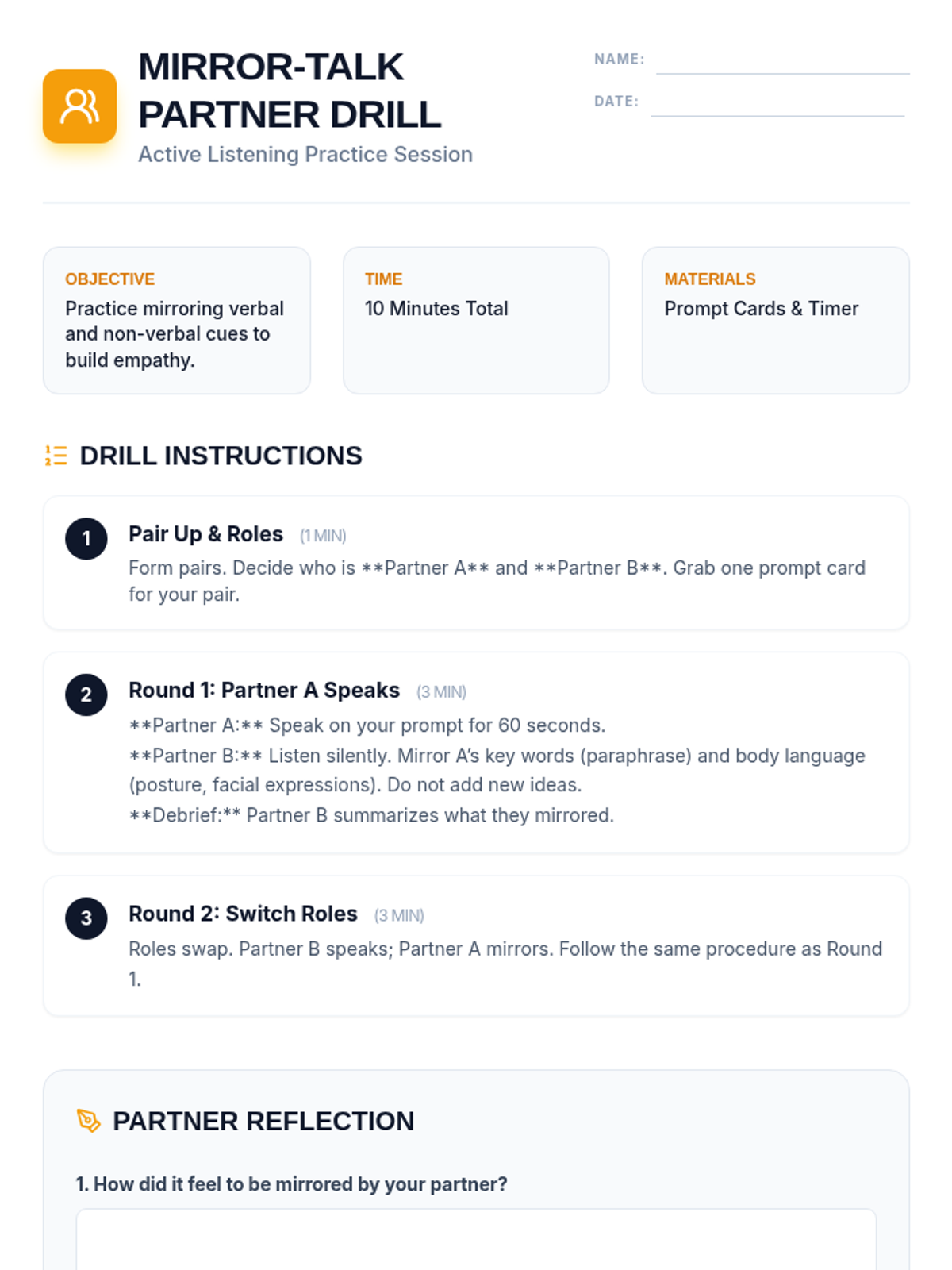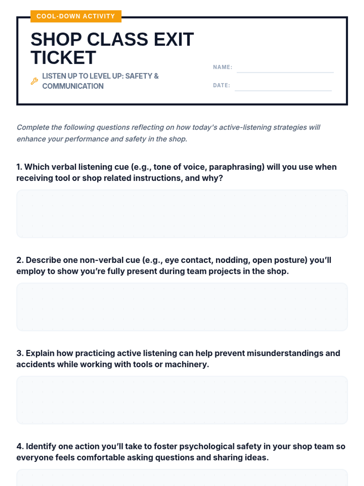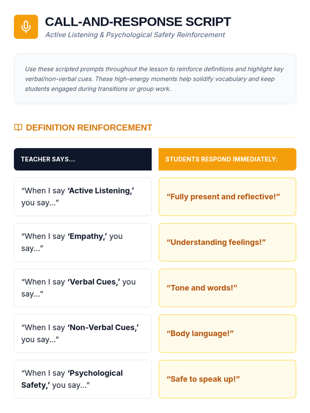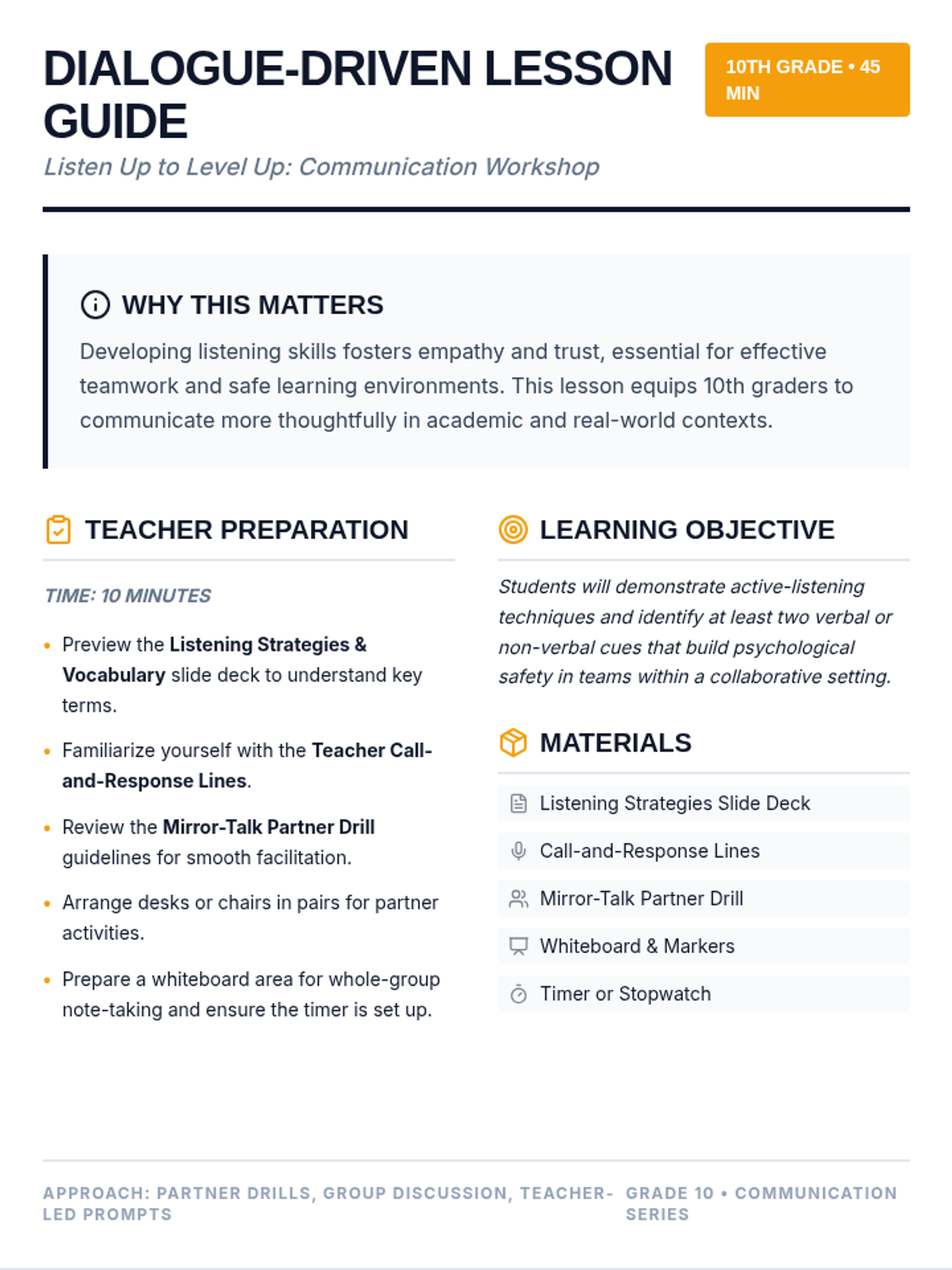 In this 45-minute lesson, 10th-grade students practice active-listening techniques and learn to identify verbal and non-verbal cues that foster psychological safety in team environments. Learners build empathy and essential communication skills through partner drills, group discussions, and teacher-led call-and-response.