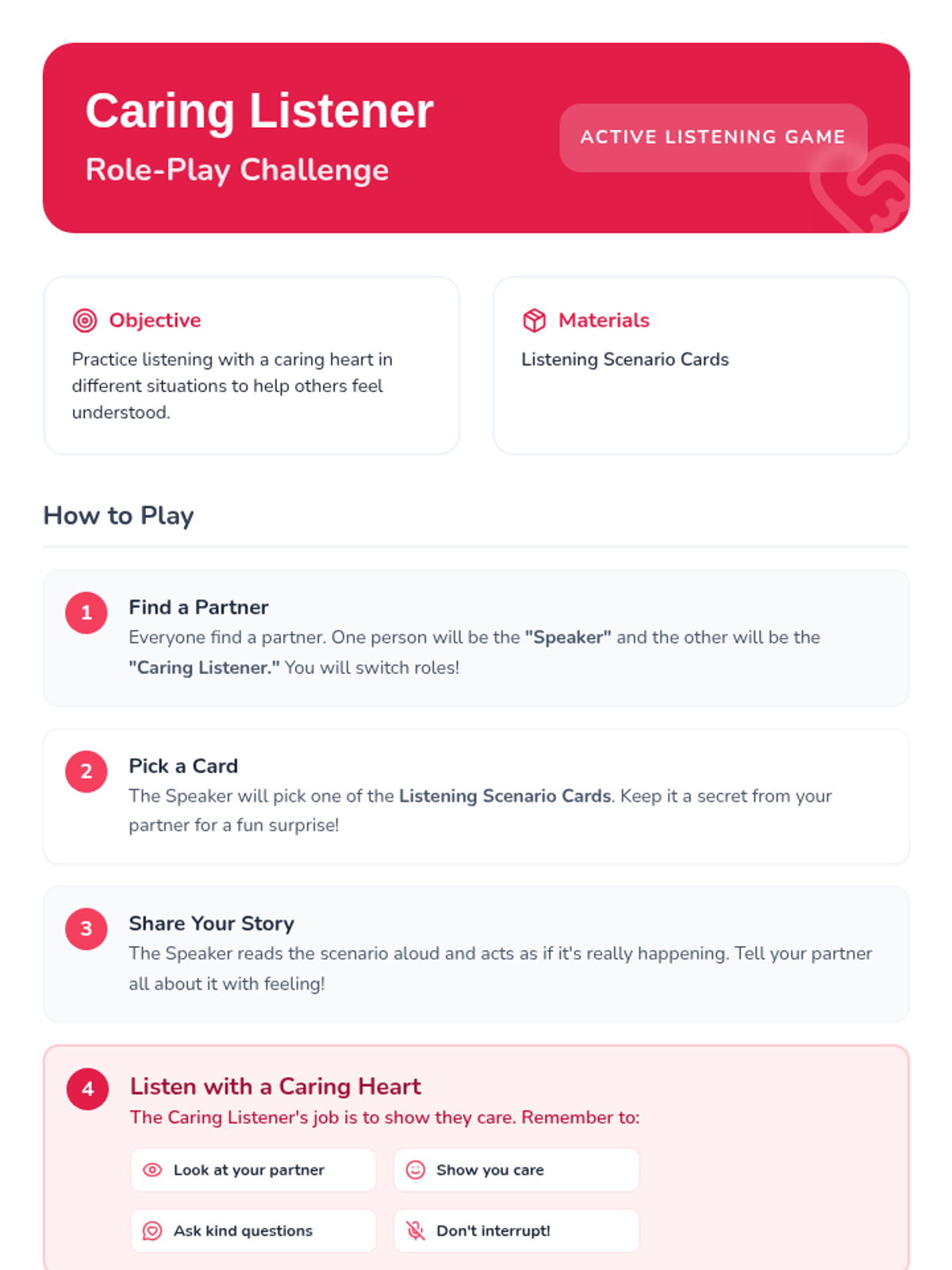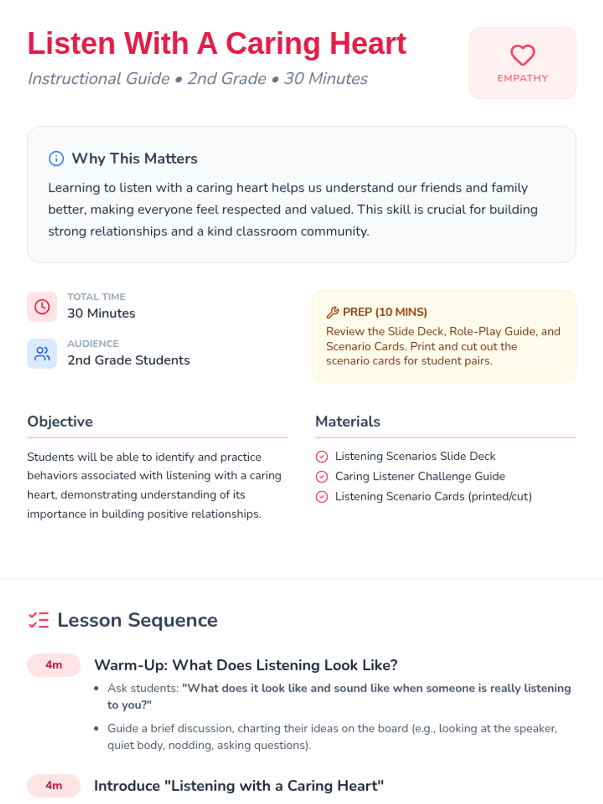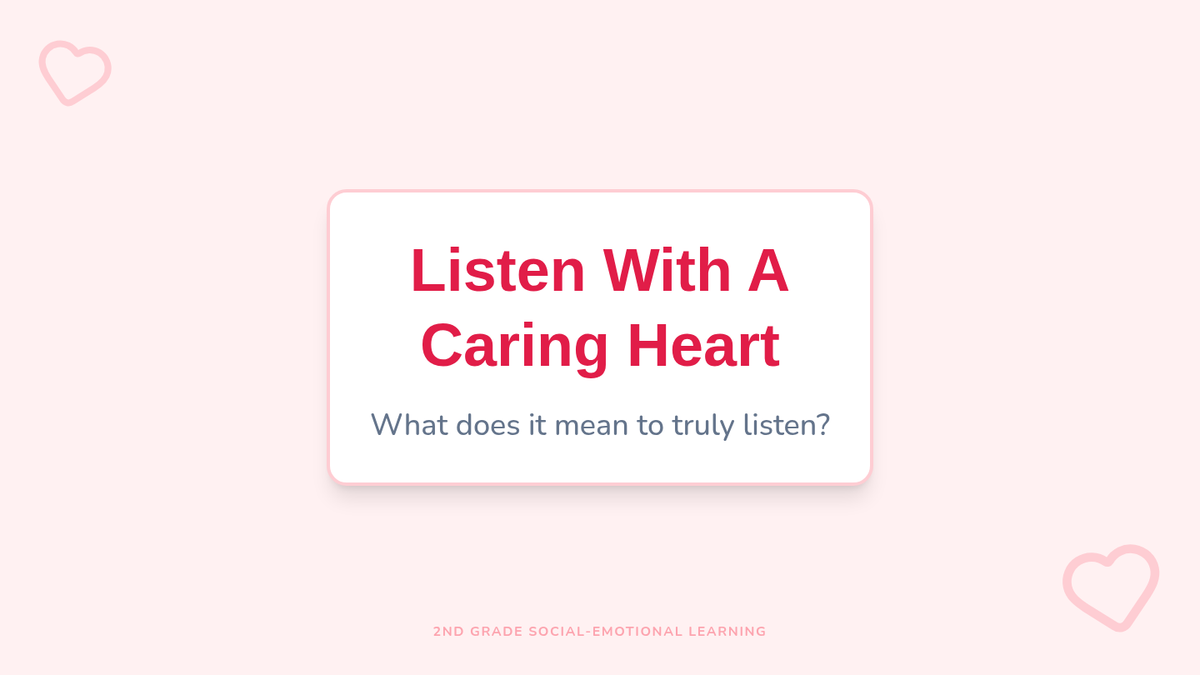 This lesson teaches 2nd-grade students the importance of active and empathetic listening through discussion, visual scenarios, and interactive role-play. Students will learn to use their ears, eyes, and hearts to build stronger relationships and a kinder classroom community.