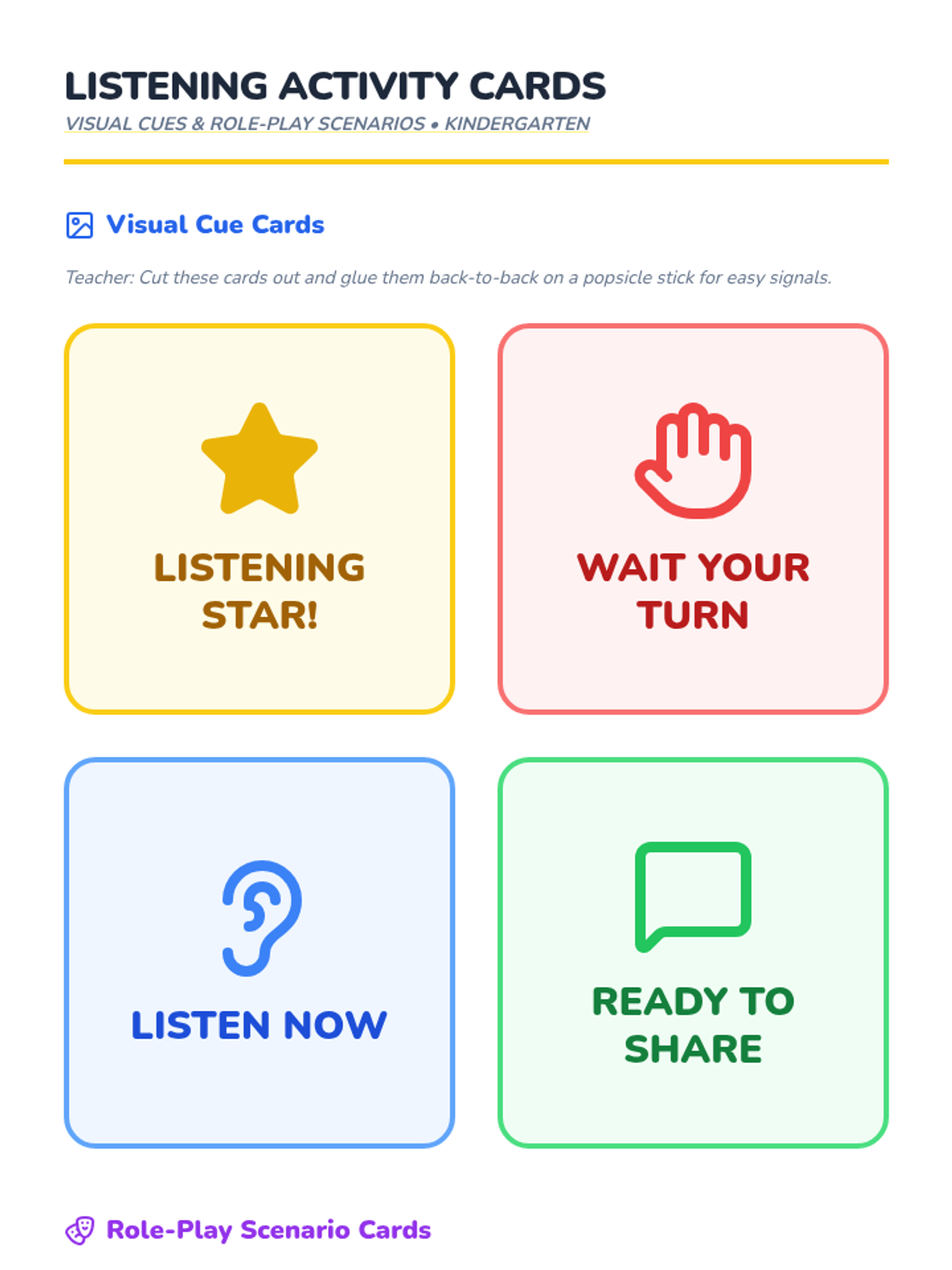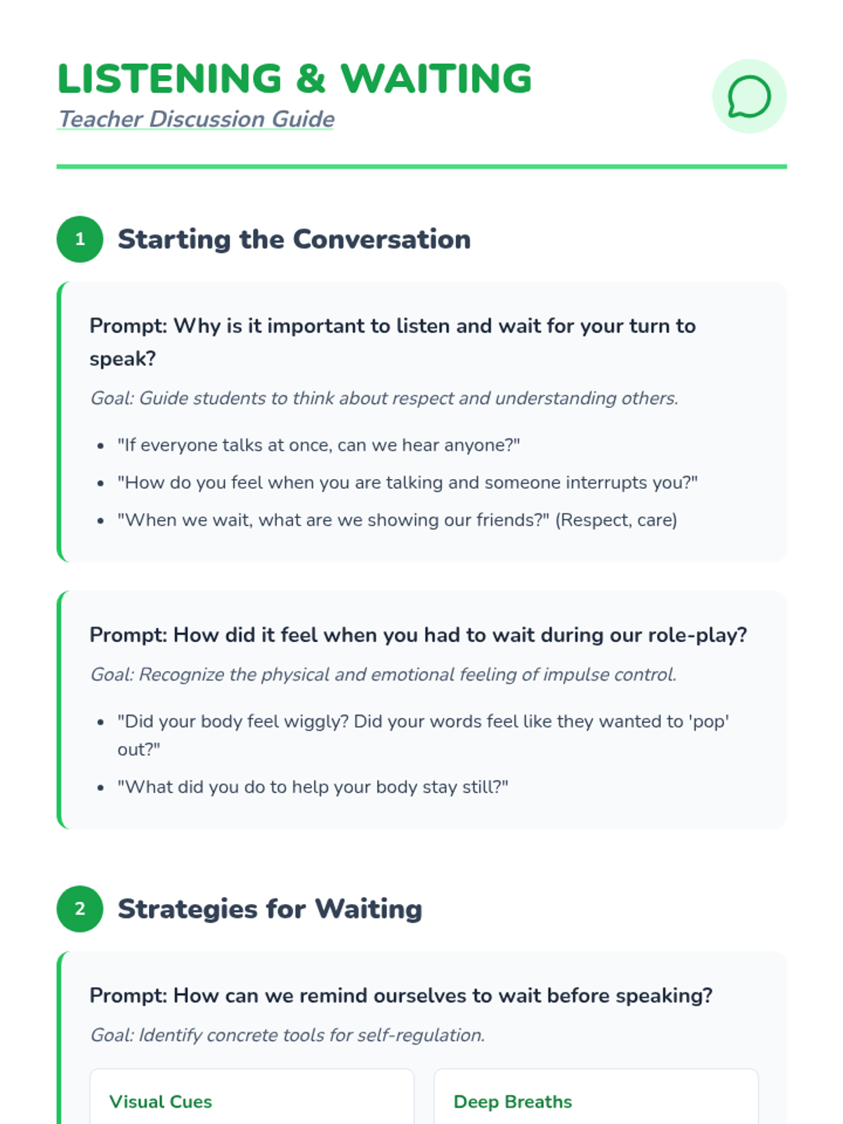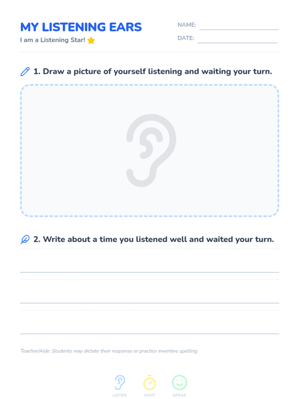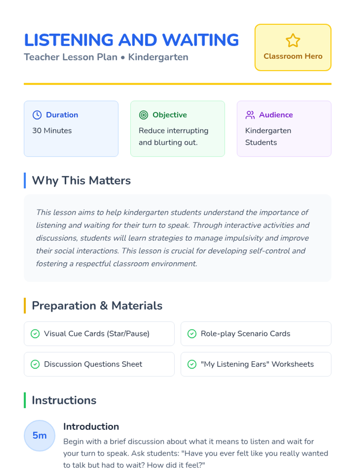 A Kindergarten lesson designed to help students master the art of listening and waiting their turn, using interactive role-plays and self-reflection activities.