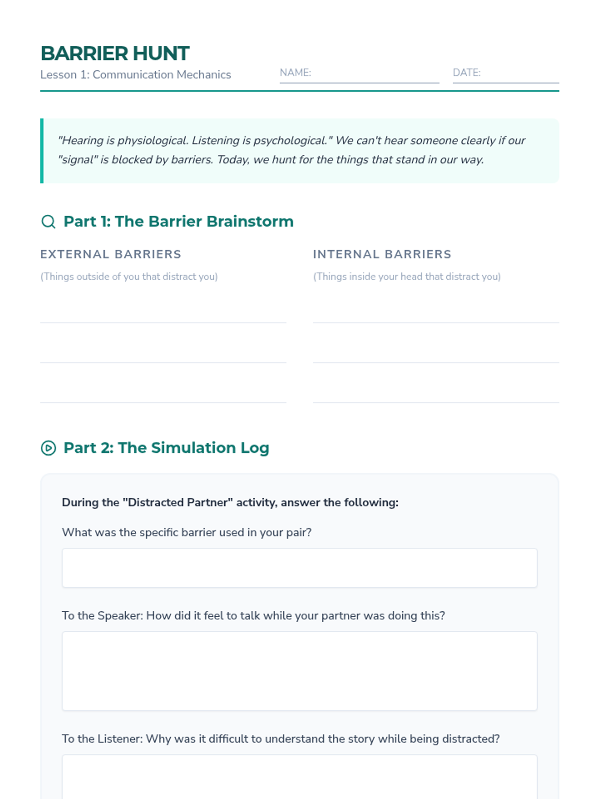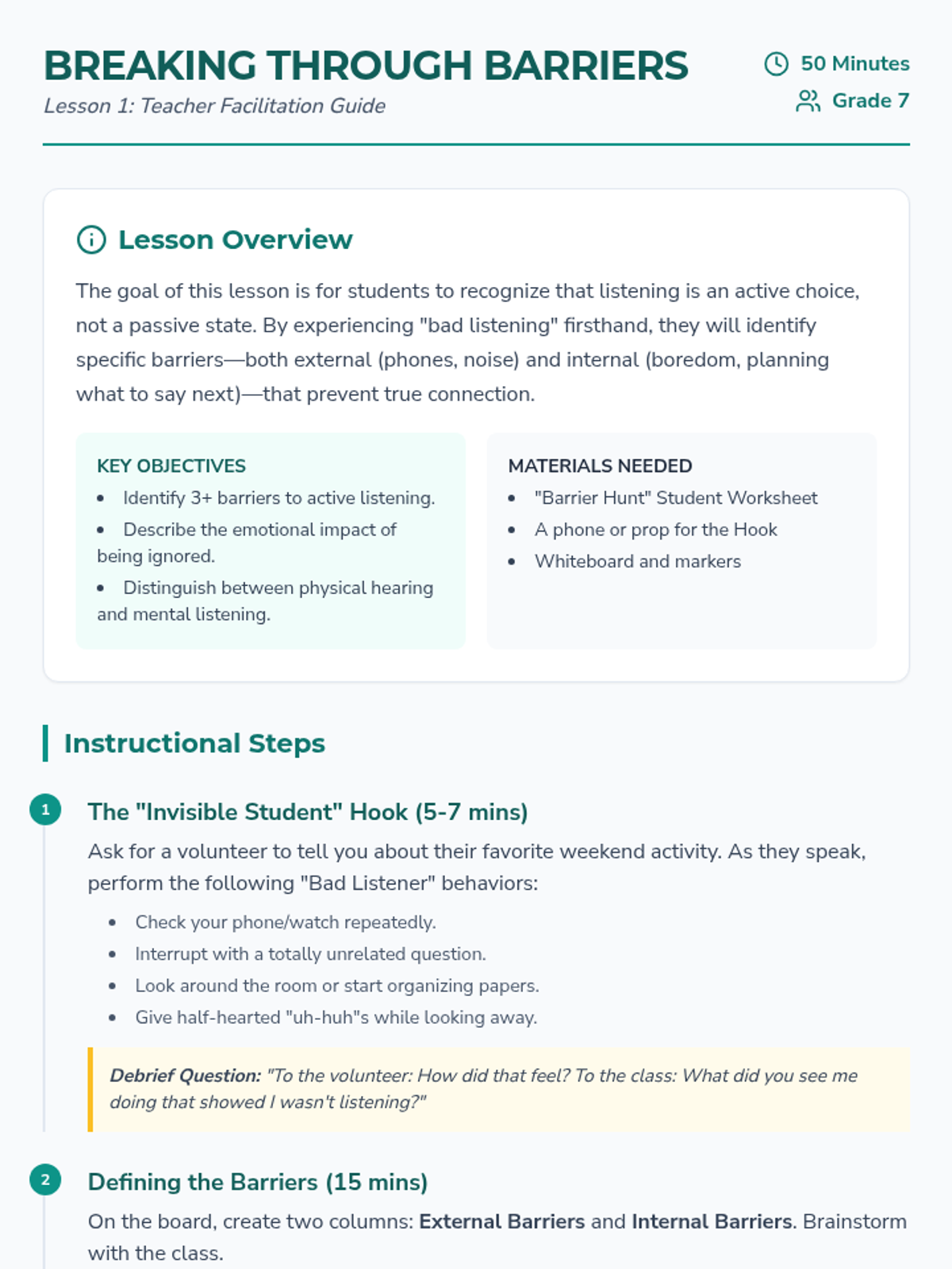 Students identify internal and external distractions that block communication and analyze the impact of distracted listening through role-play and discussion.